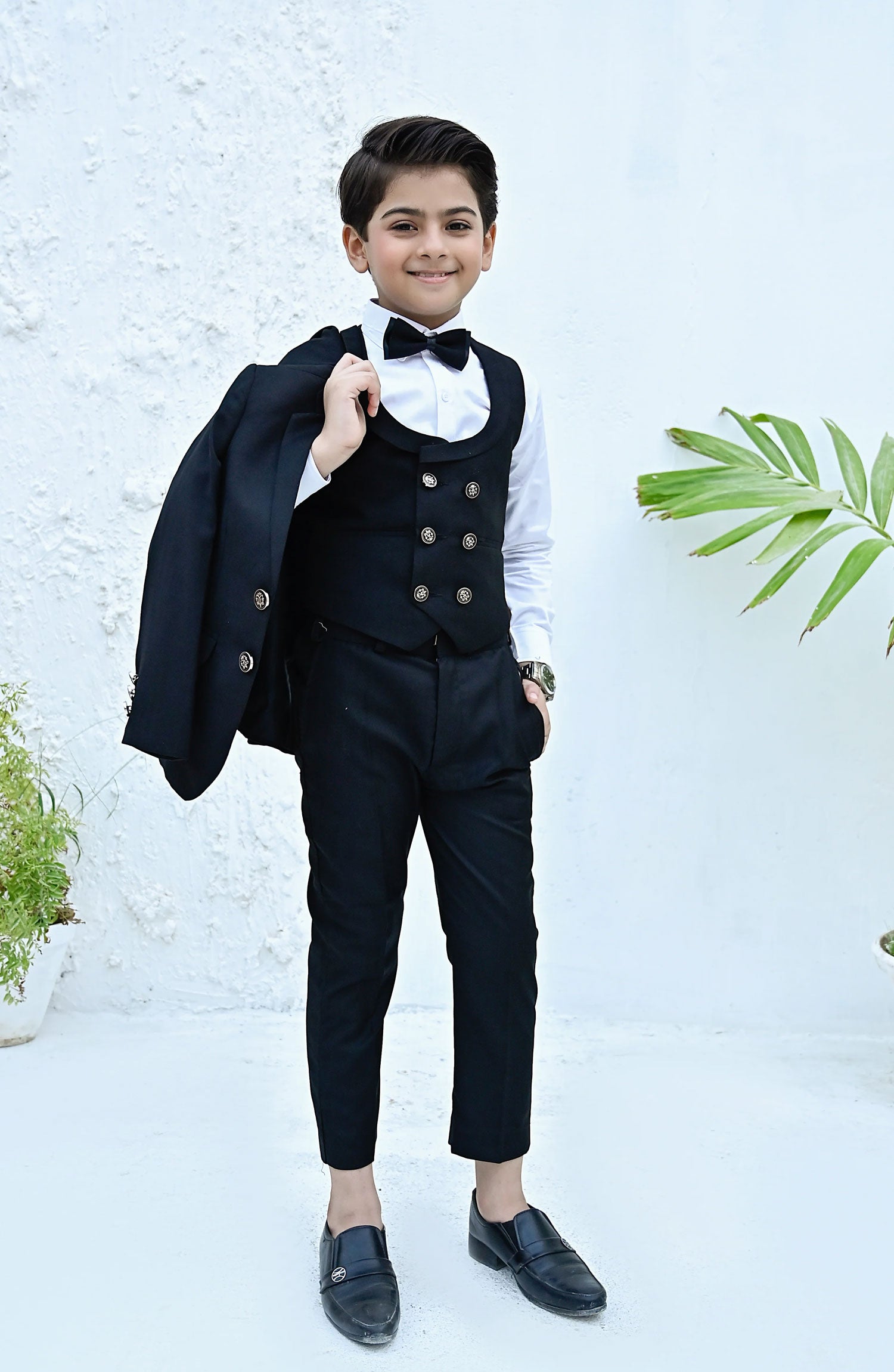 Includes (Black Coat+Black Waistcoat+Black Pant+White Shirt+Black Bow).
