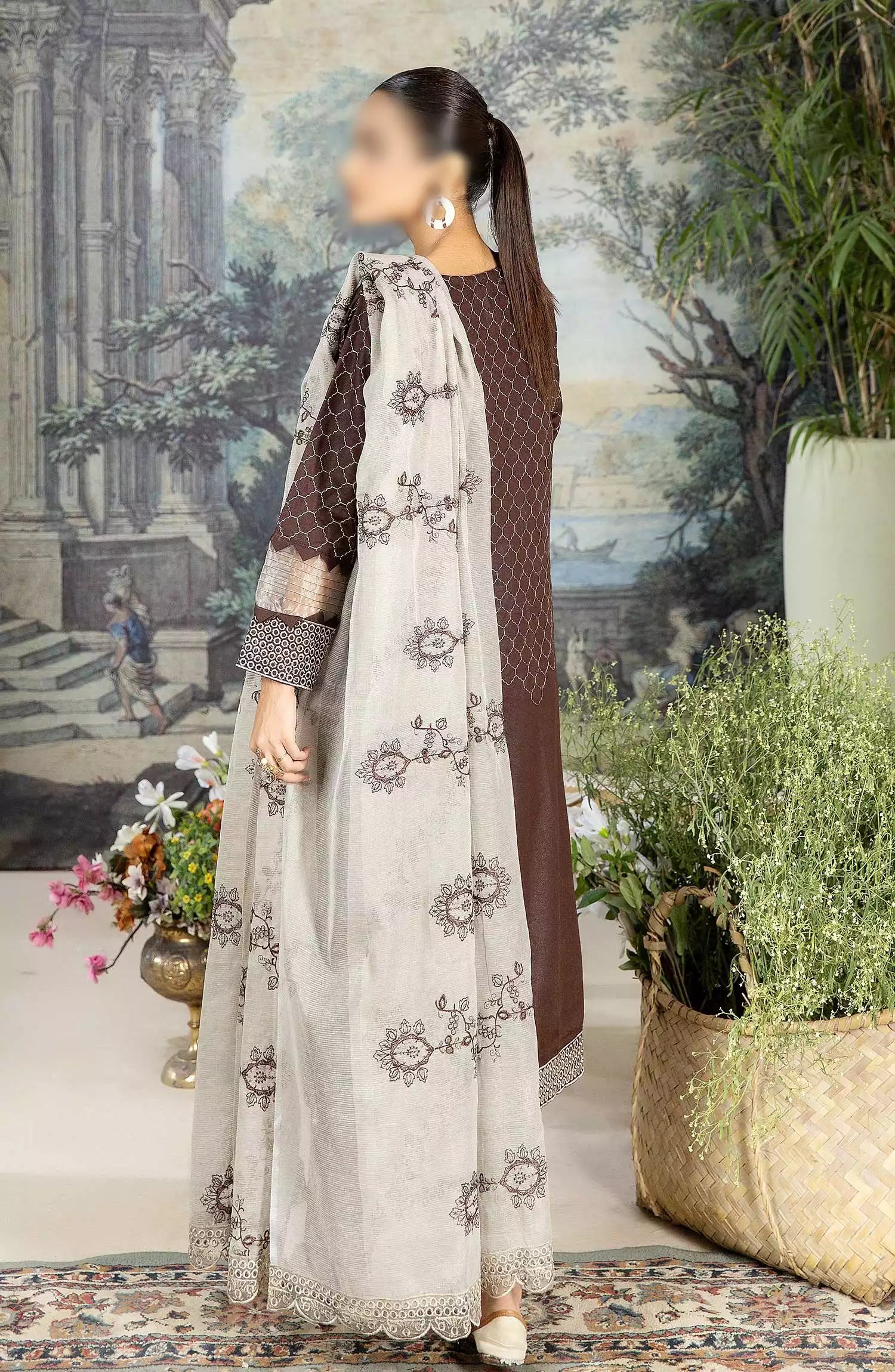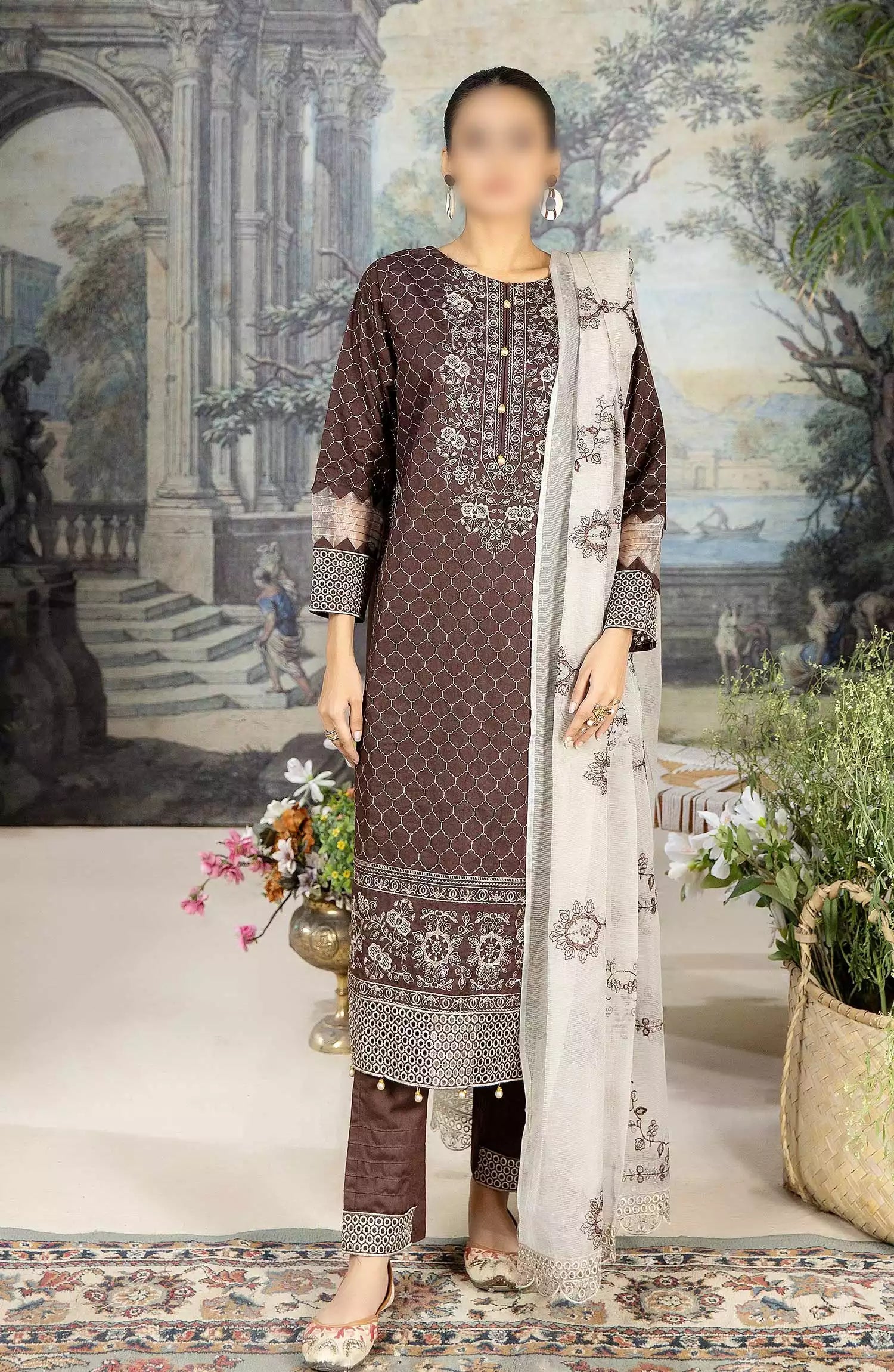 Exclusive Embroidered Karandi Collection by Marjjan has been styled in the image for photography and illustrative purposes.