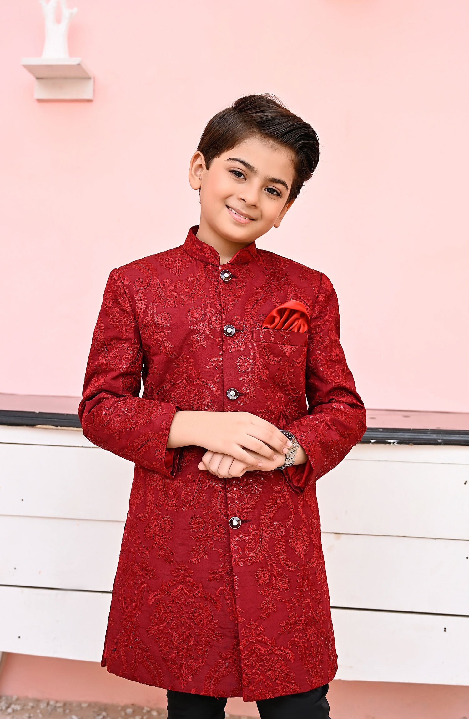 The sherwani is made up of a vibrant maroon Mysore fabric, which adds a bold and striking element to the outfit. Itâs designed with intricate embroidery, showcasing traditional patterns and motifs.
