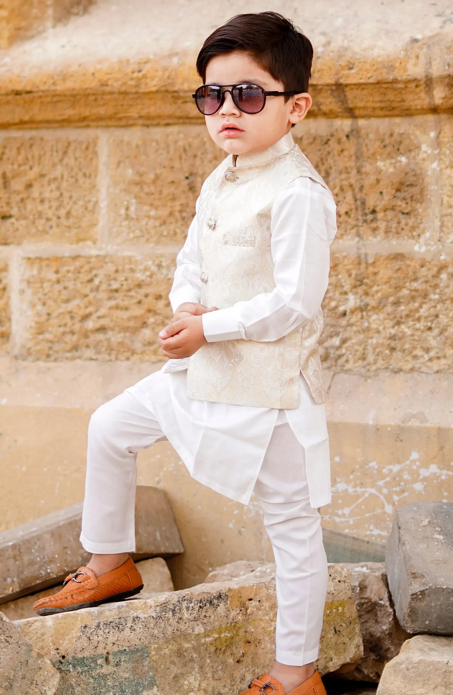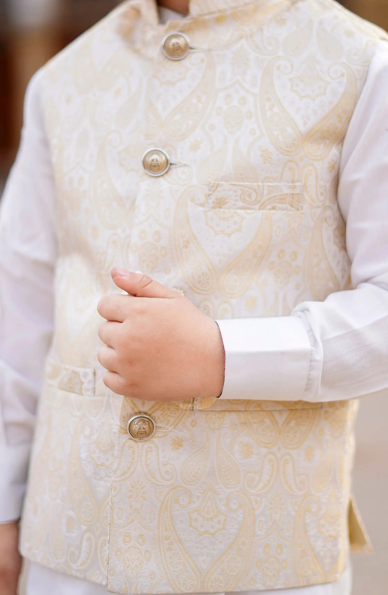 The white kurta adds a touch of elegance, while the jamawar golden waistcoat with its intricate detailing and shimmering fabric takes the outfit to another level.