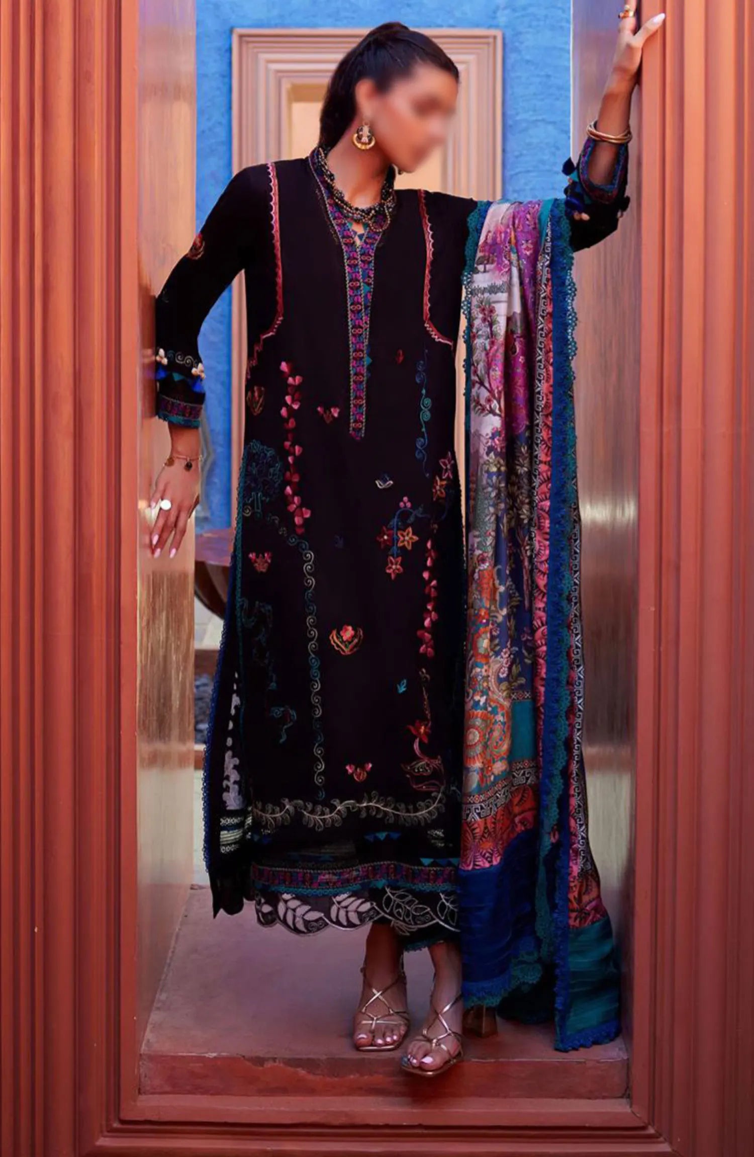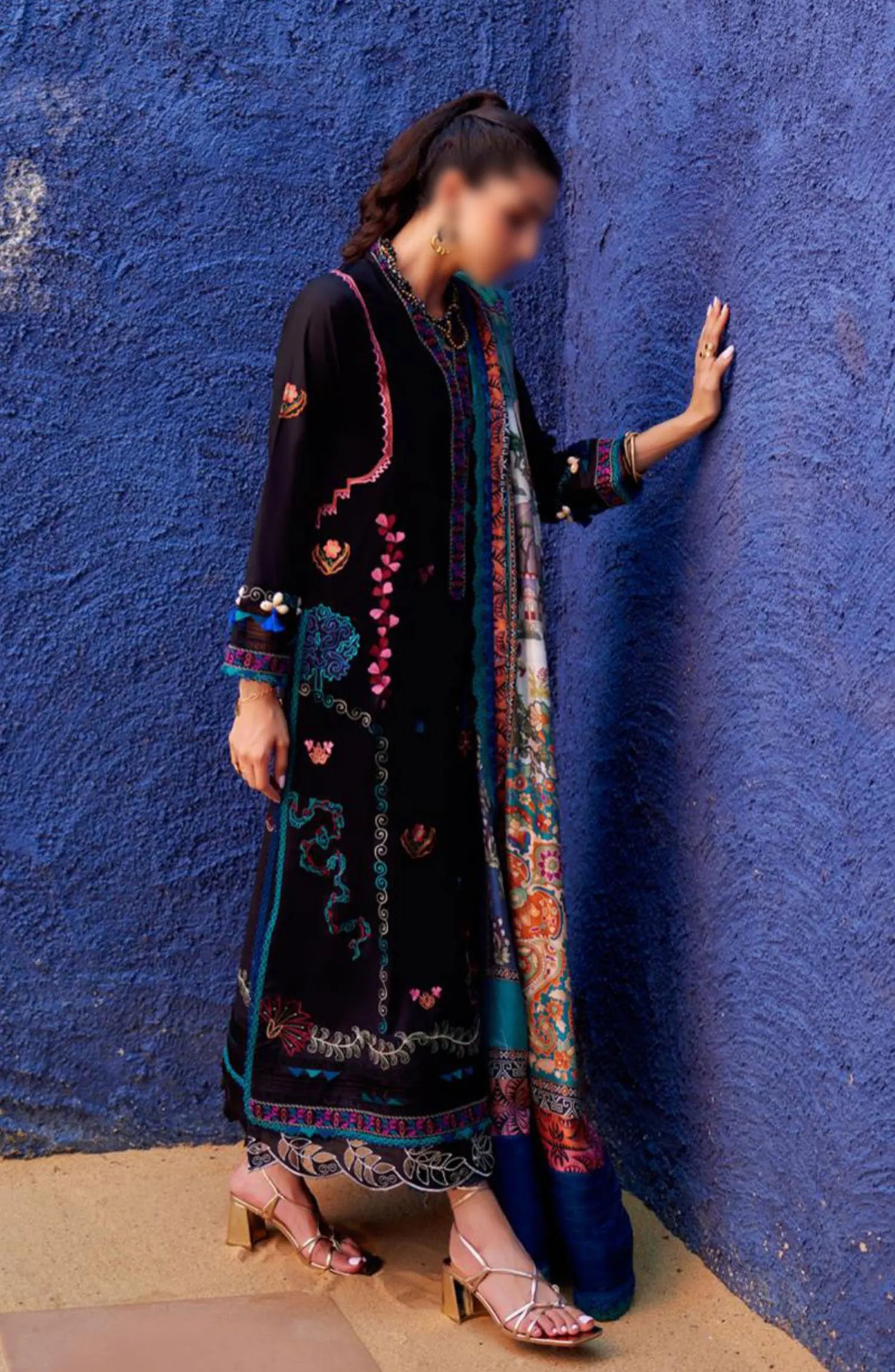 The standard style comes as a long-sleeved kameez with dupatta and trouser/shalwar.