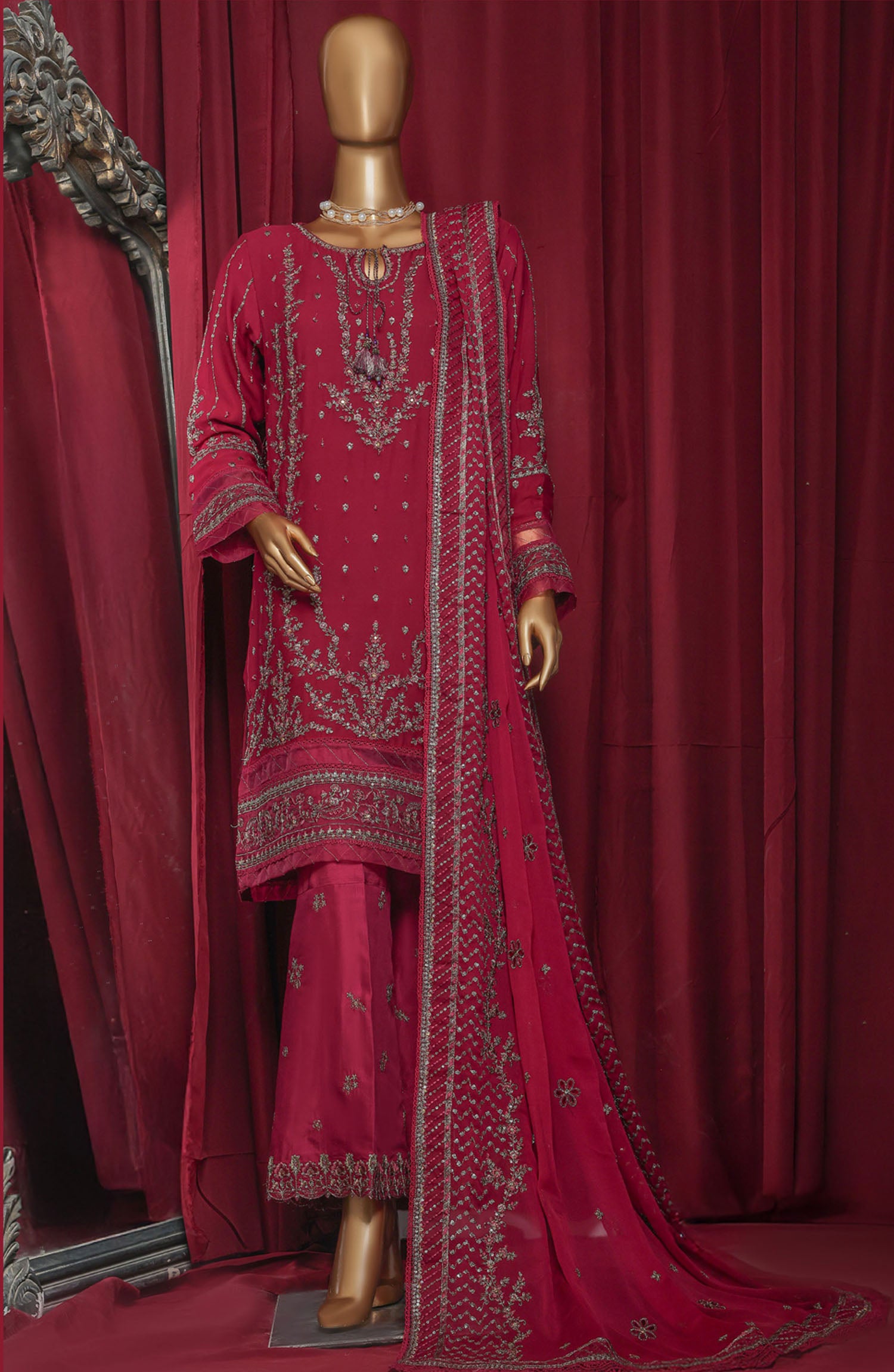 The standard style comes as a long-sleeved kameez with dupatta and trouser/shawlar.