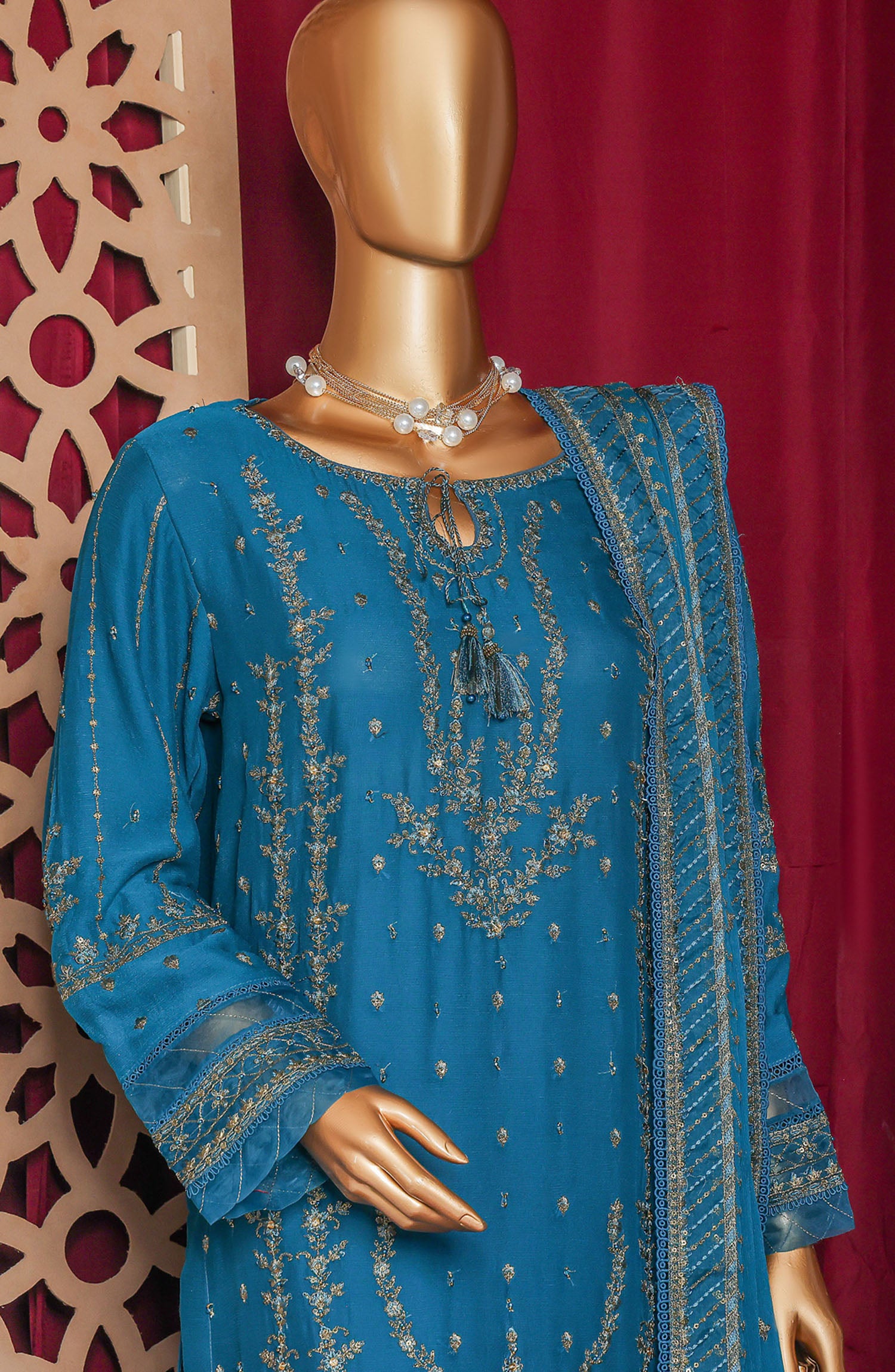 The standard style comes as a long-sleeved kameez with dupatta and trouser/shawlar.