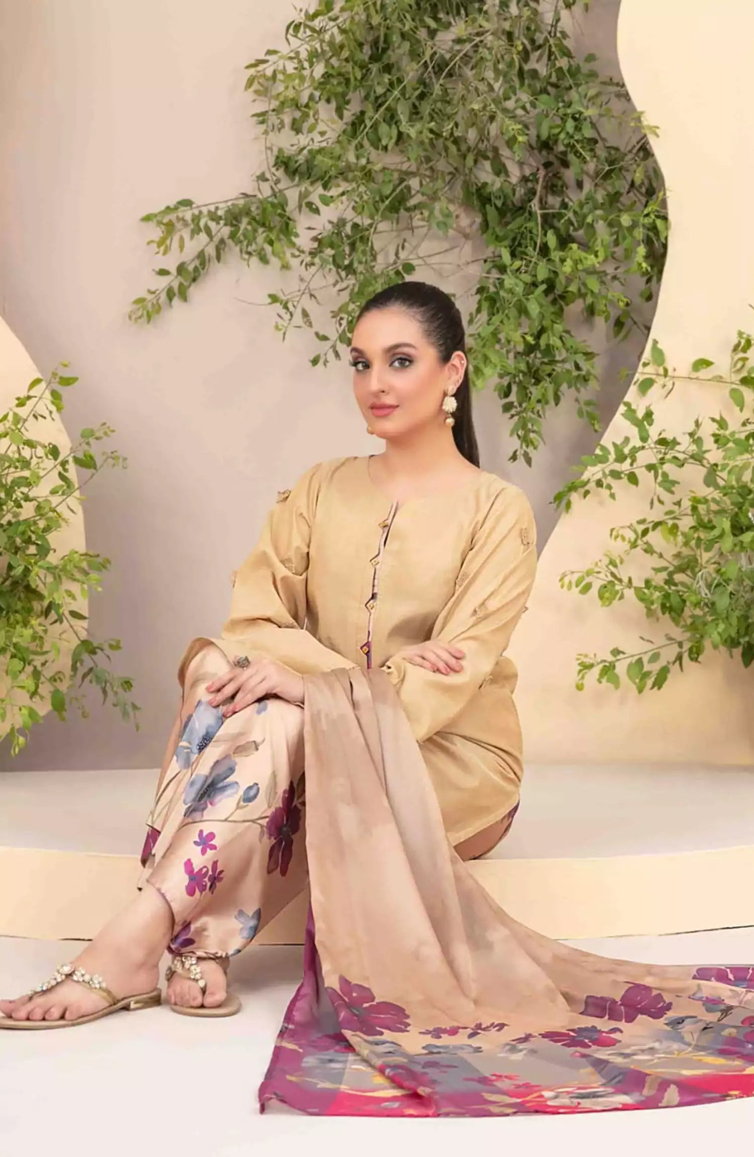 Ferda - Stitched Shamry with Digital Silk Dupatta Collection 2024 has been styled in the image for photography and illustrative purposes.