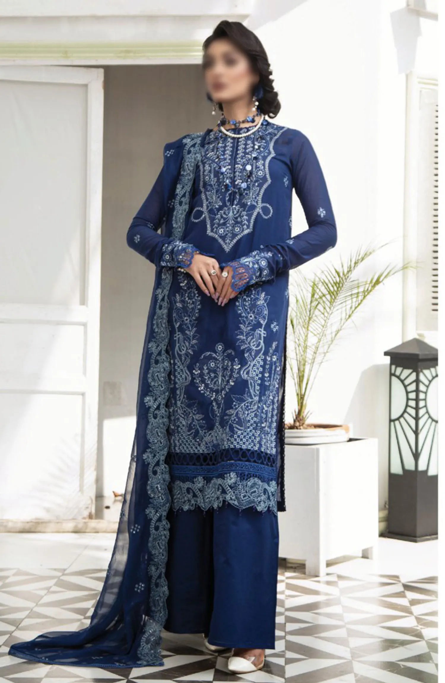 The standard style comes as a long-sleeved kameez with dupatta and trouser/shawlar.