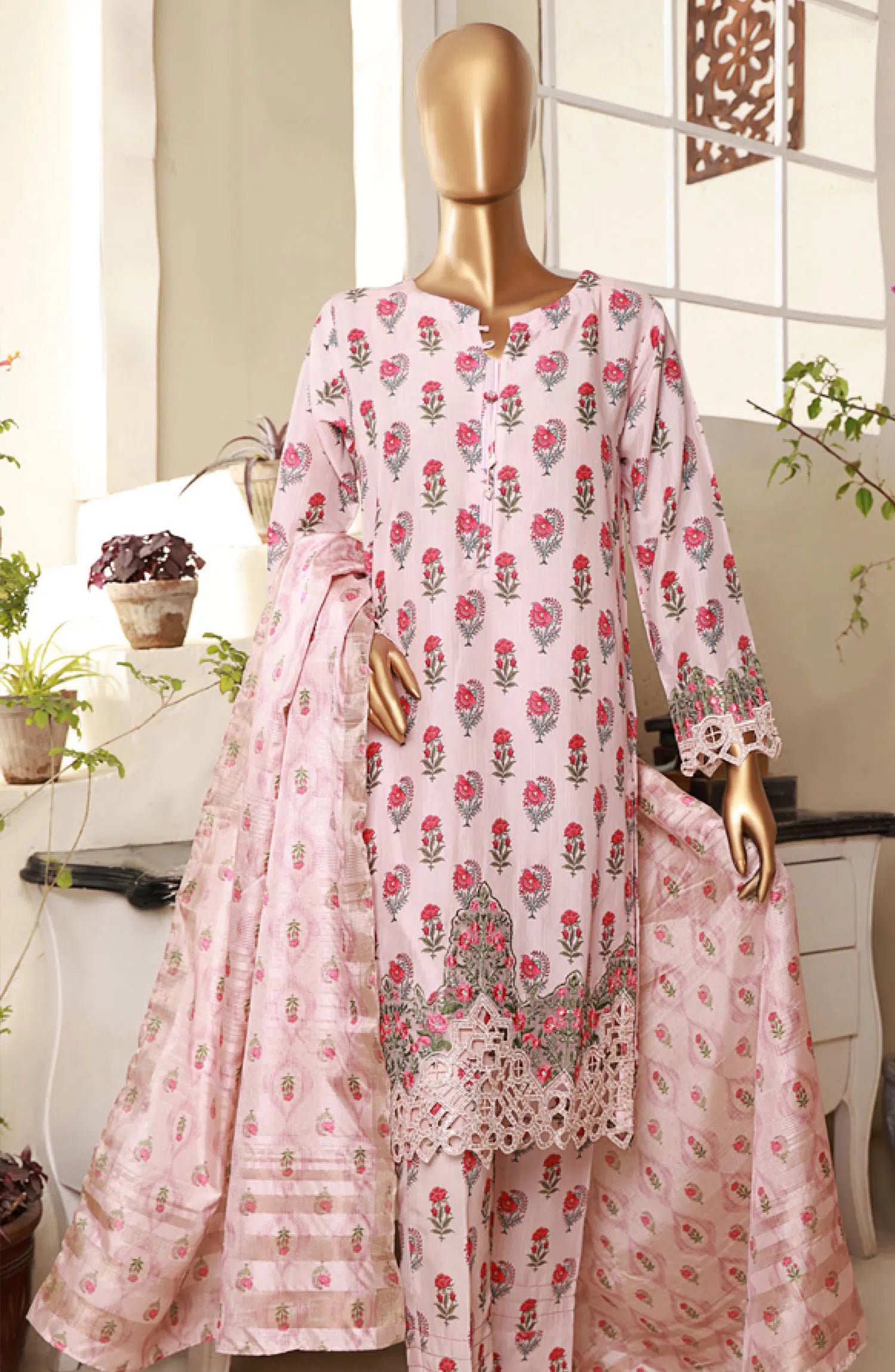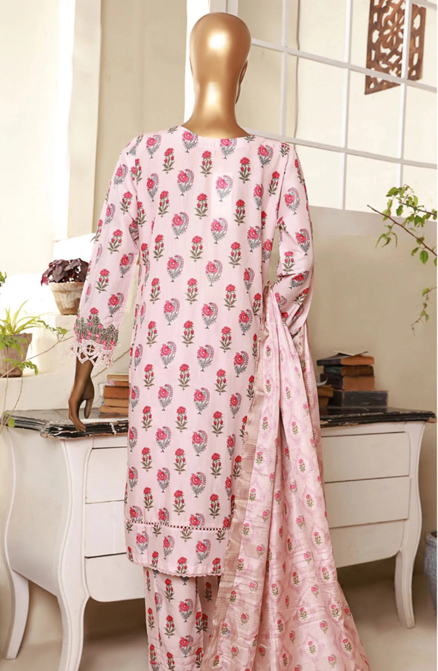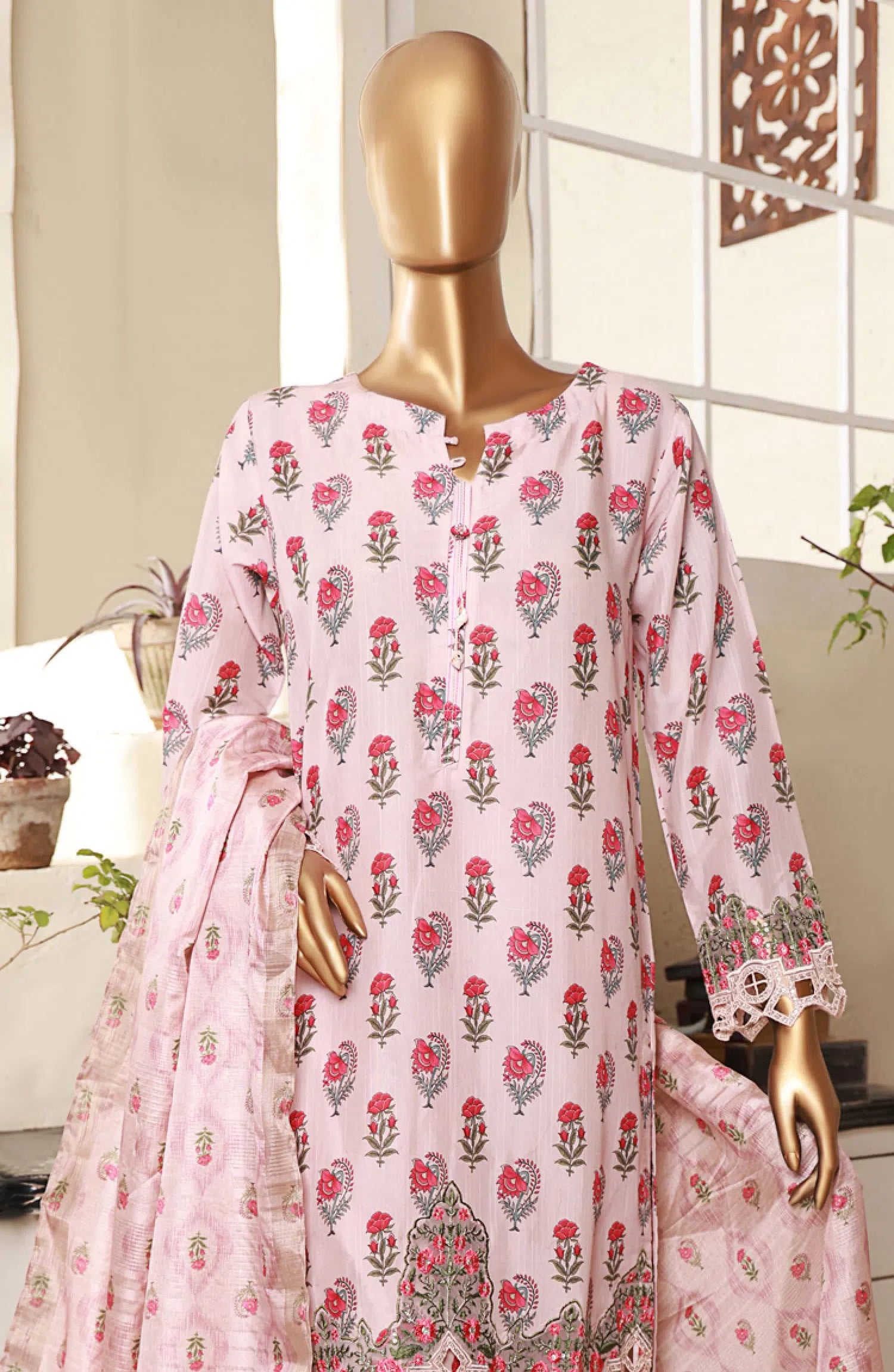 The standard style comes as a long-sleeved kameez with dupatta and trouser/shawlar.