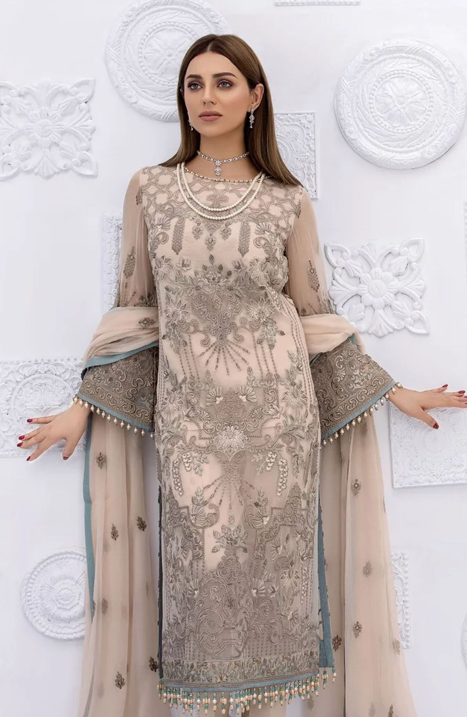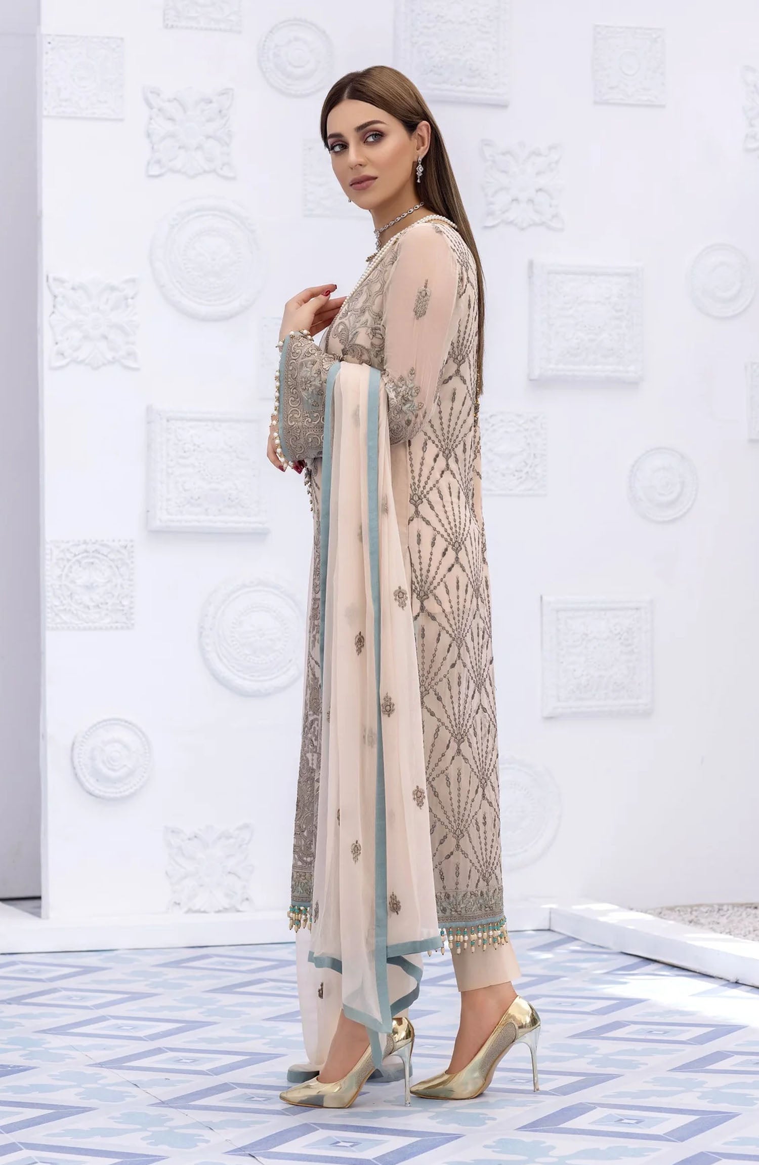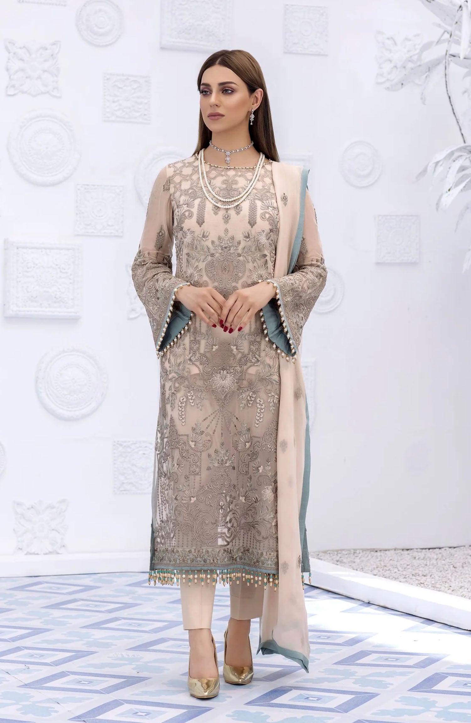The standard style comes as a long-sleeved kameez with dupatta and trouser/shawlar.