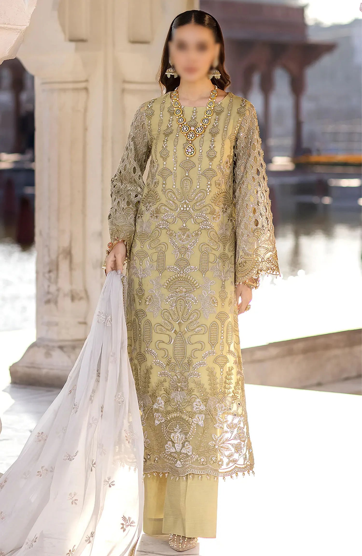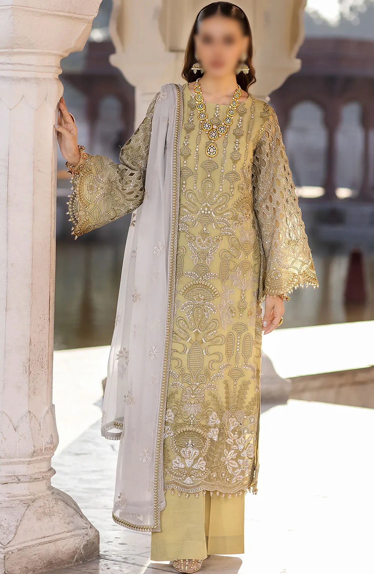 The standard style comes as a long-sleeved kameez with dupatta and trouser/shawlar.
