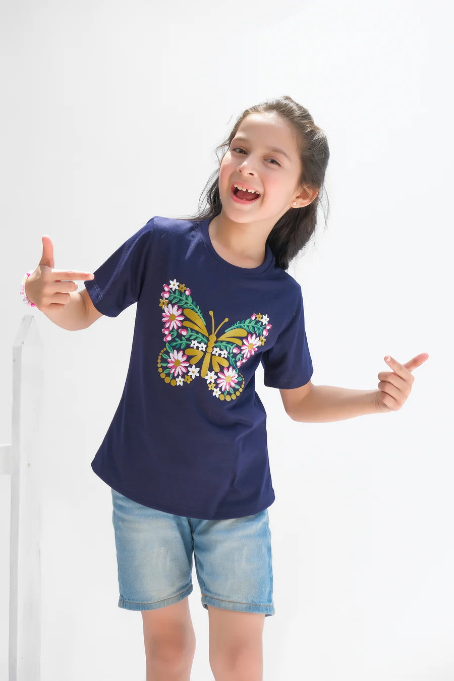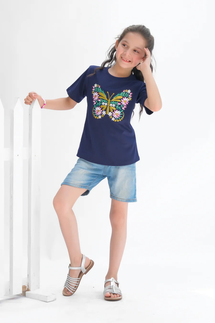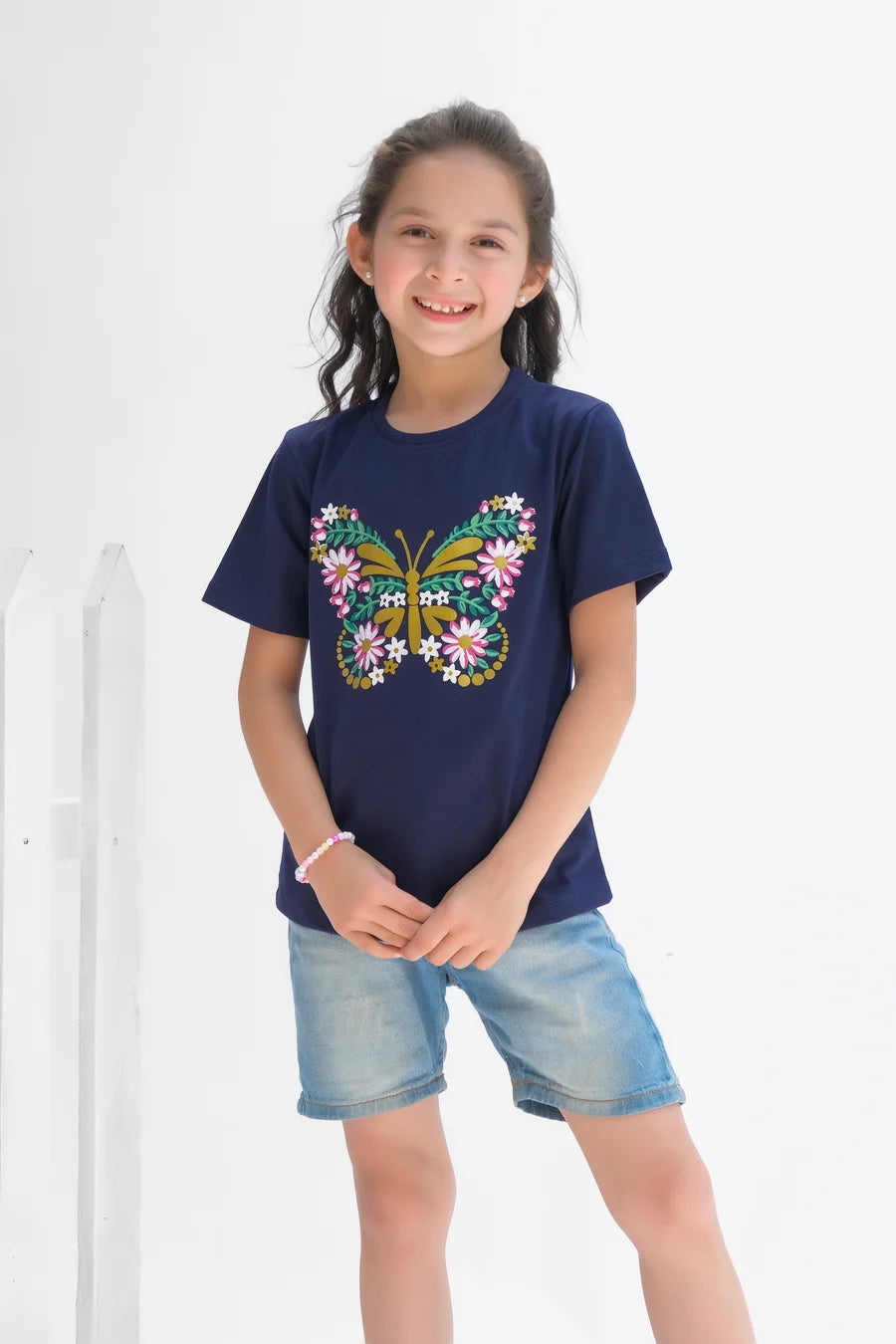 Flowers Pattern Butterfly Half Sleeves T-Shirts For Kids - Navy Blue