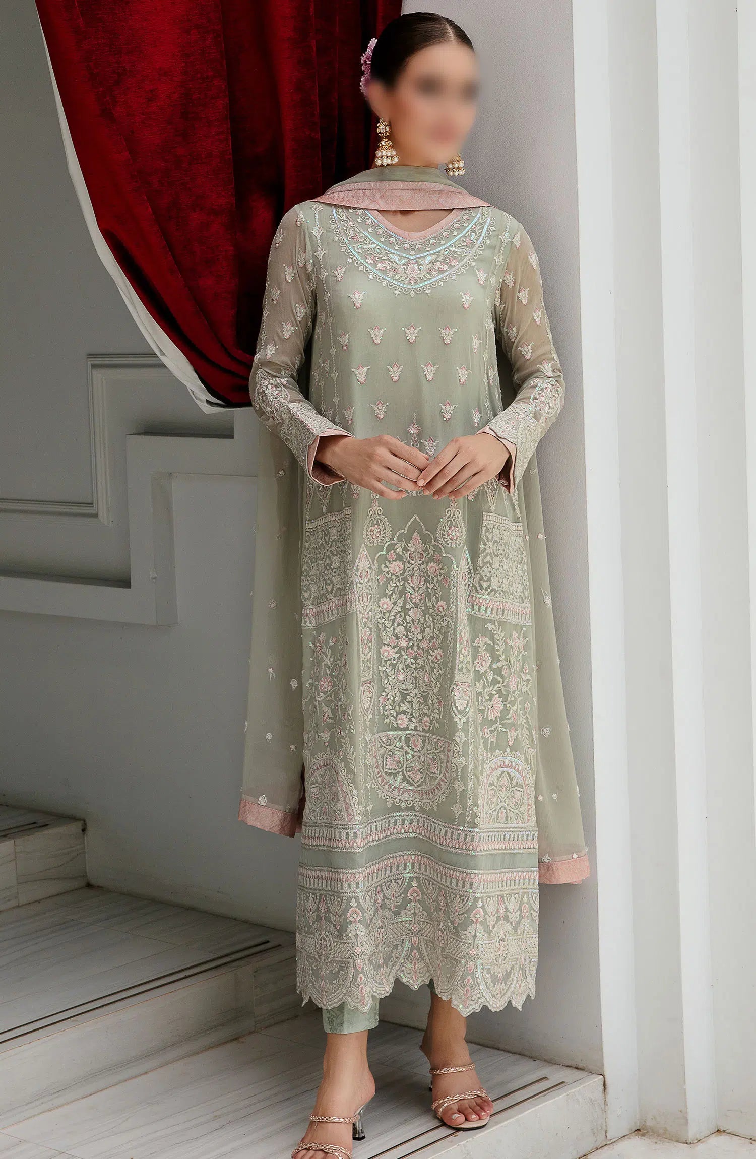 The standard style comes as a long-sleeved kameez with dupatta and trouser/shawlar.