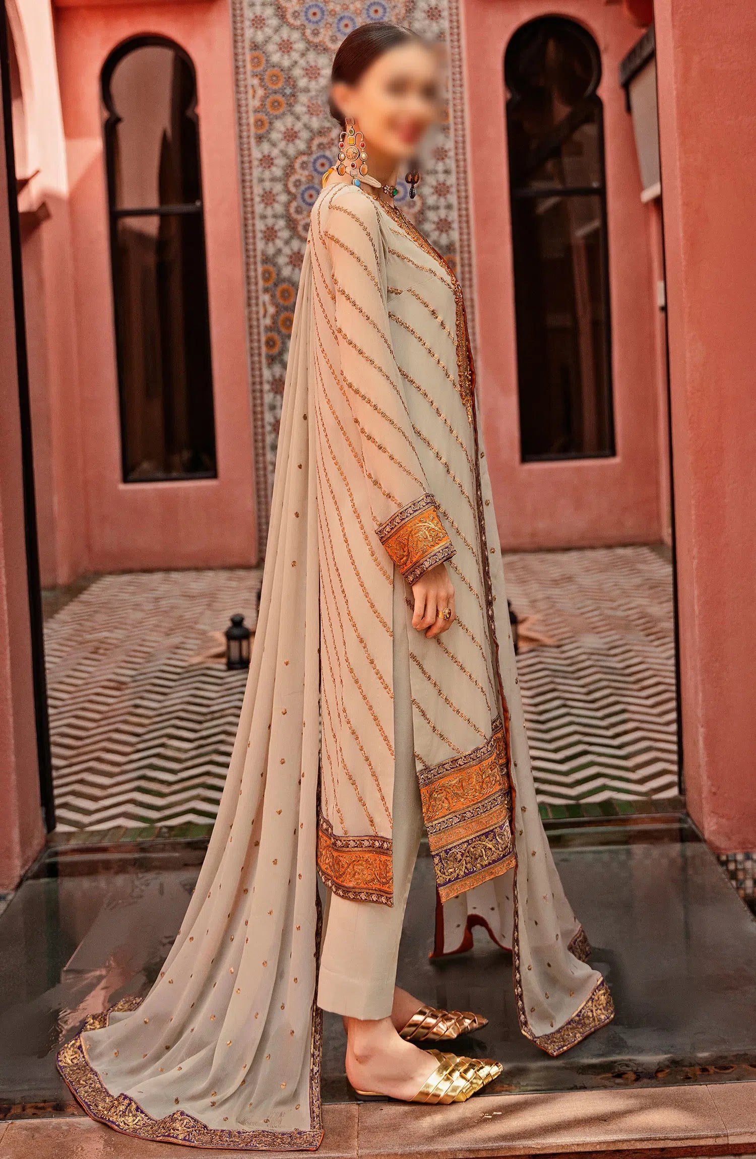The standard style comes as a long-sleeved kameez with dupatta and trouser/shawlar.