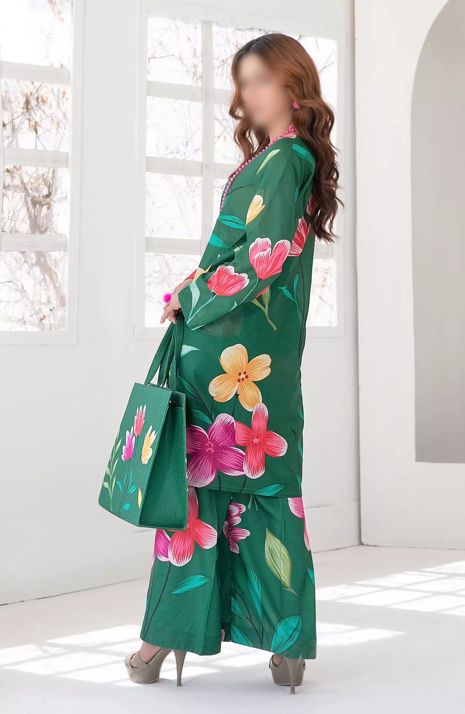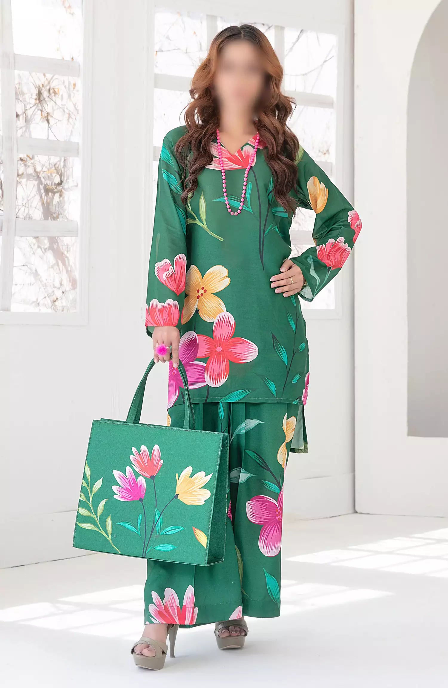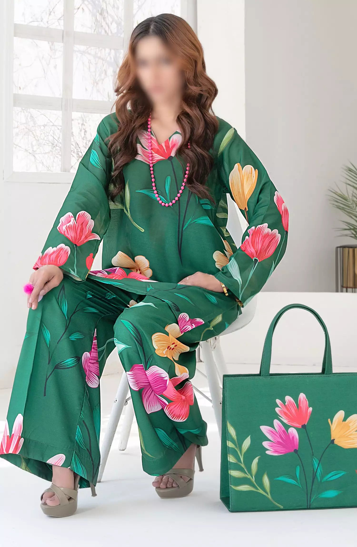 Swiss Digital Printed Stitched shirt with matching stitched trouser with Printed Handbag.