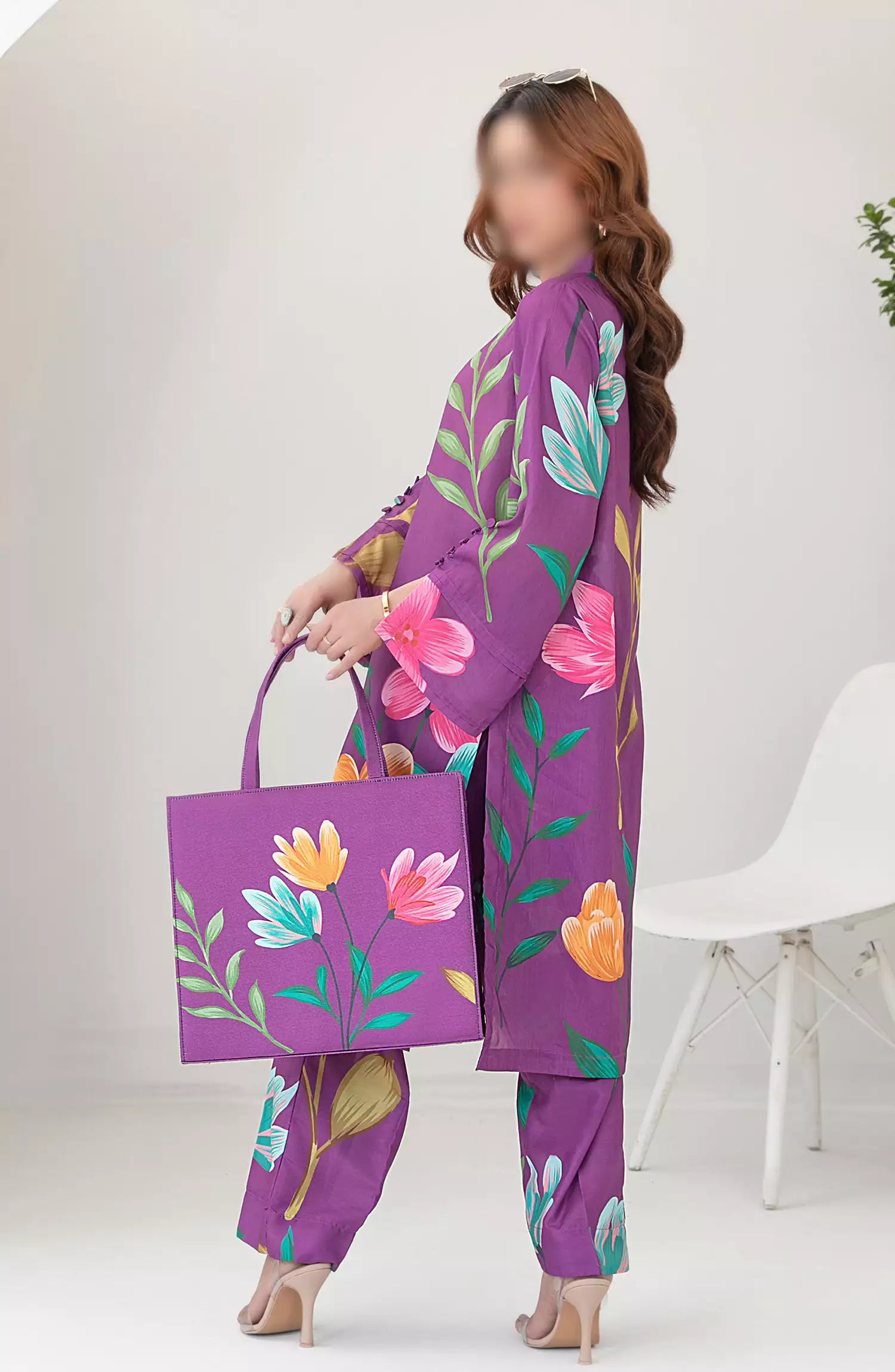 Swiss Digital Printed Stitched shirt with matching stitched trouser with Printed Handbag.