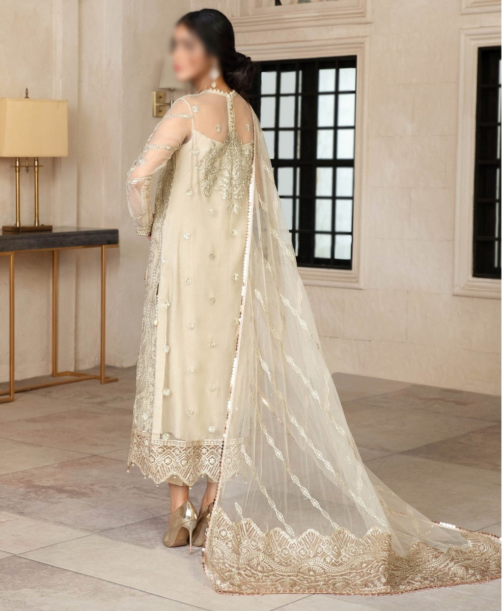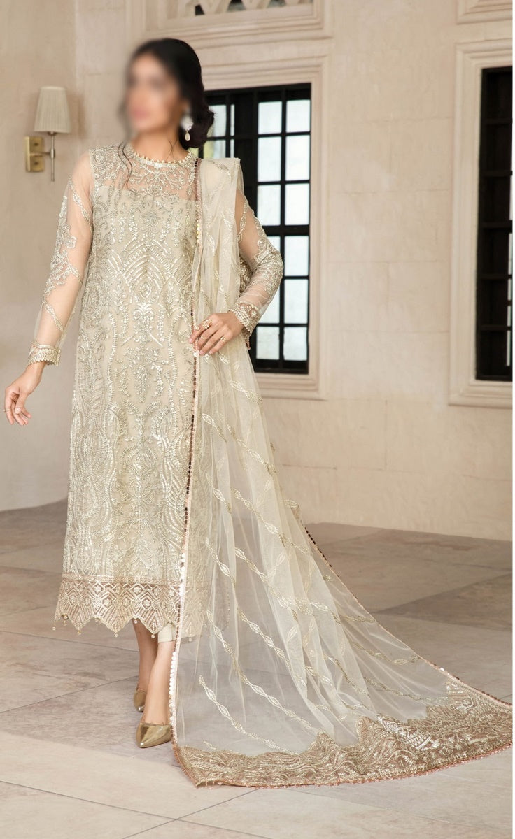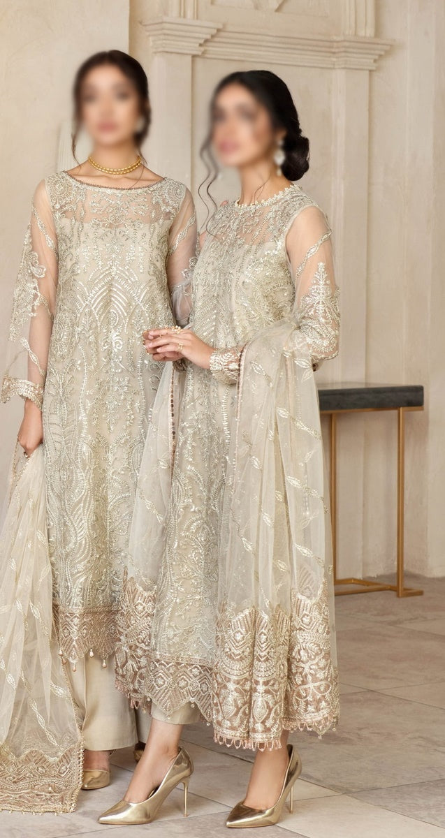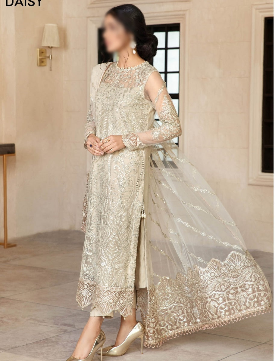 The standard style comes as a long-sleeved kameez with dupatta and trouser/shalwar.