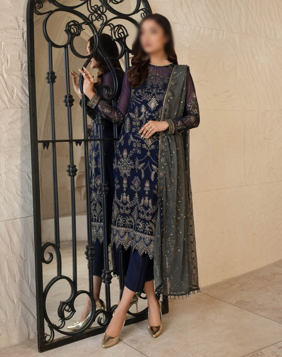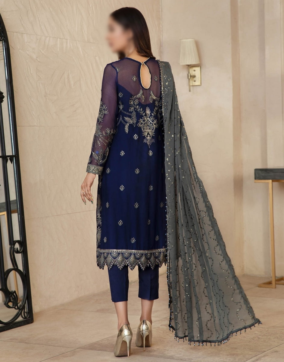 Amna Khadija Embroidered Crinkle Chiffon Unstitched 3 Piece Suit - D-03 - AM25LXC - Blue - Formals Collection