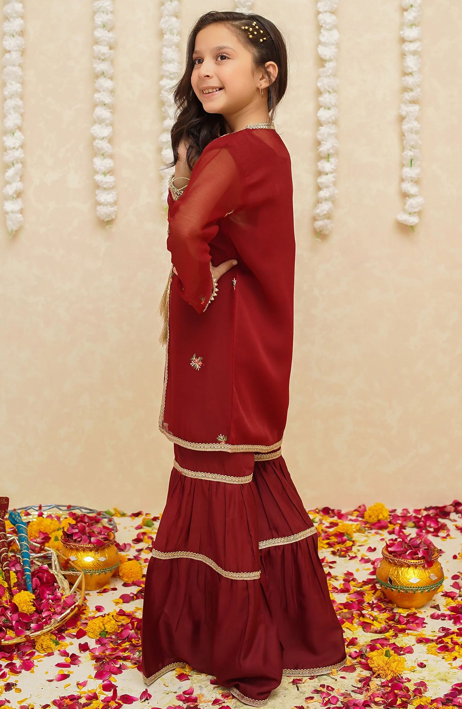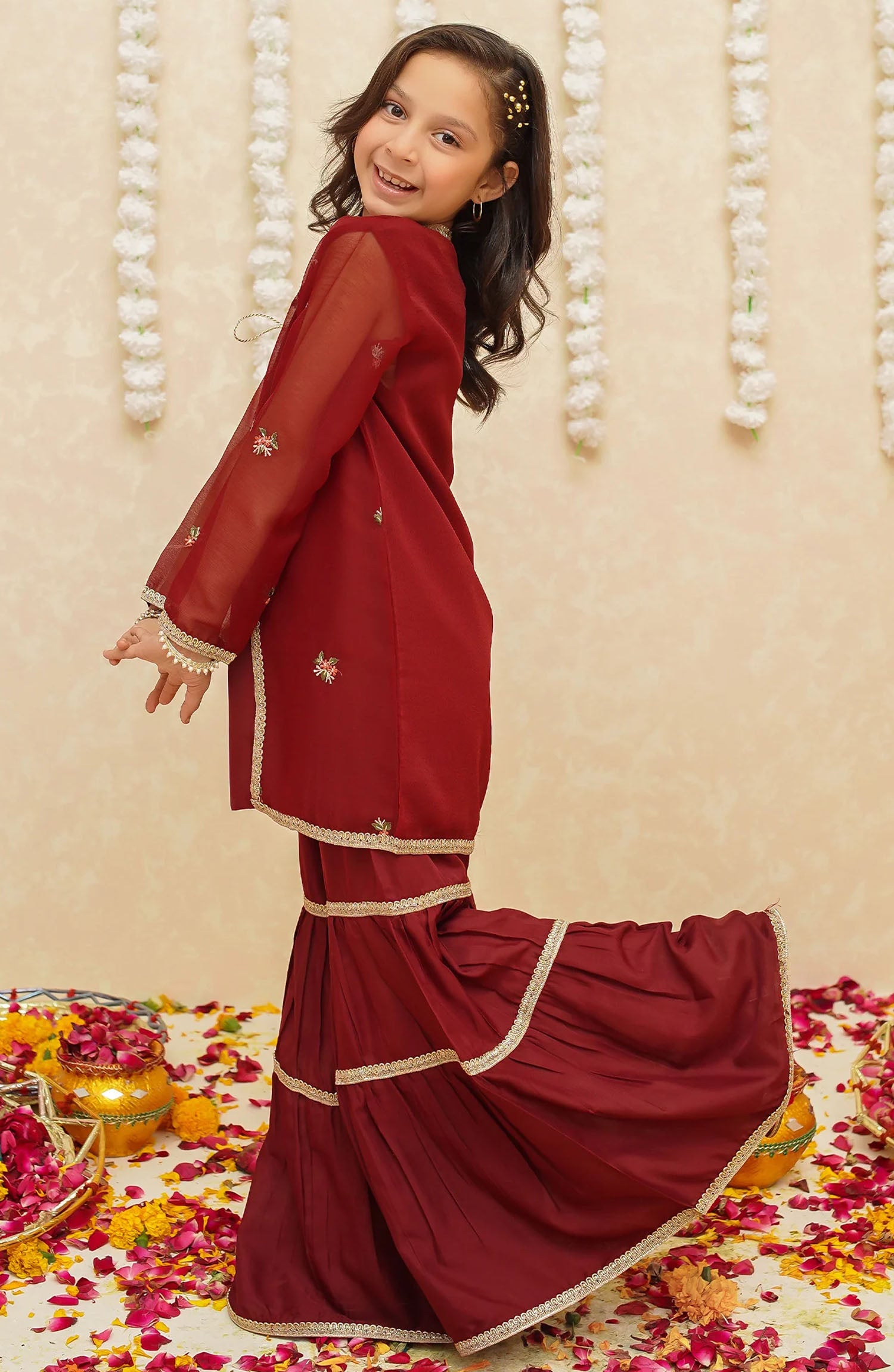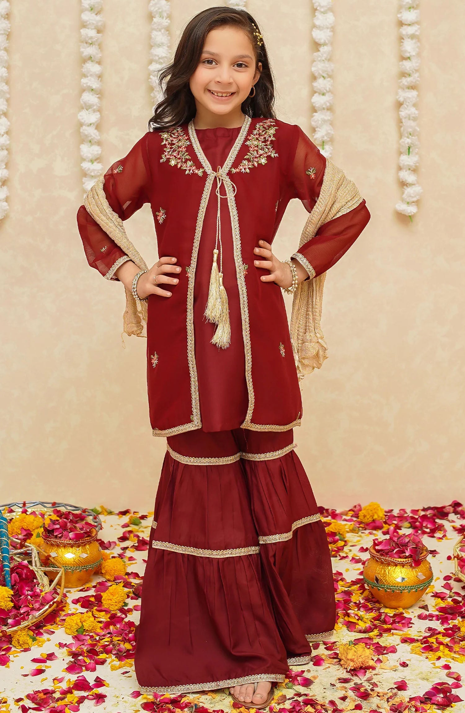 "This stunning Chiffon shrug/coat style shirt is beautifully designed, offering a perfect blend of tradition and elegance. Paired with a graceful gharara, itâ¬â¢s an ideal choice for festive events and celebrations.