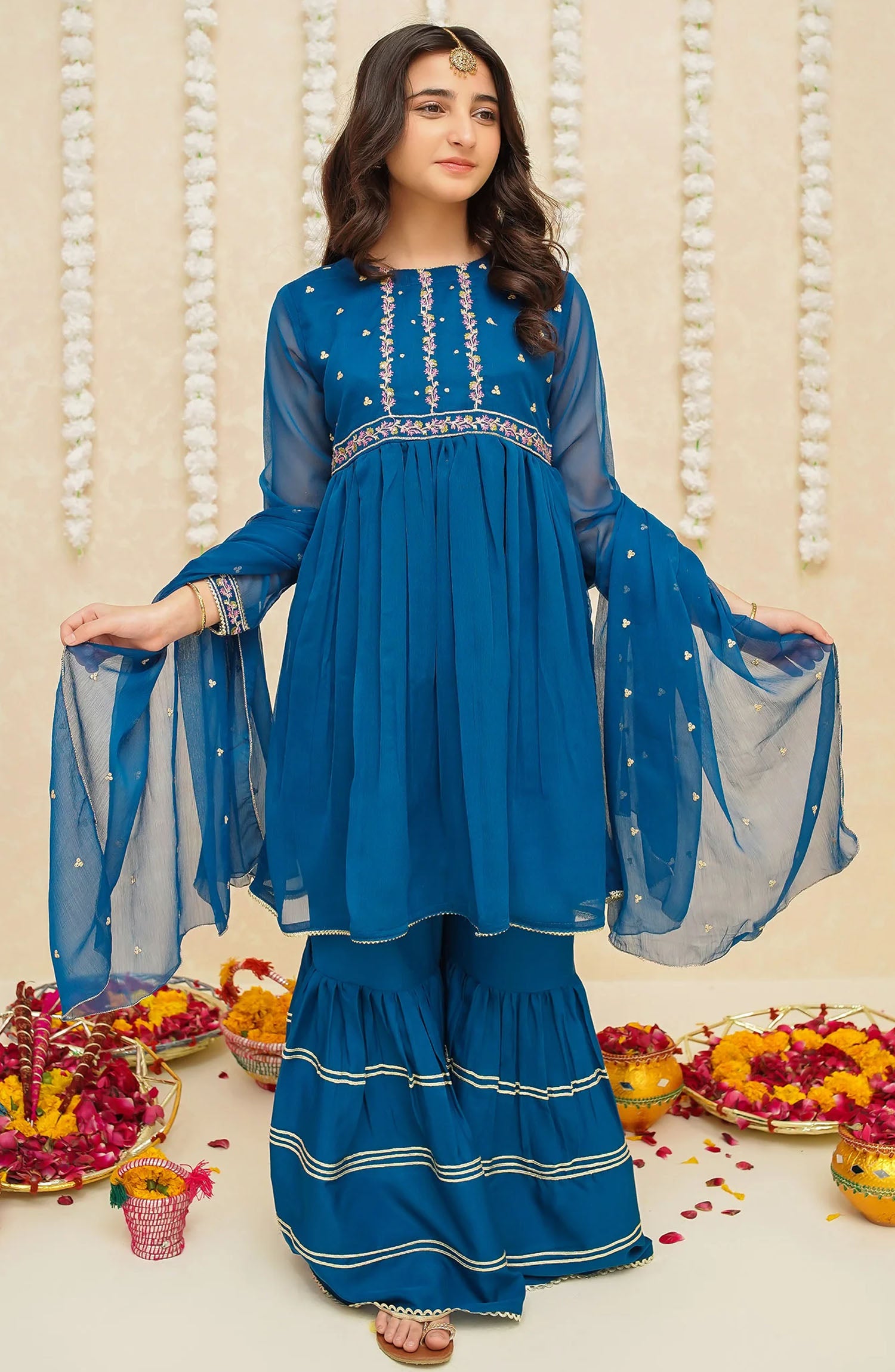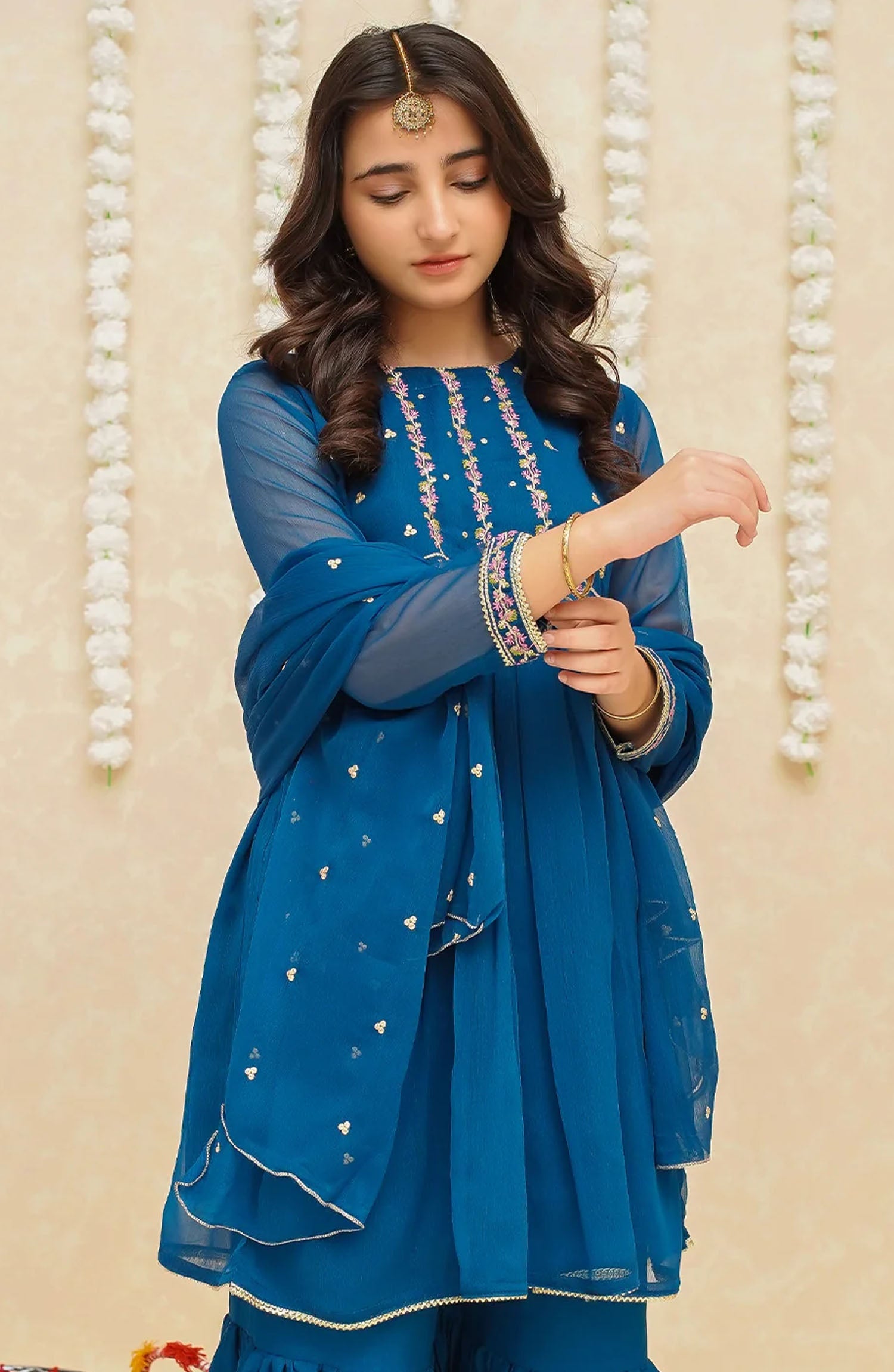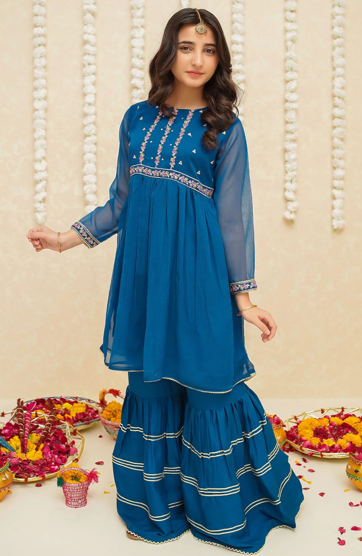 "This beautiful blue peplum features embroidered neck work detailing. Paired with a gharara, it's a perfect pick for festive occasions and celebrations.