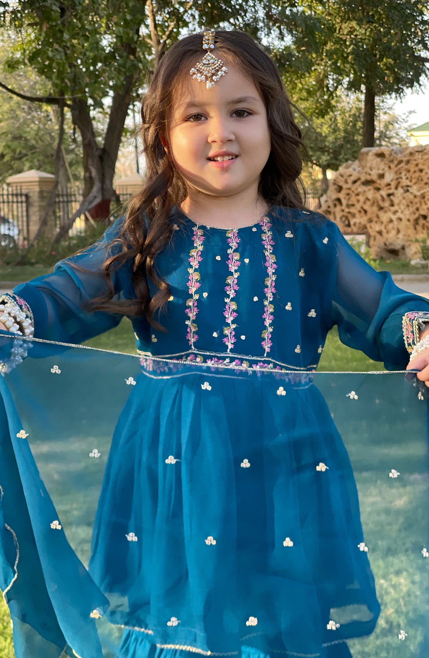 This beautiful blue peplum features embroidered neck work detailing. Paired with a gharara, it's a perfect pick for festive occasions and celebrations.