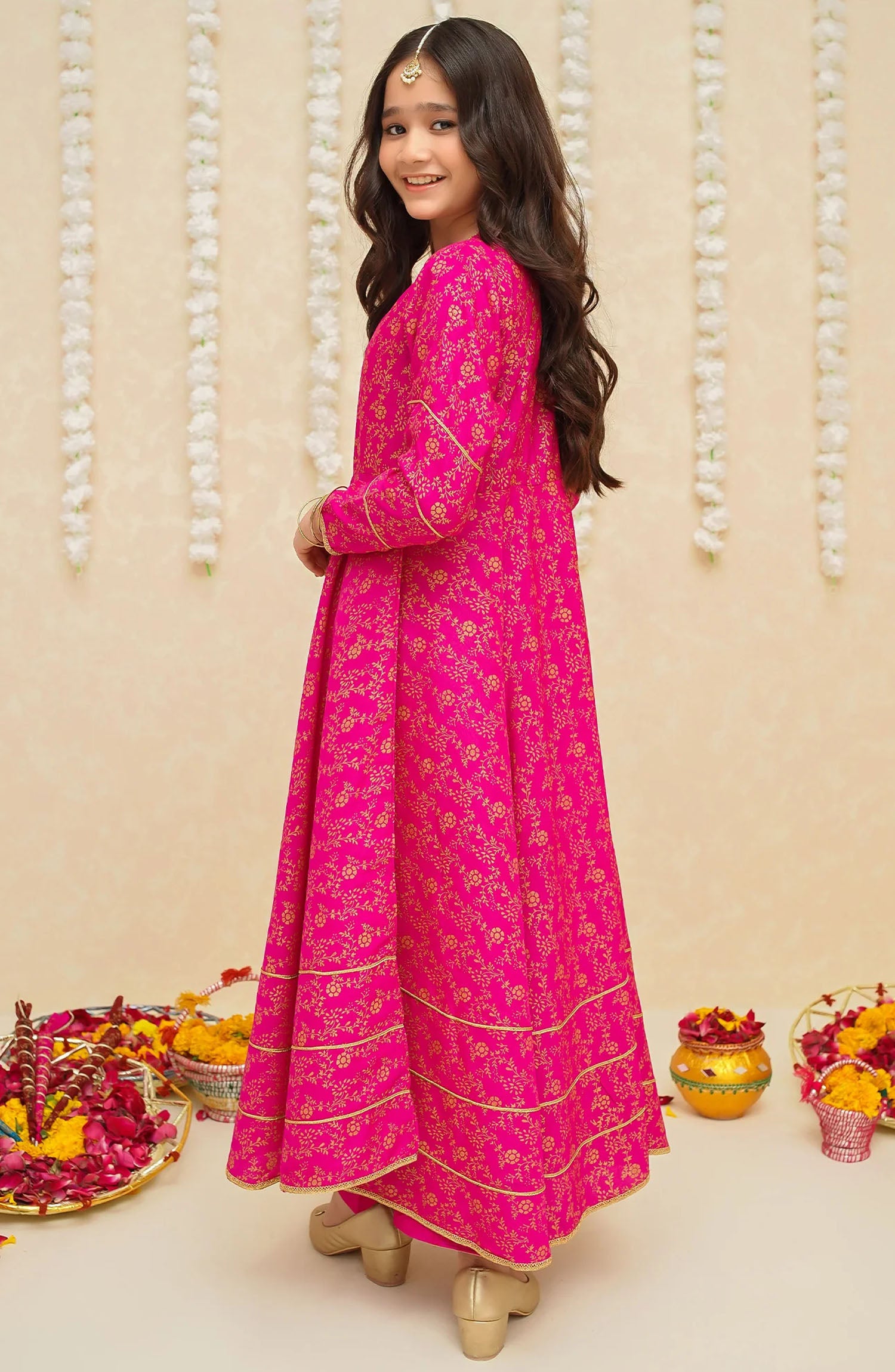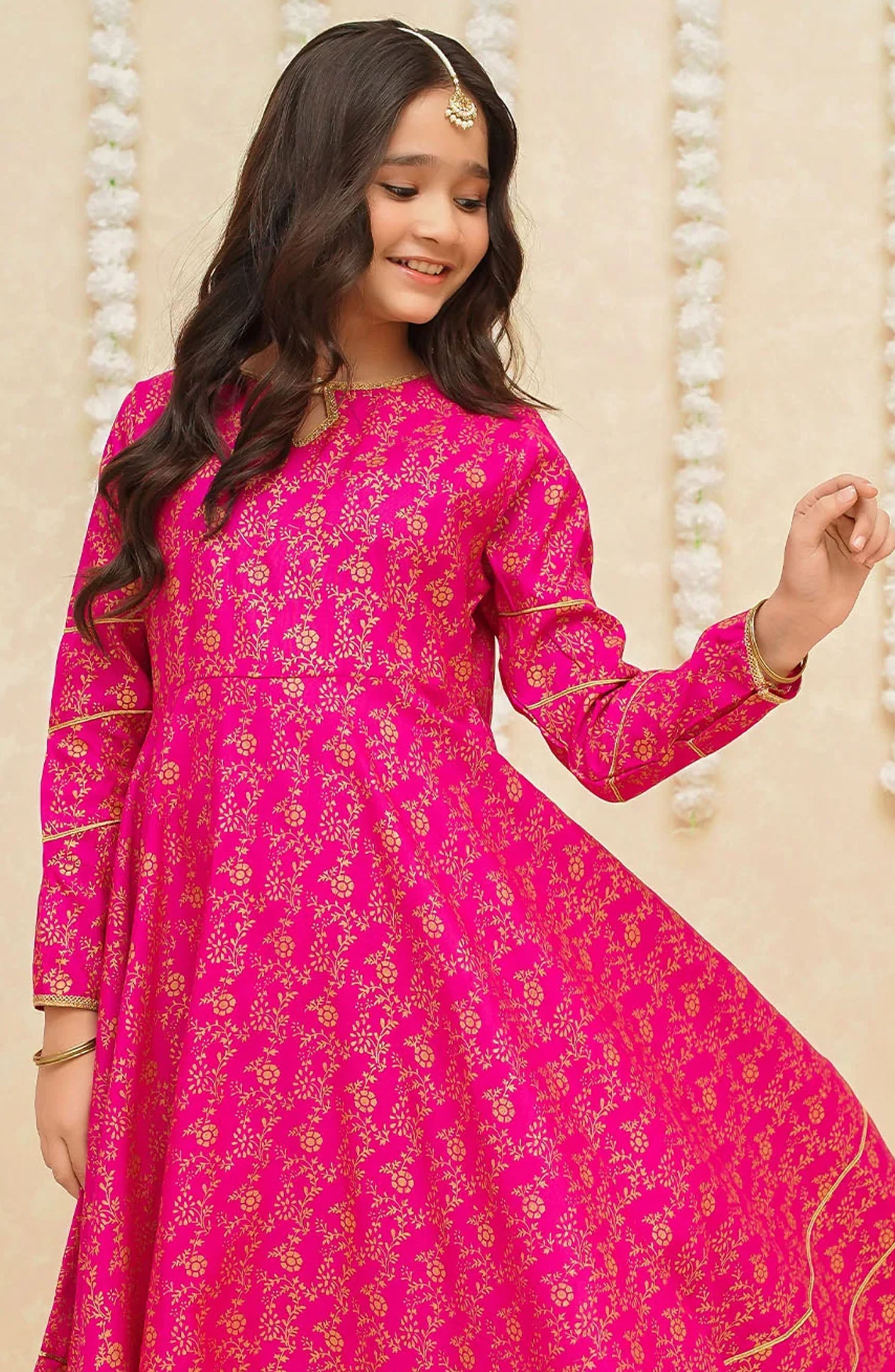 "This beautiful Hot Pink frock features golden floral patterns and intricate detailing. Paired with matching straight trousers and a stylish tassel pouch, it's a perfect pick for festive occasions and celebrations.