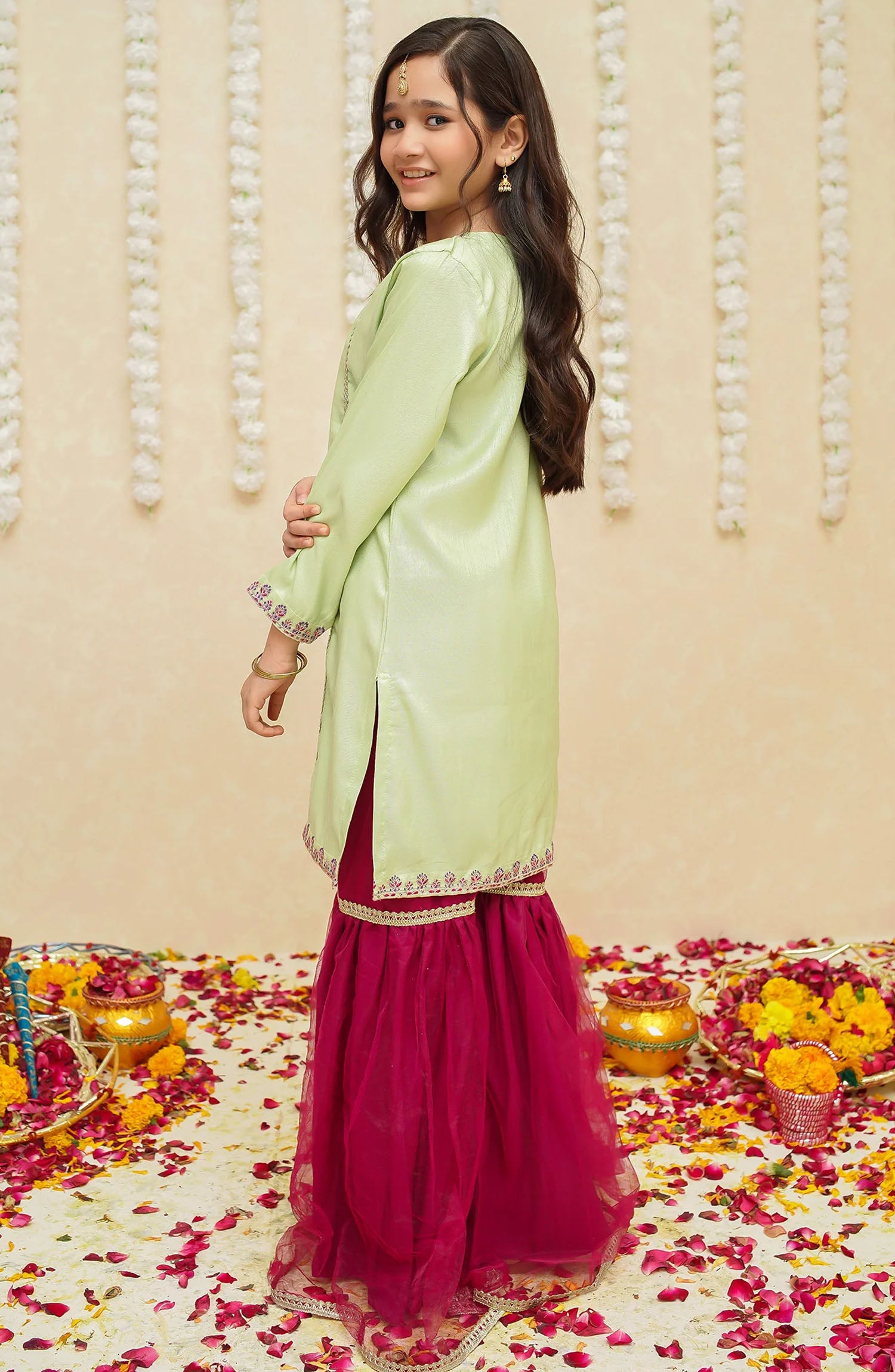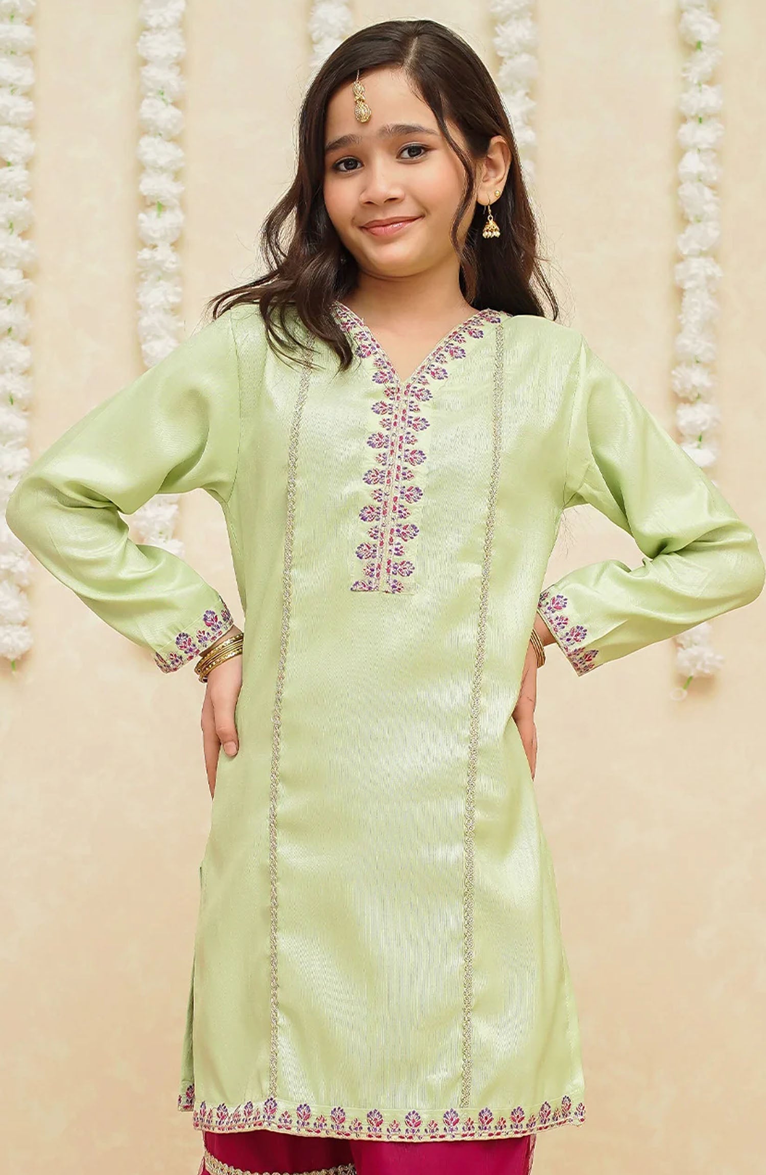 "This beautiful Raw Silk shirt features intricate neck detailing. Paired with a net gharara, it's a perfect pick for festive occasions and celebrations