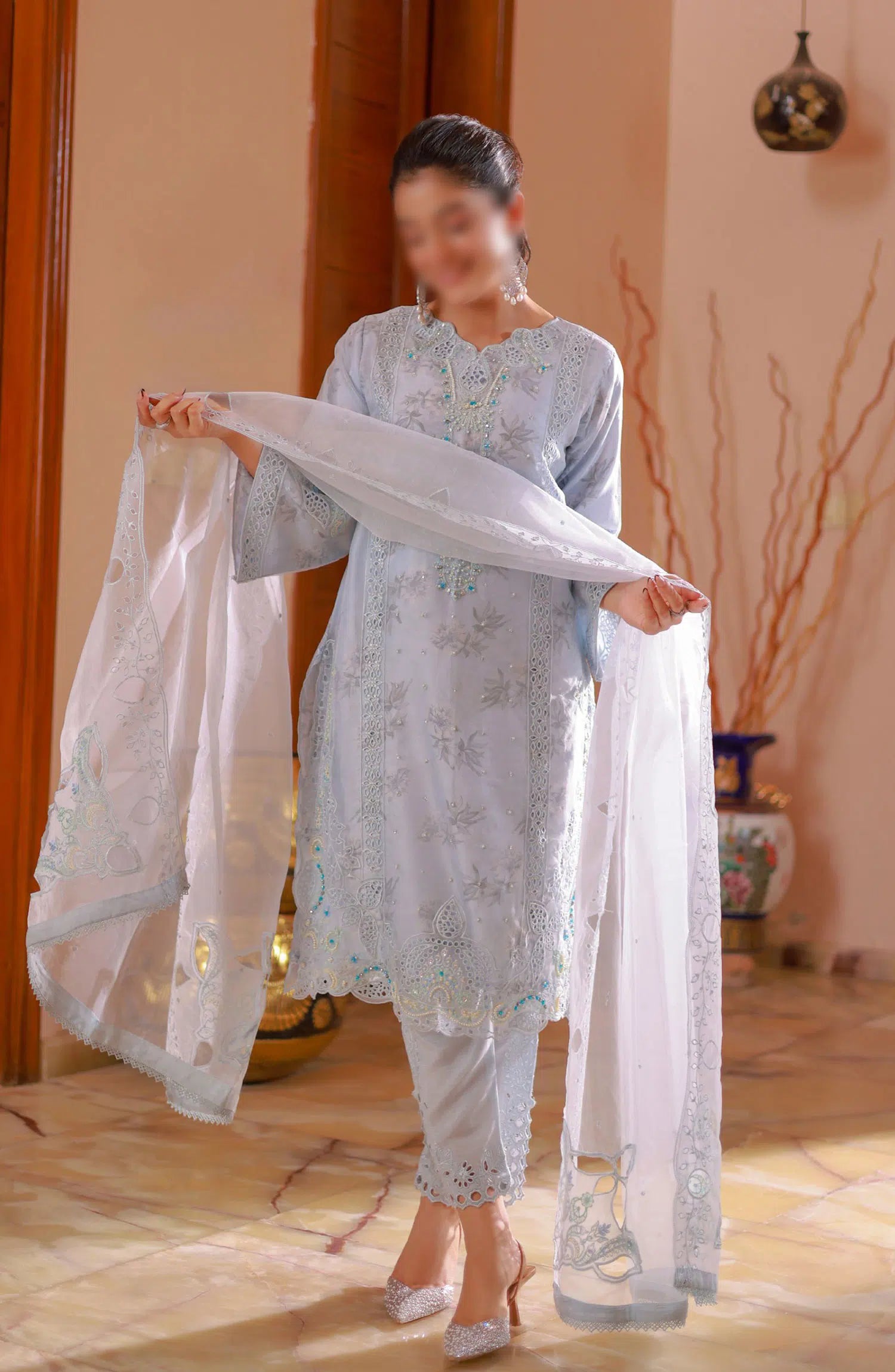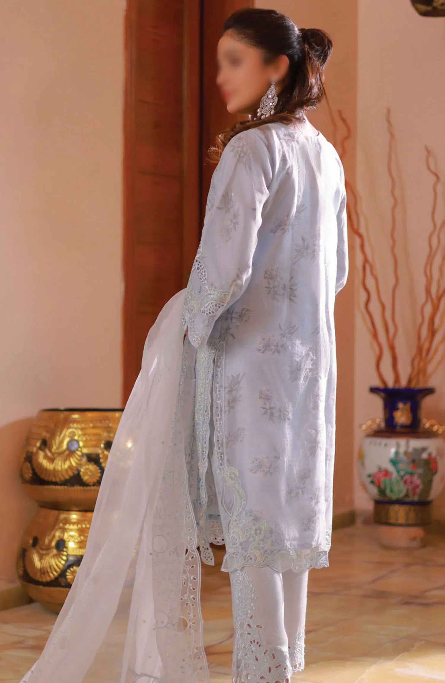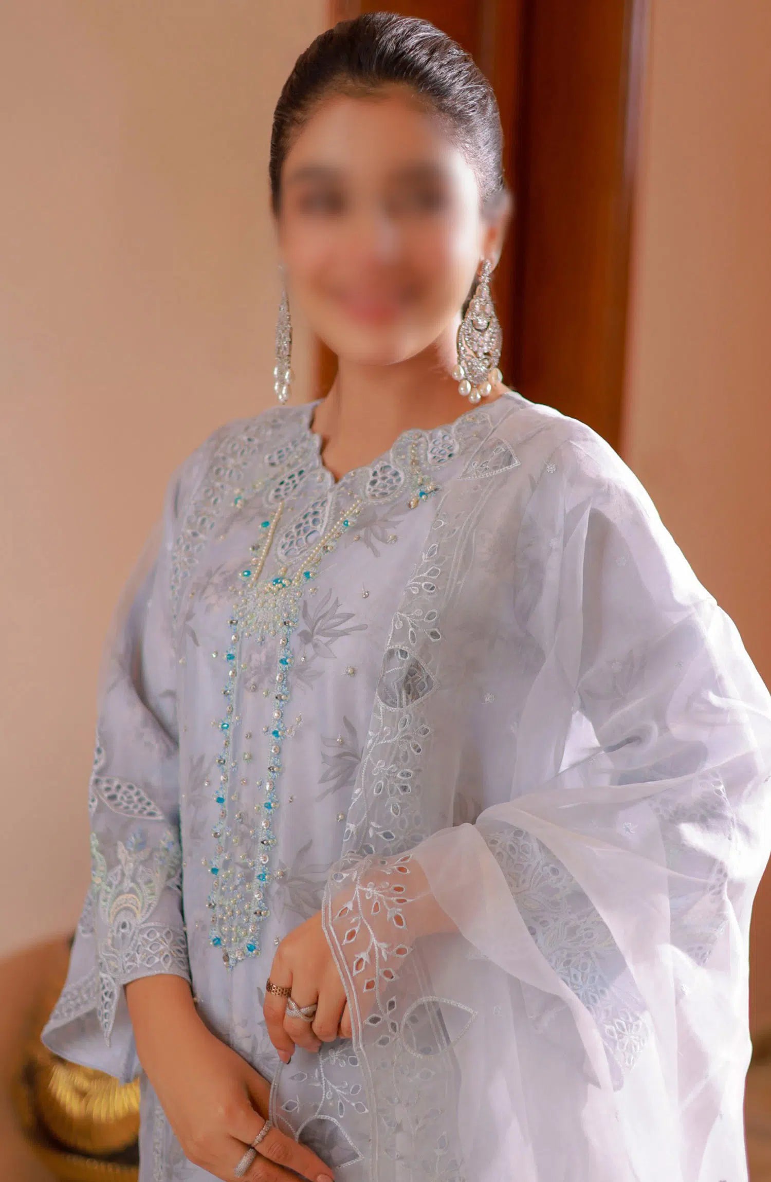 Guzel Naqsh Organza Stitched 3 Piece Collection has been styled in the image for photography and illustrative purposes.