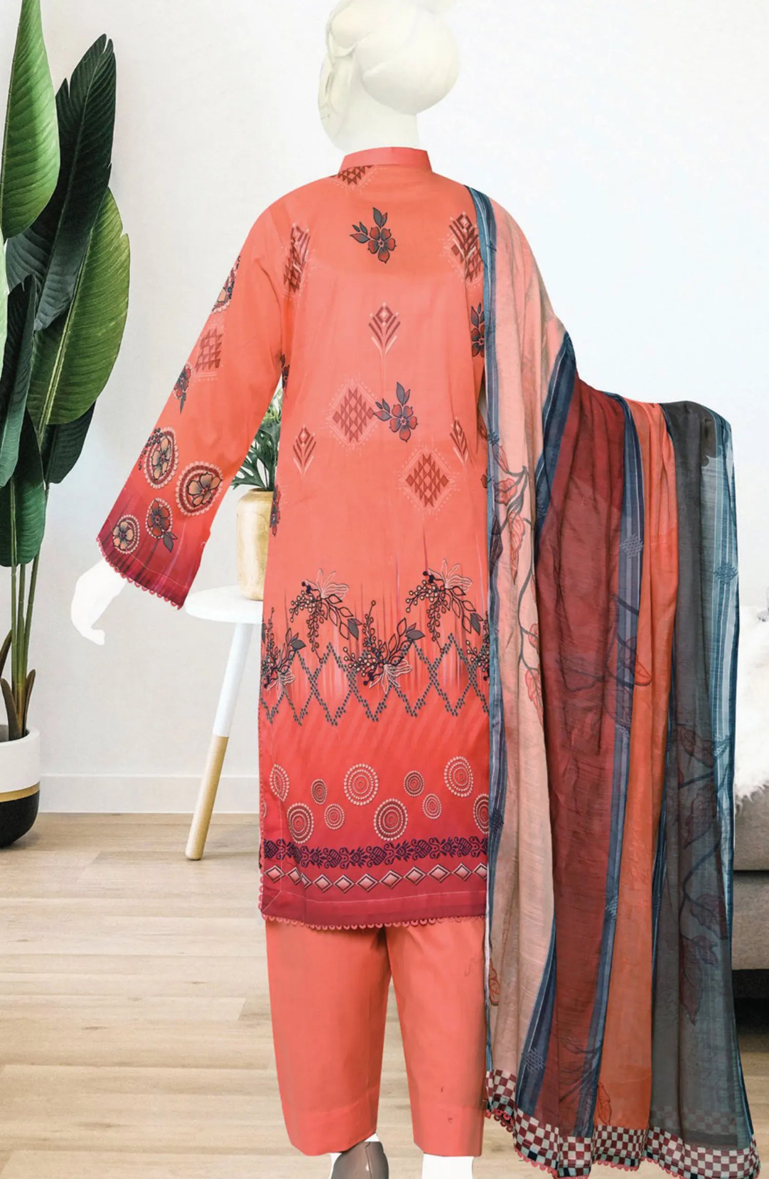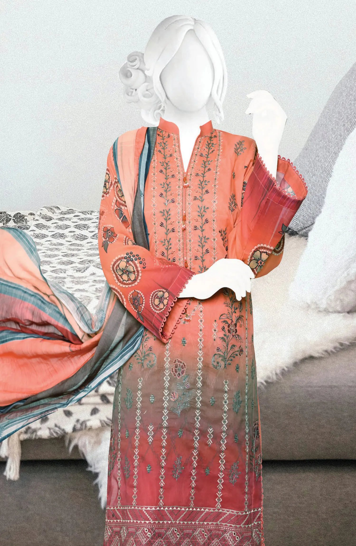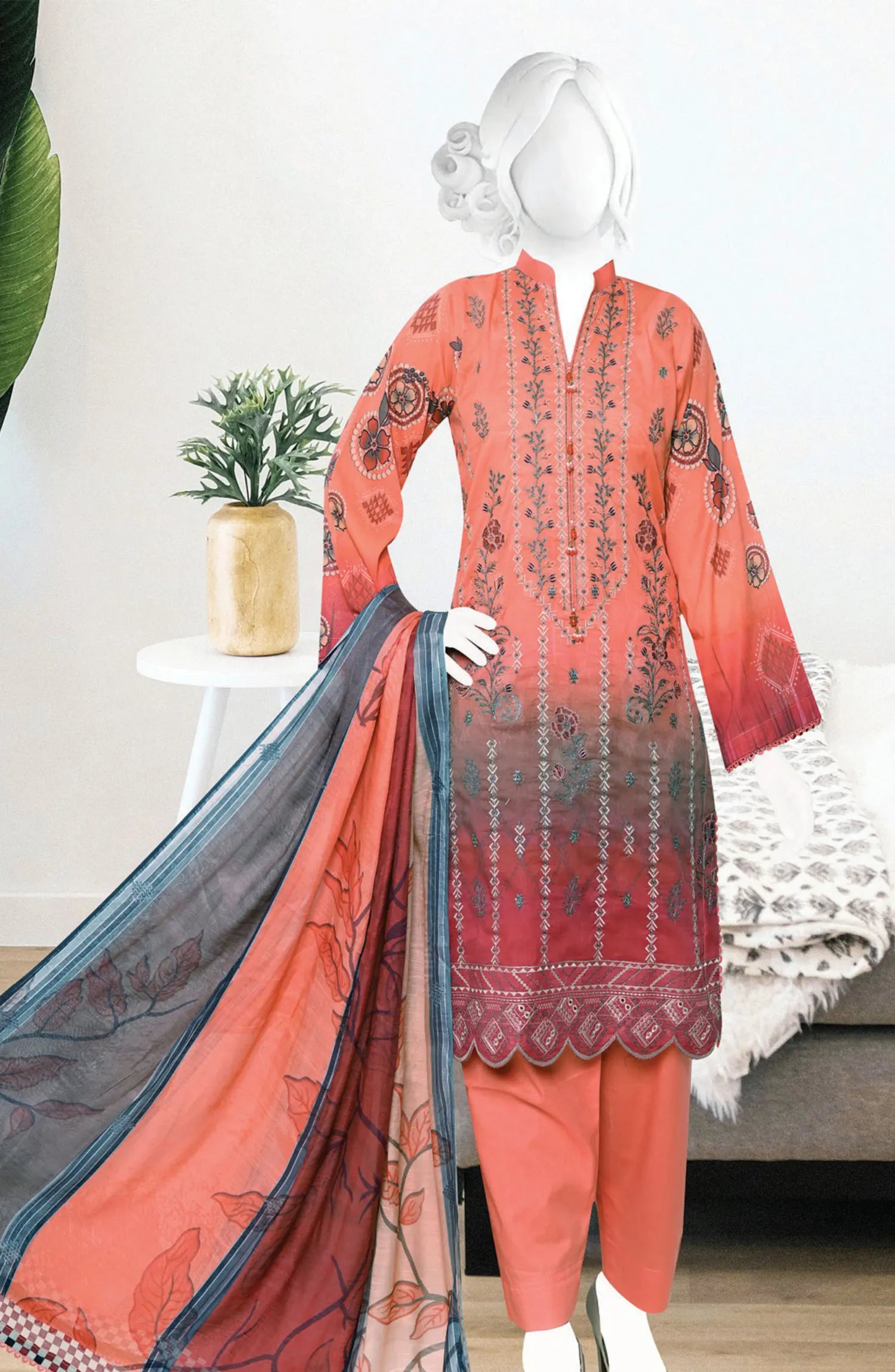 Hamna Digital Printed and Embroidered Lawn Collection has been styled in the image for photography and illustrative purposes.