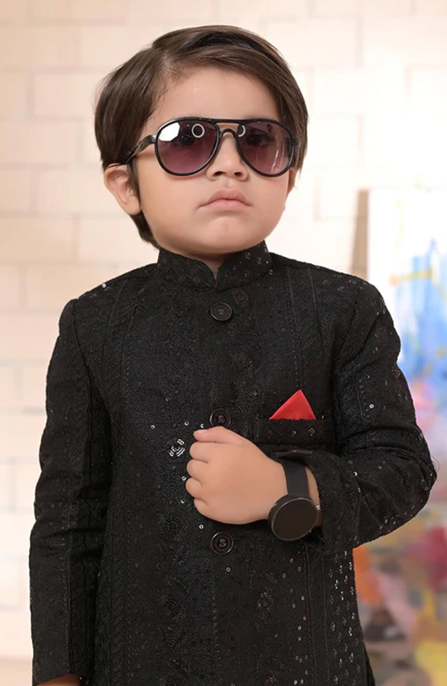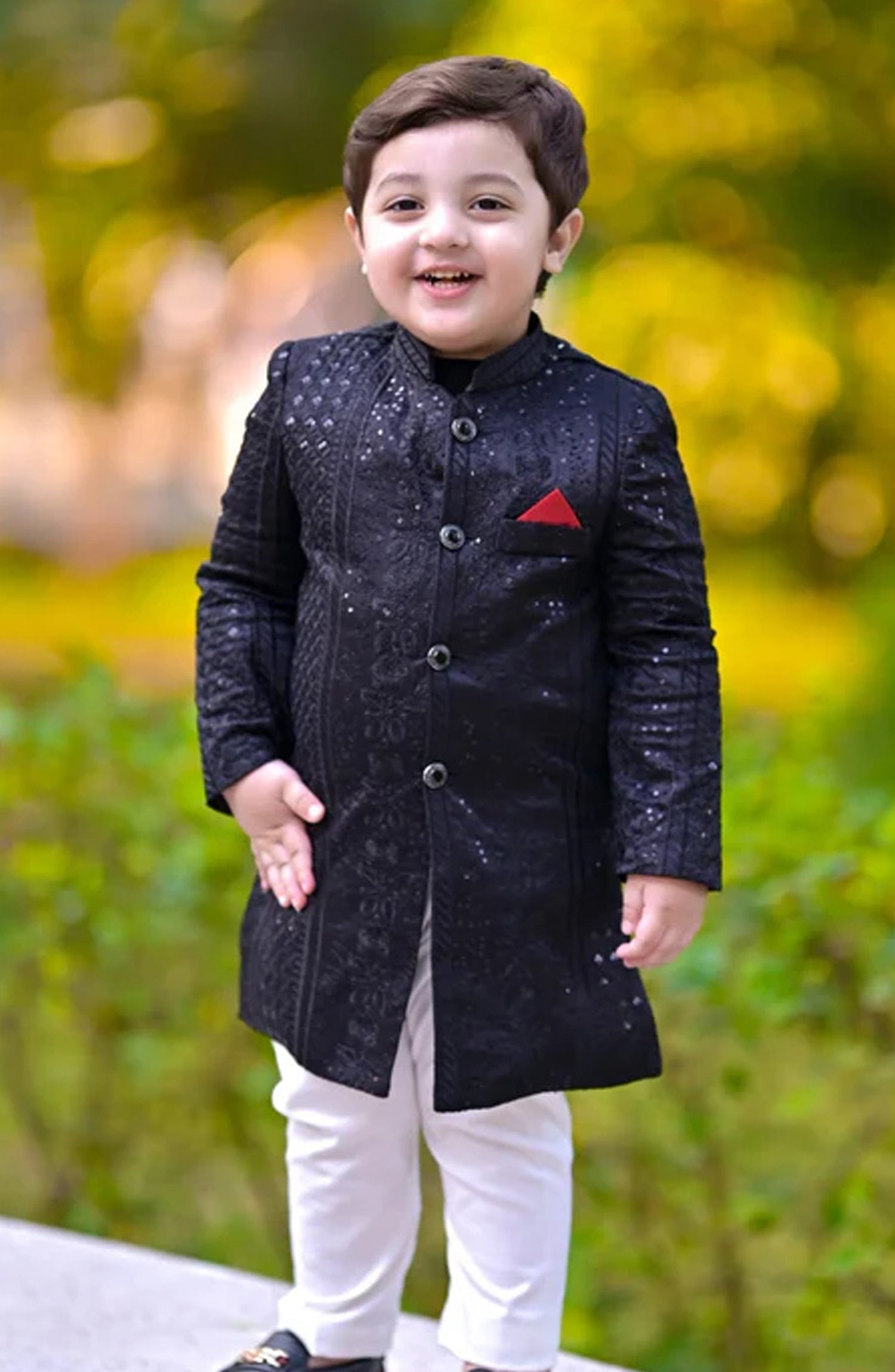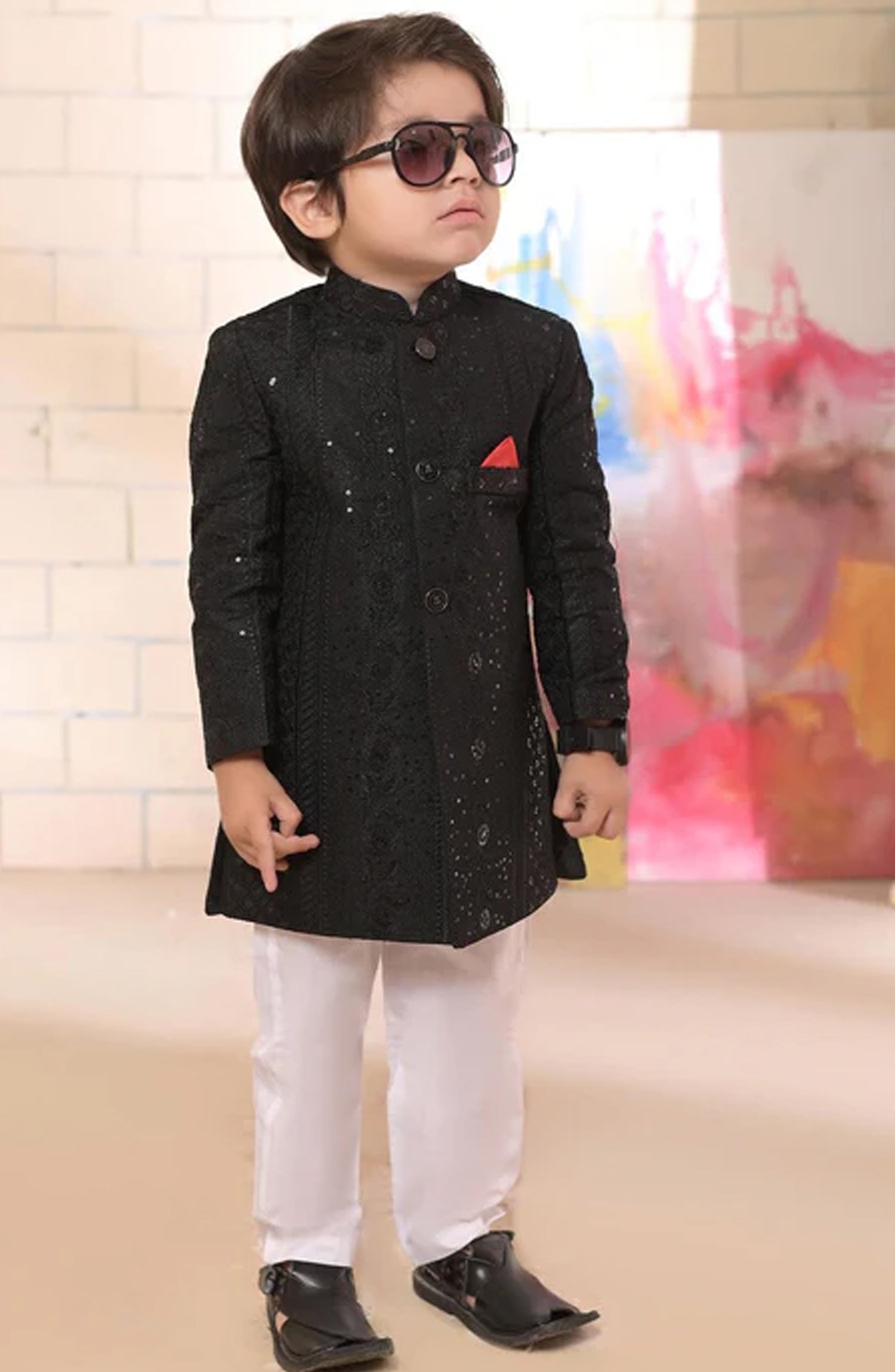 This black sherwani is of raw silk fabric which gives a luxurious and elegant look. It is adorned with intricate embroidered sequin work adding a touch of sparkle and glamour. The combination of black color and the beautiful detailing makes this sherwani a perfect choice for any special occasion.