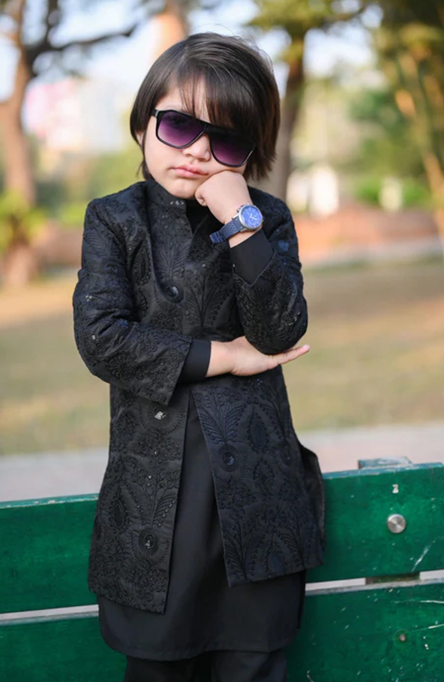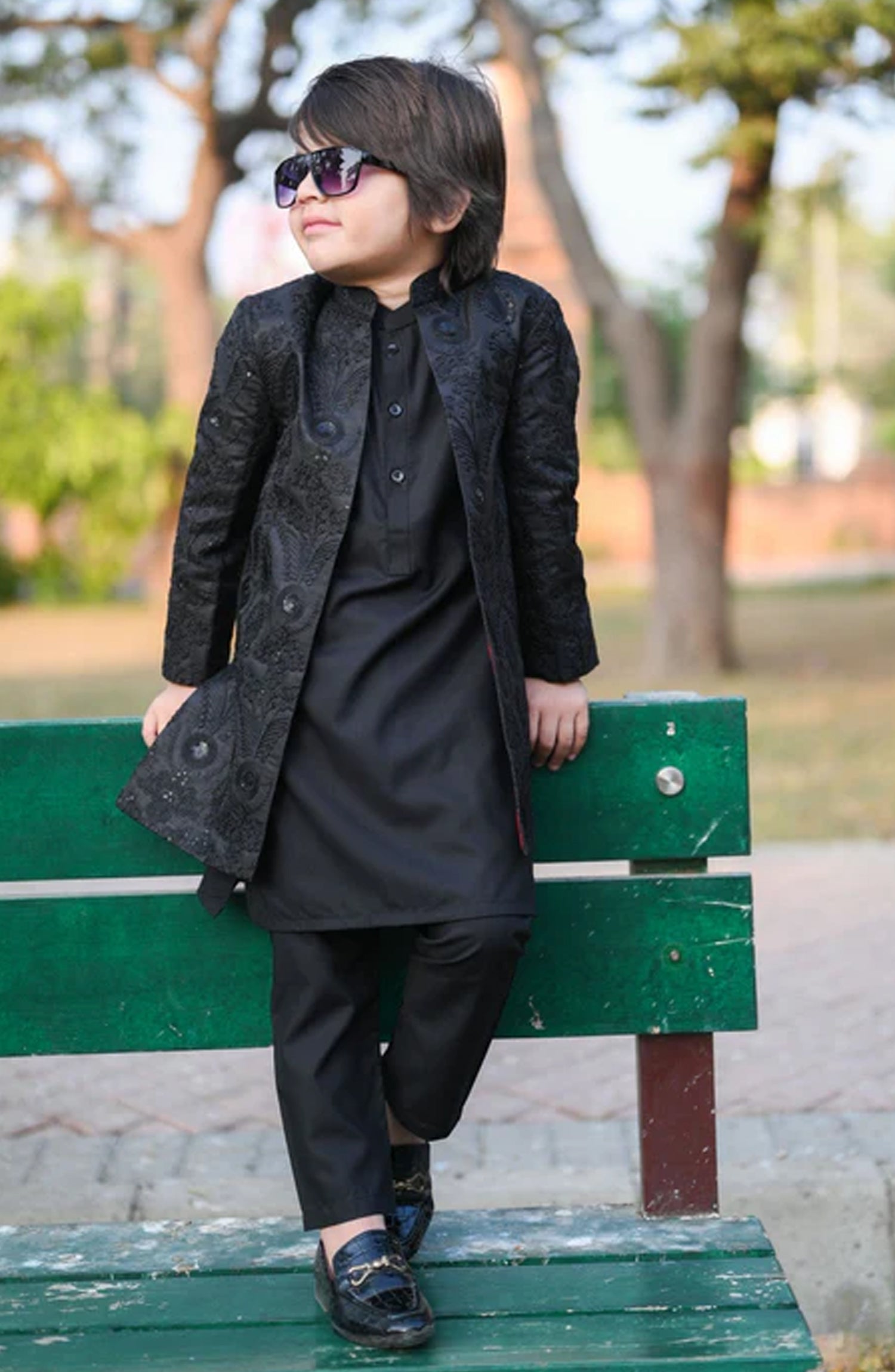 This black sherwani in jamawar is absolutely stunning. The combination of black color and the sequin embroidery creates a truly mesmerizing effect. The jamawar fabric adds a luxurious touch, giving the coat a regal and elegant look. It’s the perfect choice for a wedding or formal event where you want to stand out. Includes open long sherwani with kurta trouser For boys 2 - 14 years The size chart of this article is given below.
