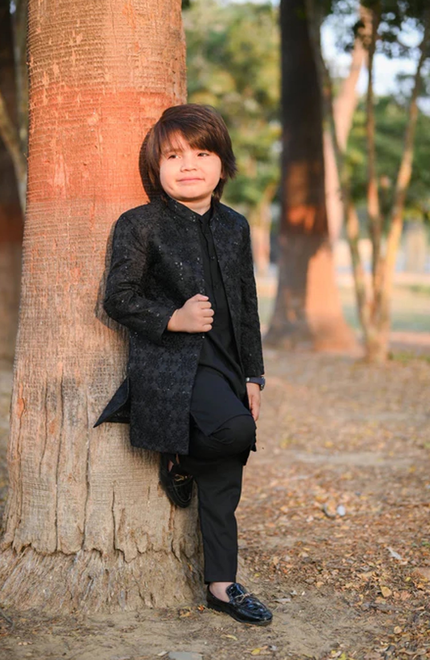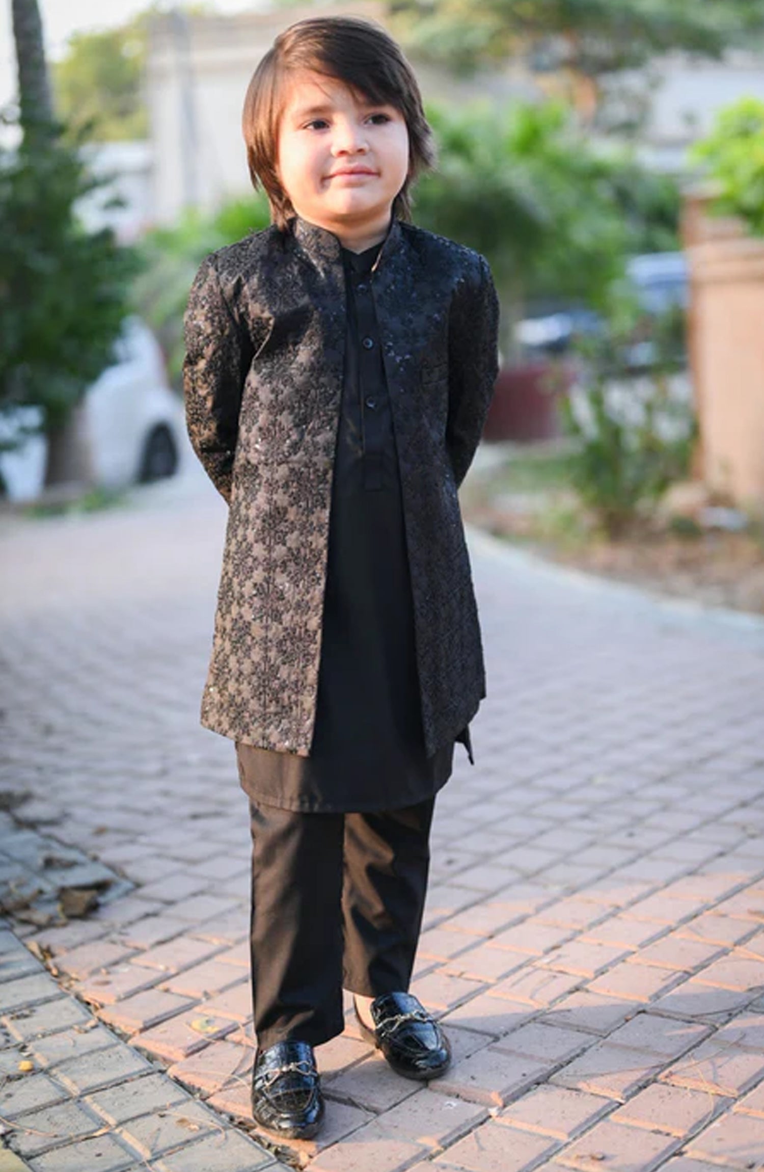 This black sherwani in jamawar is absolutely stunning. The combination of black color and the sequin embroidery creates a truly mesmerizing effect. The jamawar fabric adds a luxurious touch, giving the coat a regal and elegant look. It’s the perfect choice for a wedding or formal event where you want to stand out. Includes open sherwani with kurta trouser For boys 2 - 14 years The size chart of this article is given below.