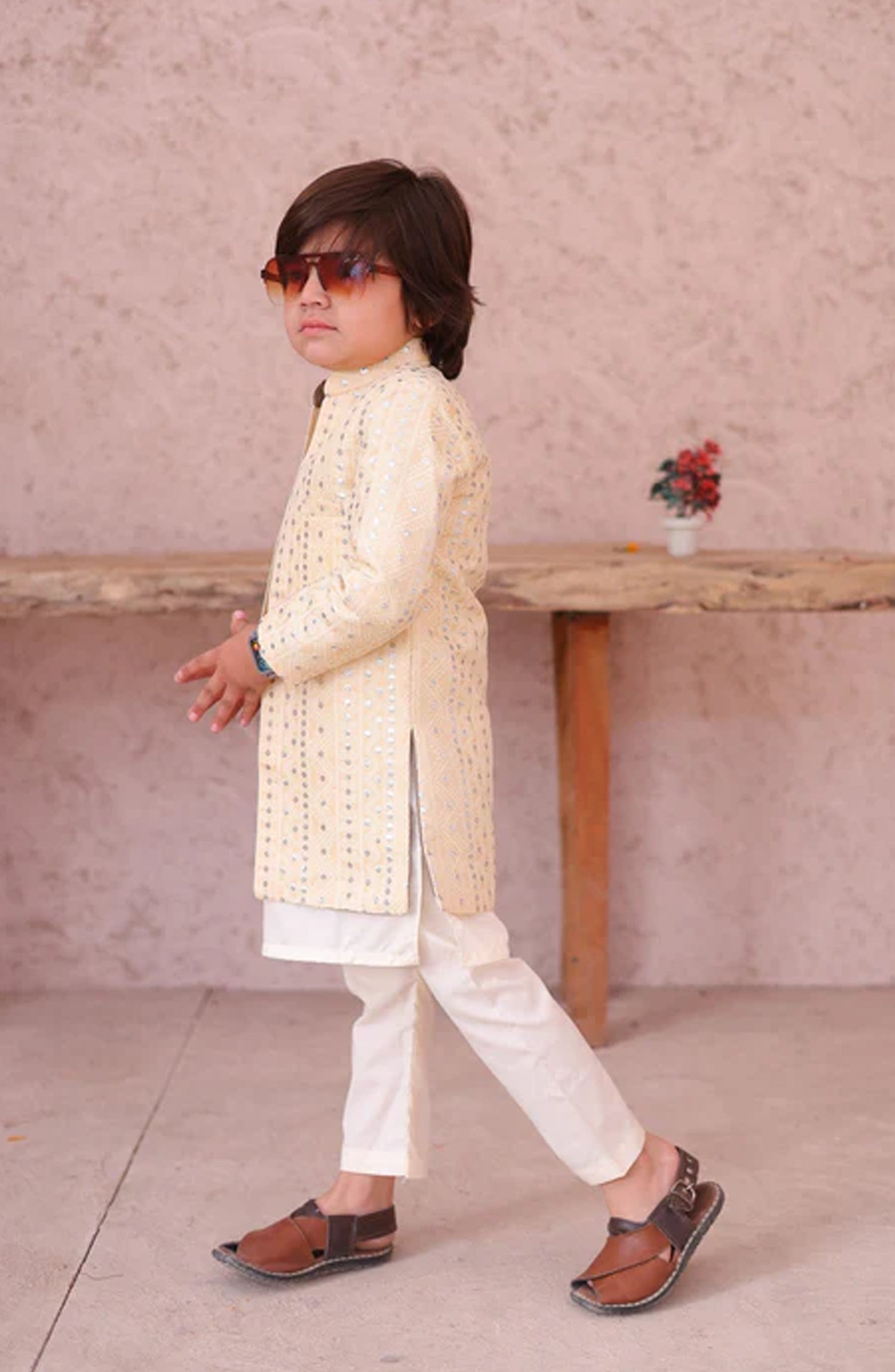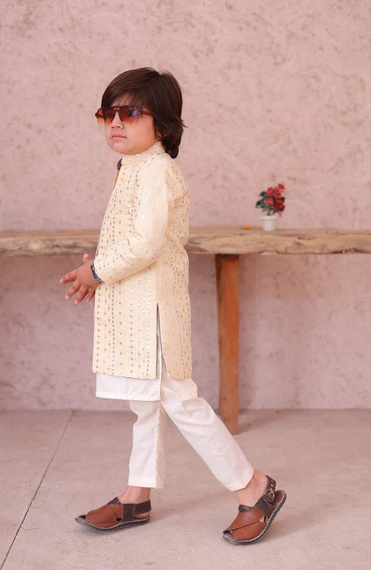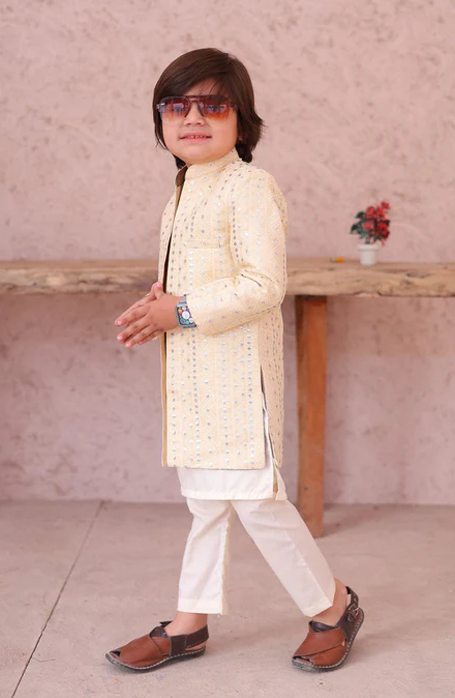 This cream sherwani in jamawar is absolutely stunning. The combination of cream color and the sequin embroidery creates a truly mesmerizing effect. The jamawar fabric adds a luxurious touch, giving the coat a regal and elegant look. It’s the perfect choice for a wedding or formal event where you want to stand out. Includes only long coat/ sherwani with kurta trouser For boys 2 - 14 years The size chart of this article is given below.