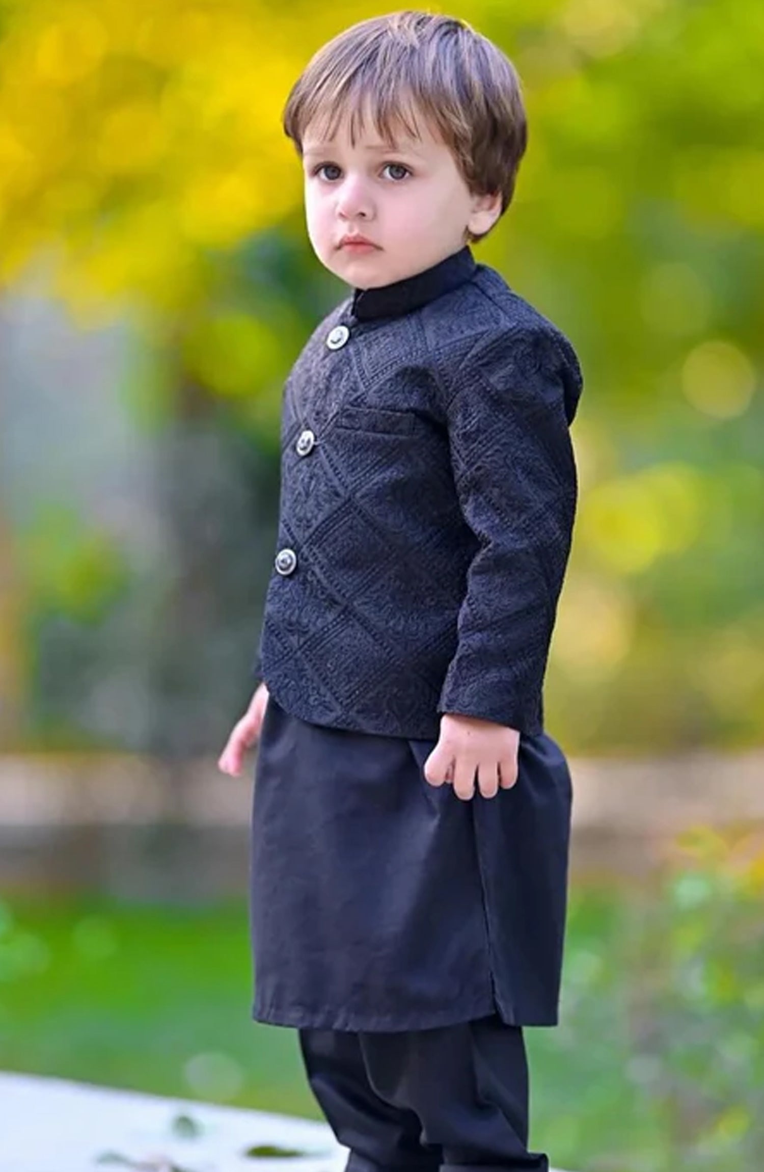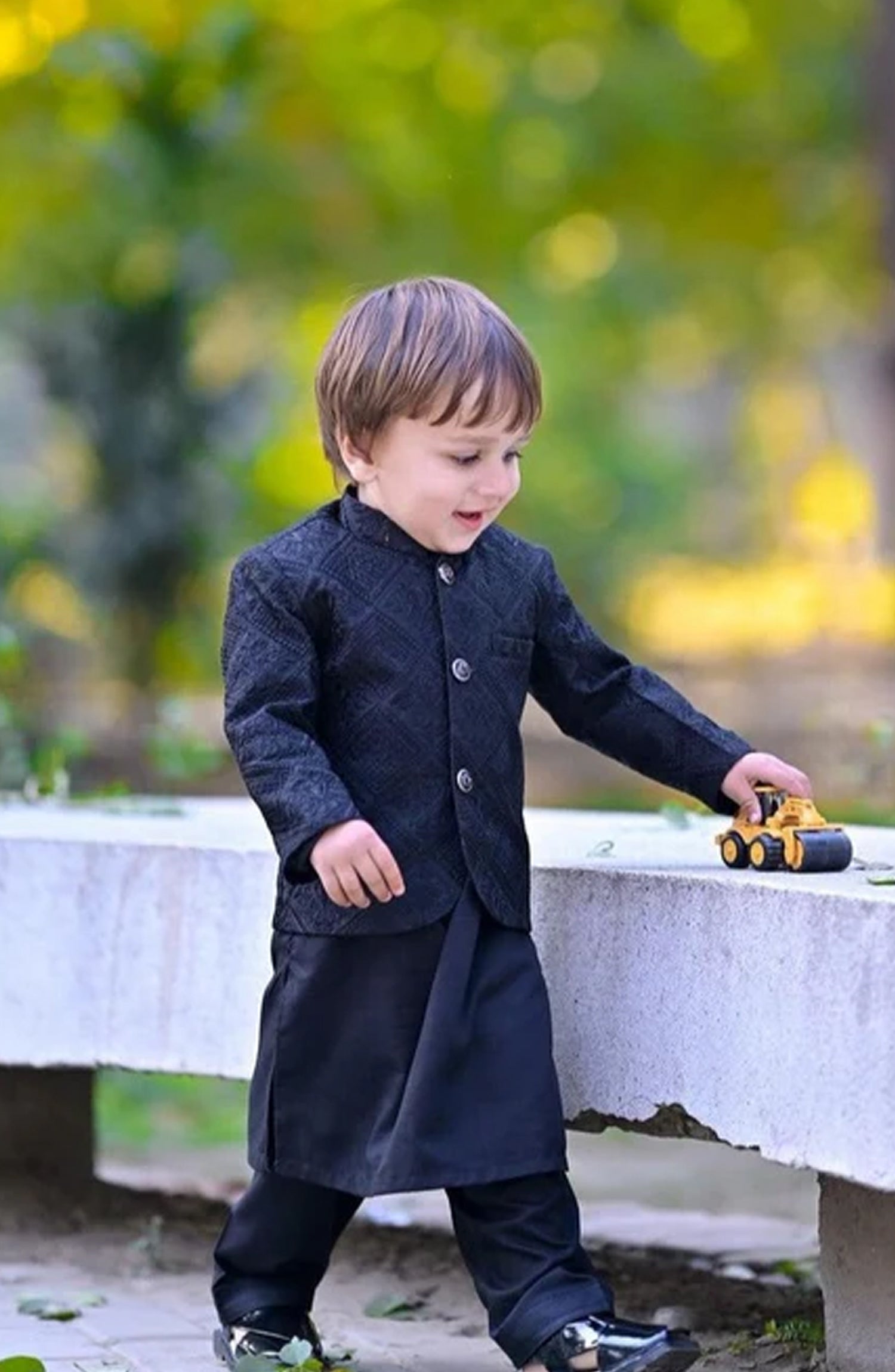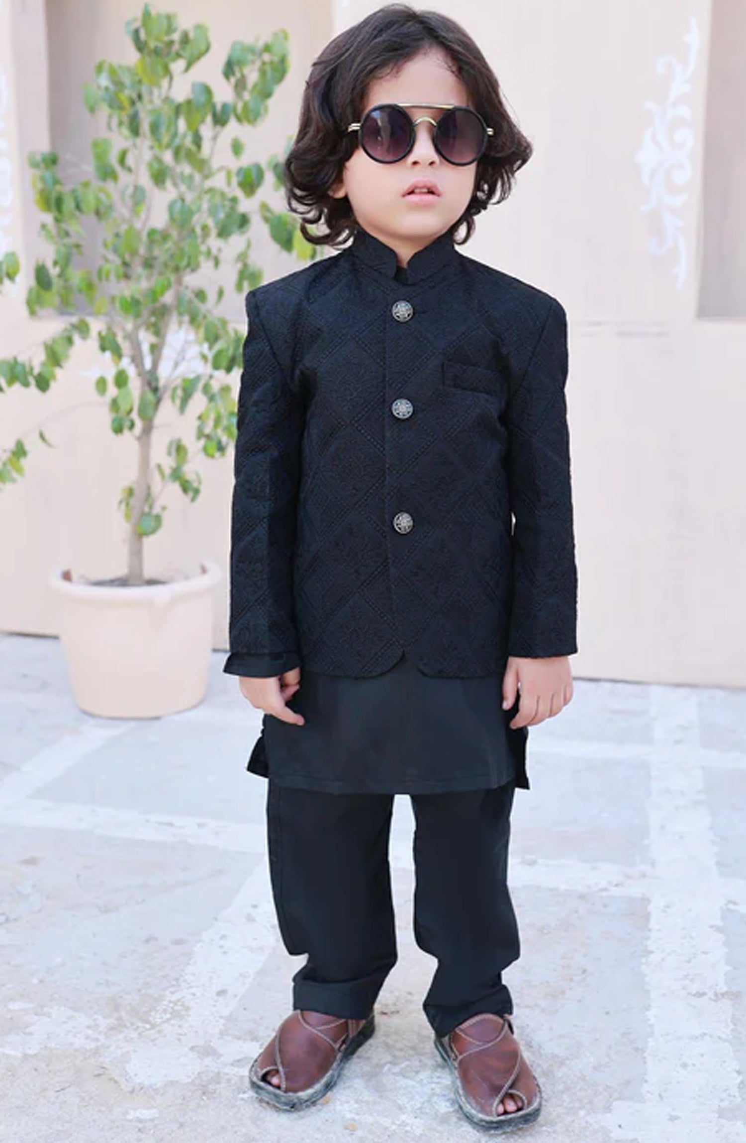 This black white prince coat in raw silk with sequin embroidery is absolutely stunning. The combination of black color and the shimmering sequin embroidery creates a truly mesmerizing effect. The raw silk fabric adds a luxurious touch, giving the coat a regal and elegant look. It’s the perfect choice for a wedding or formal event where you want to stand out.