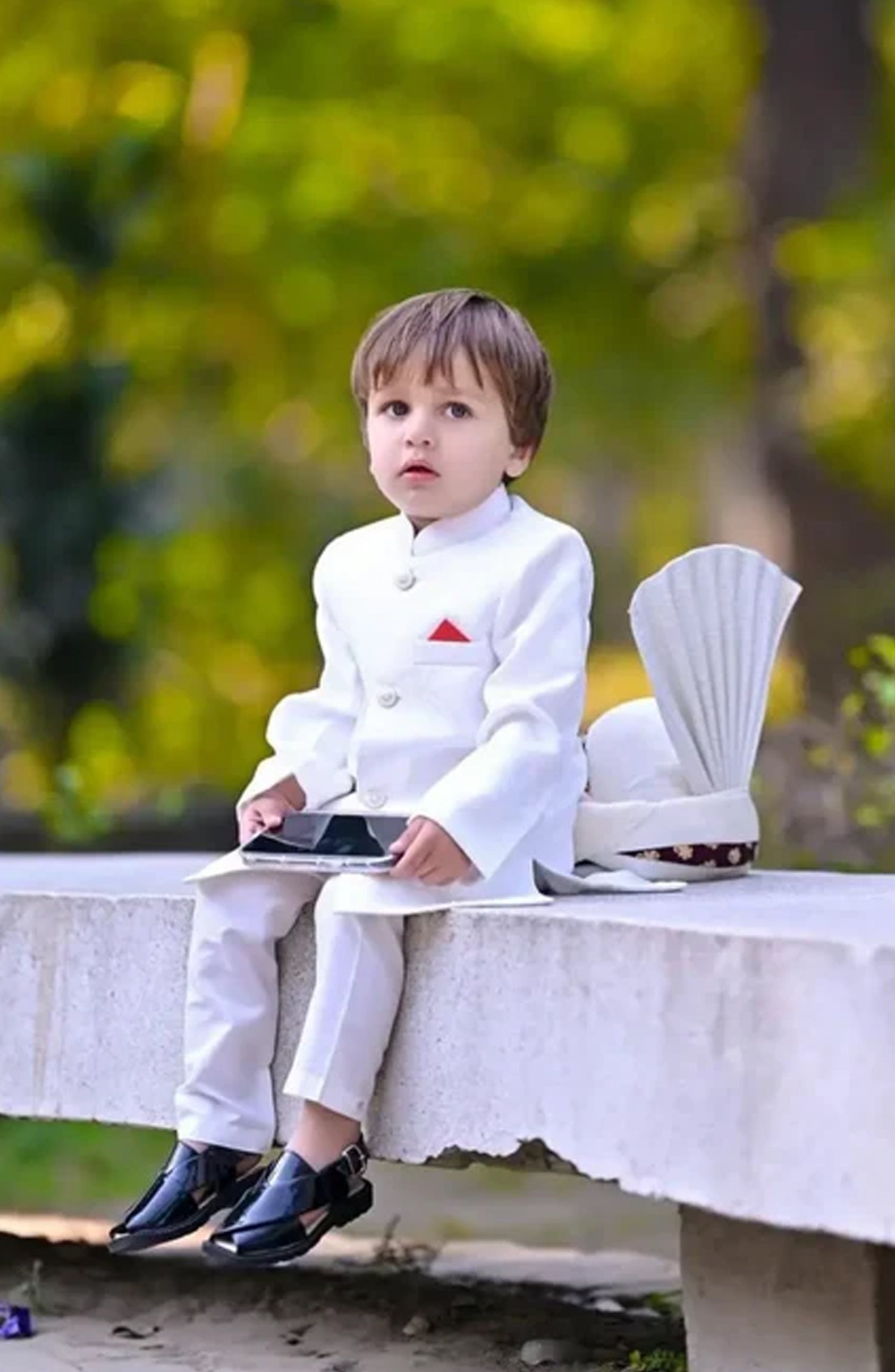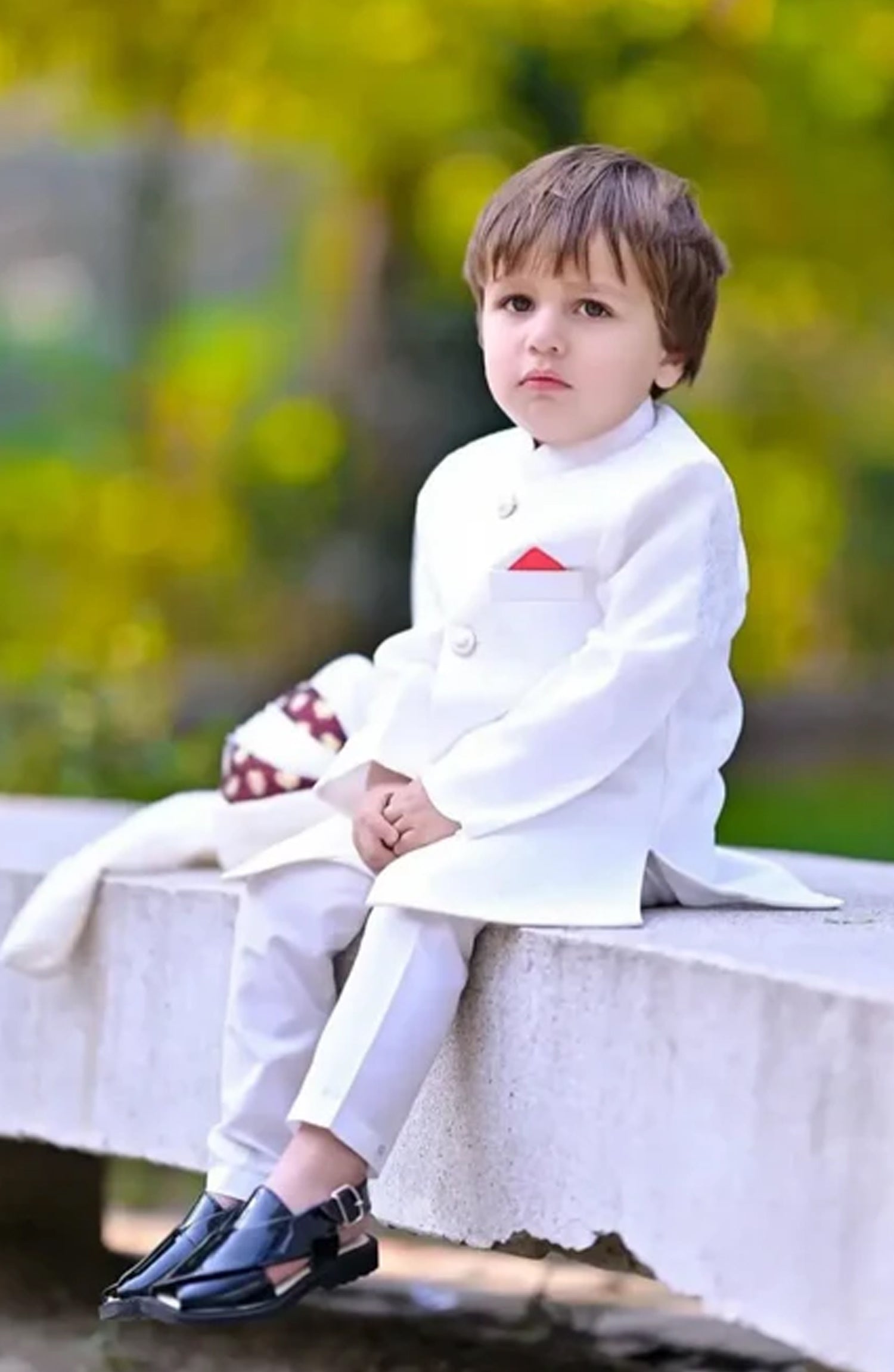 This off-white sherwani is made of a beautiful jamawar fabric, which has a rich and luxurious texture. The sherwani is in elegant off-white color, giving sophisticated and timeless look. It’s a perfect choice for special occasions and weddings.
