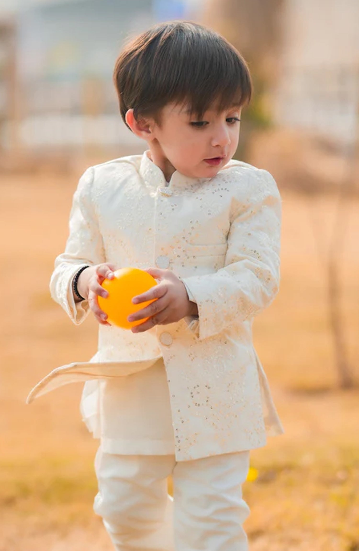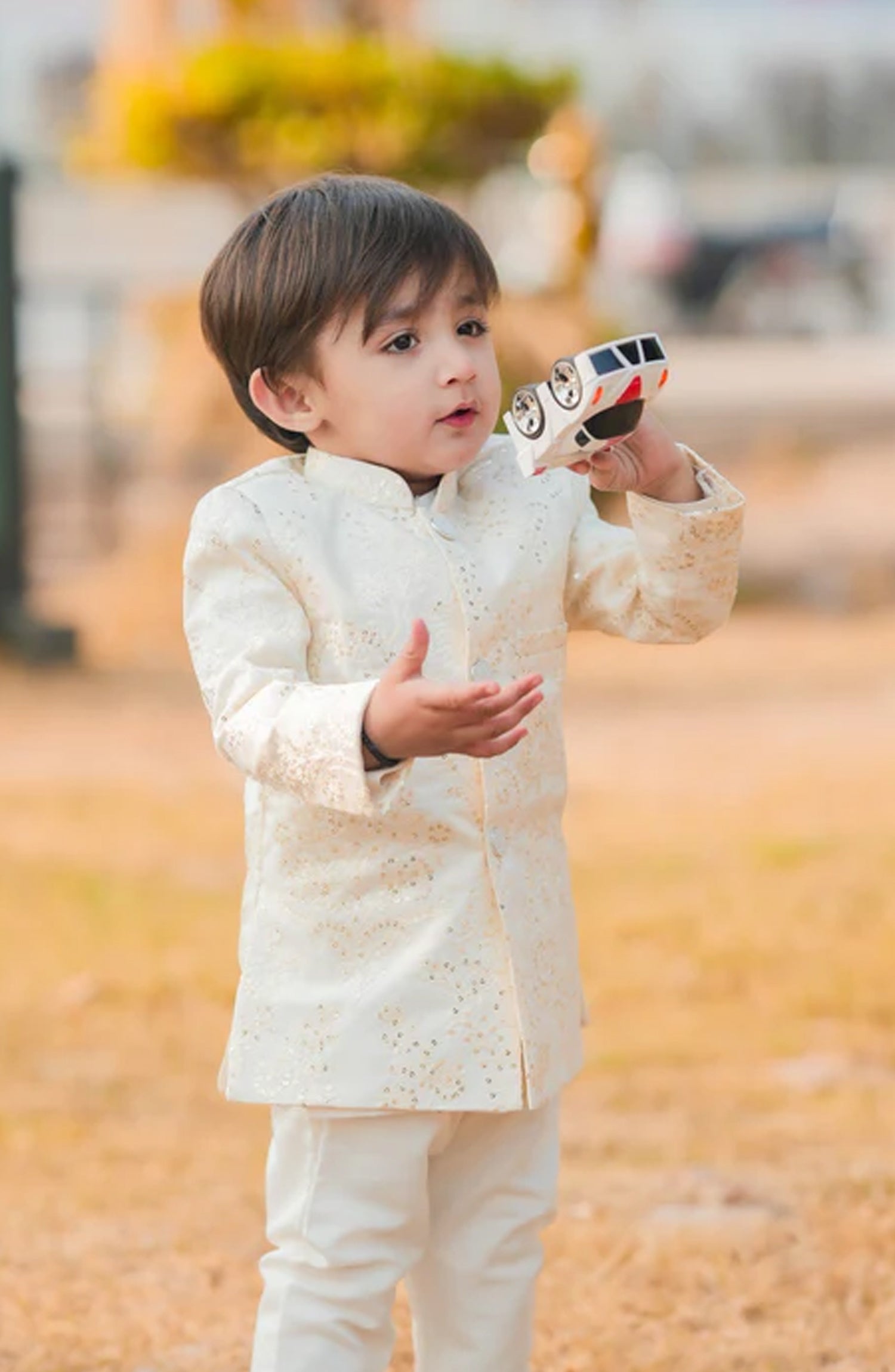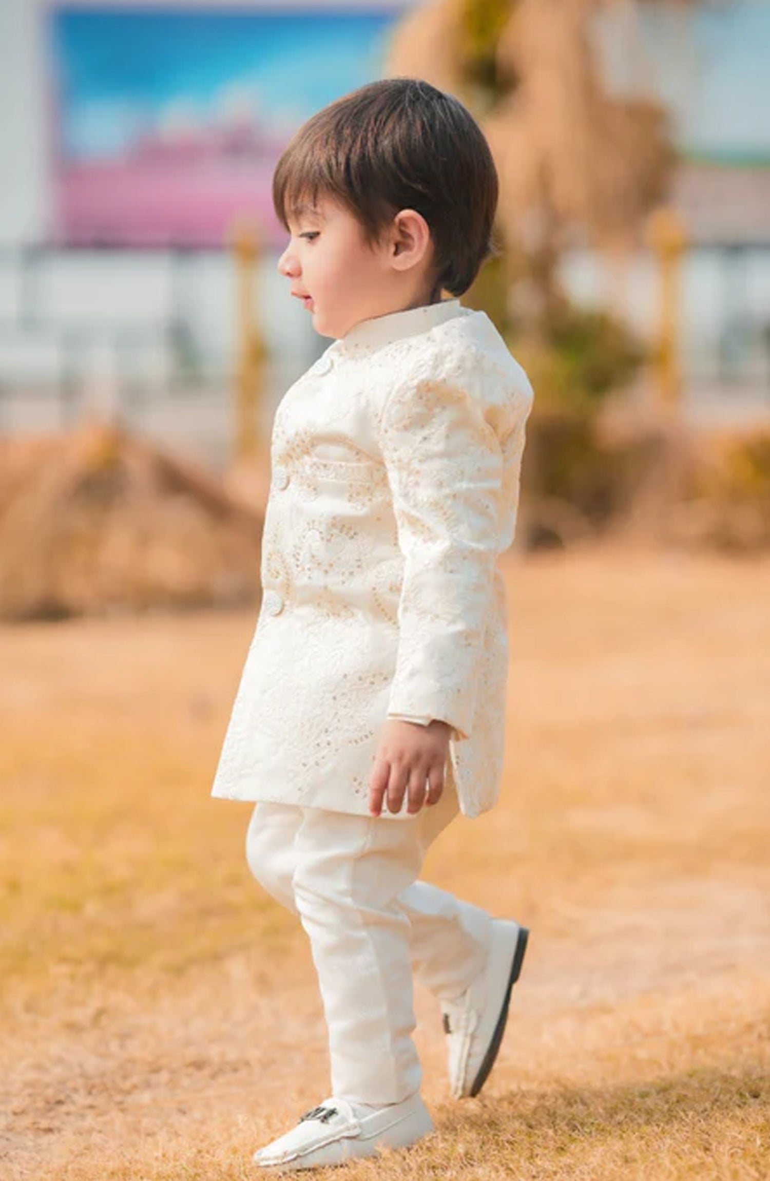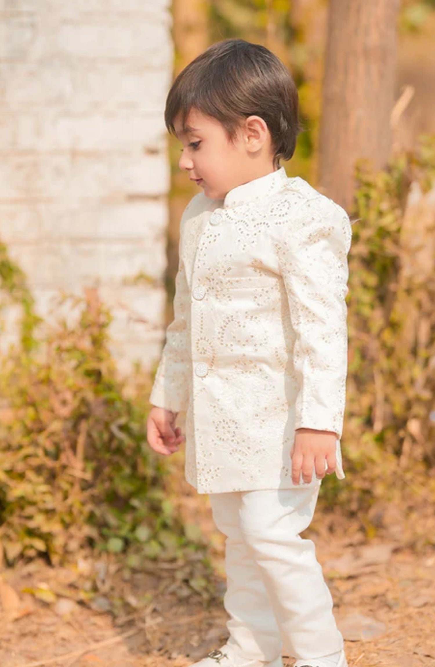 This white sherwani is of jamawar fabric which gives a luxurious and elegant look. It is adorned with intricate embroidered sequin work adding a touch of sparkle and glamour. The combination of white color and the beautiful detailing makes this sherwani a perfect choice for any special occasion. For boys 1 - 9 years The size chart of this article is given below.