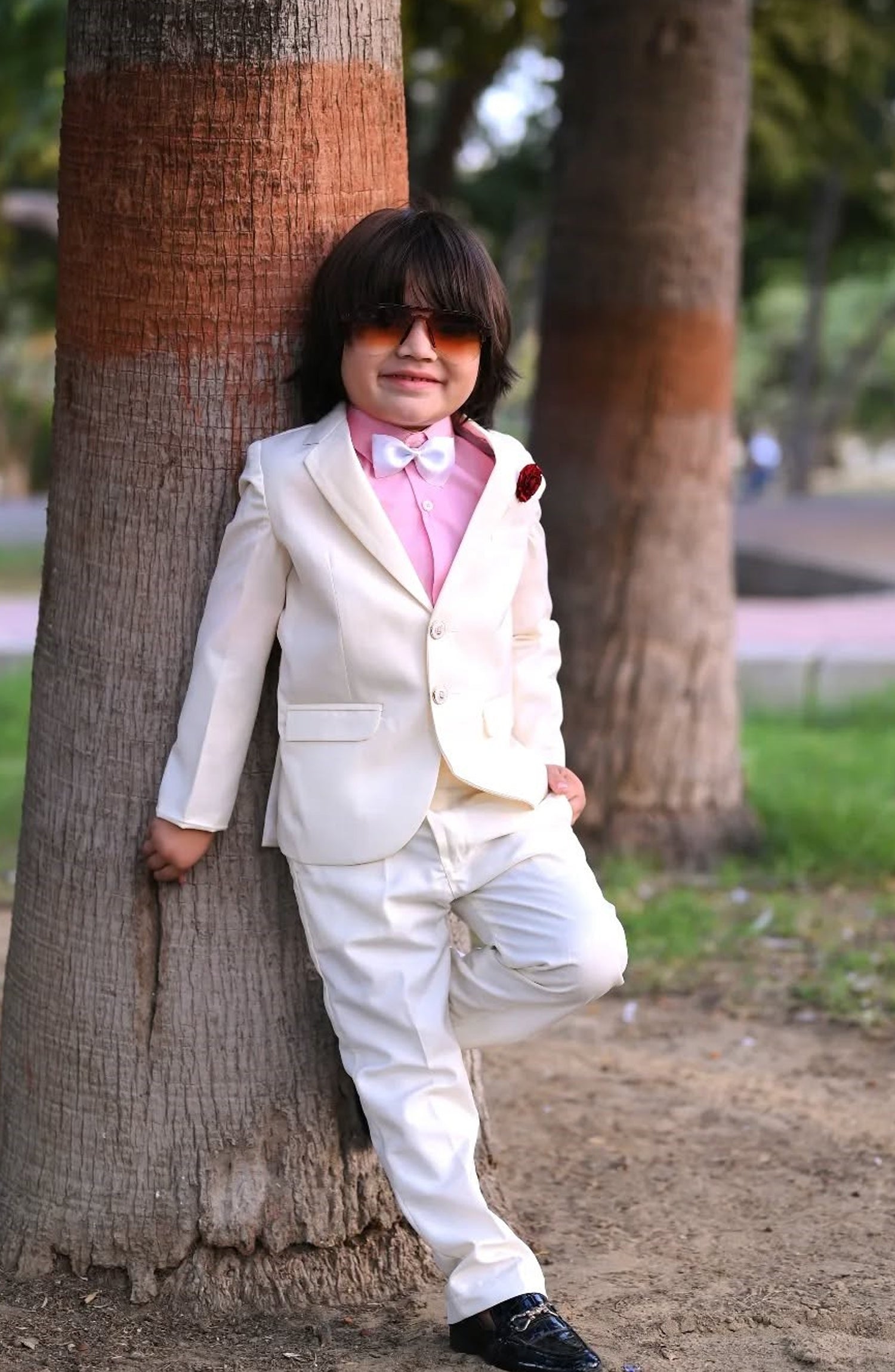 The suit features a sleek white coat with a tailored fit, giving you a polished and sophisticated look. The pants are perfectly matched, providing a clean and streamlined silhouette. The waistcoat adds an extra touch of style, with its matching white fabric and button detailing. The bow completes the ensemble, adding a touch of elegance and charm.Its a classic and timeless outfit that exudes confidence and class