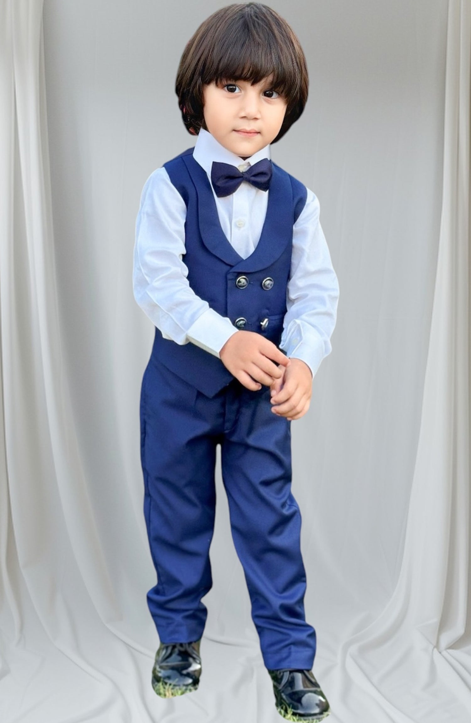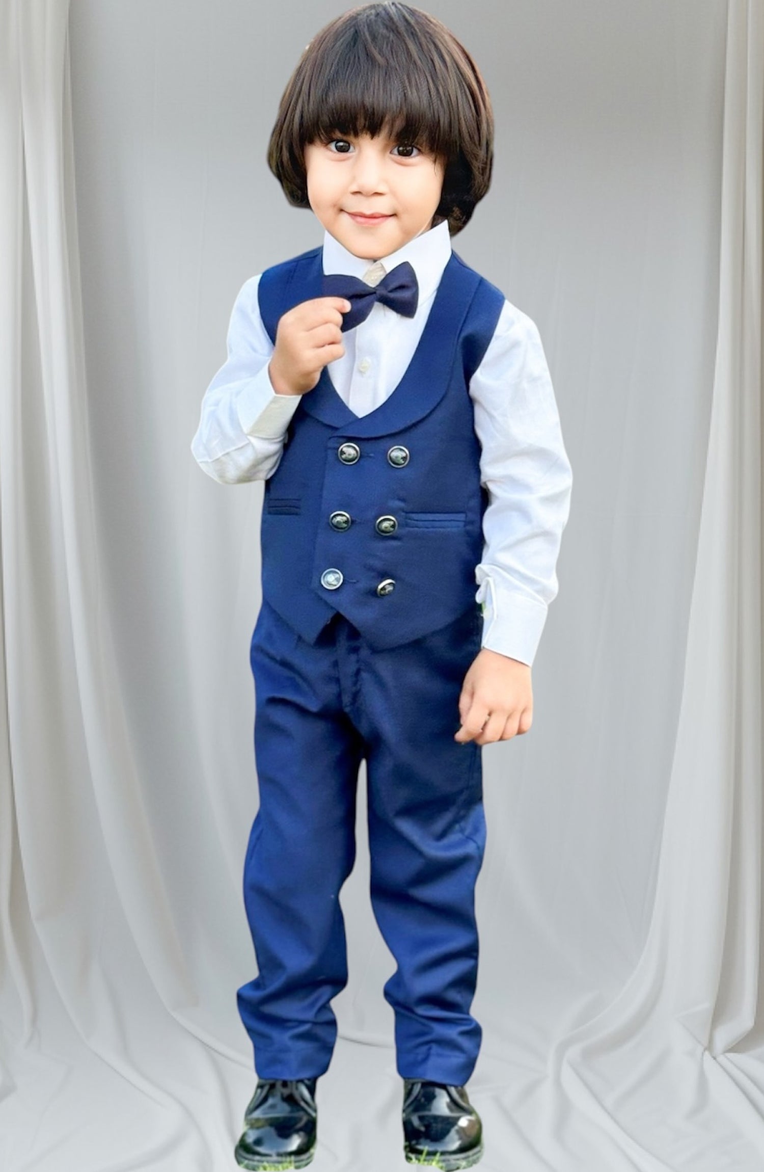 The suit is made of rich blue fabric, tailored to perfection. The waistcoat adds an extra touch of elegance, with its matching blue color and polished buttons. The pants are perfectly tailored with a slim fit. The bow tie adds a charming touch, completing the sophisticated look. It’s a timeless and stylish ensemble that’s perfect for any special occasion.