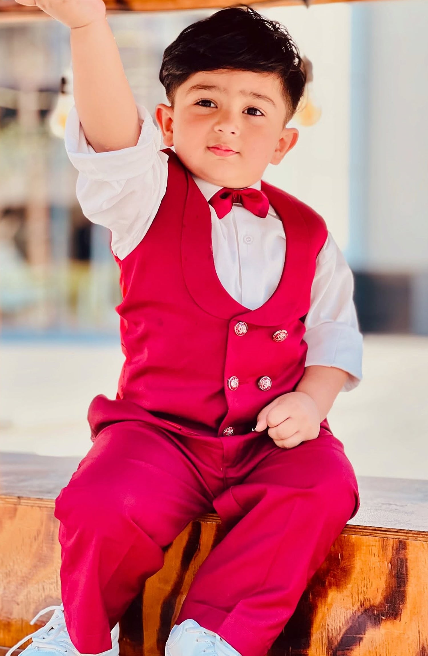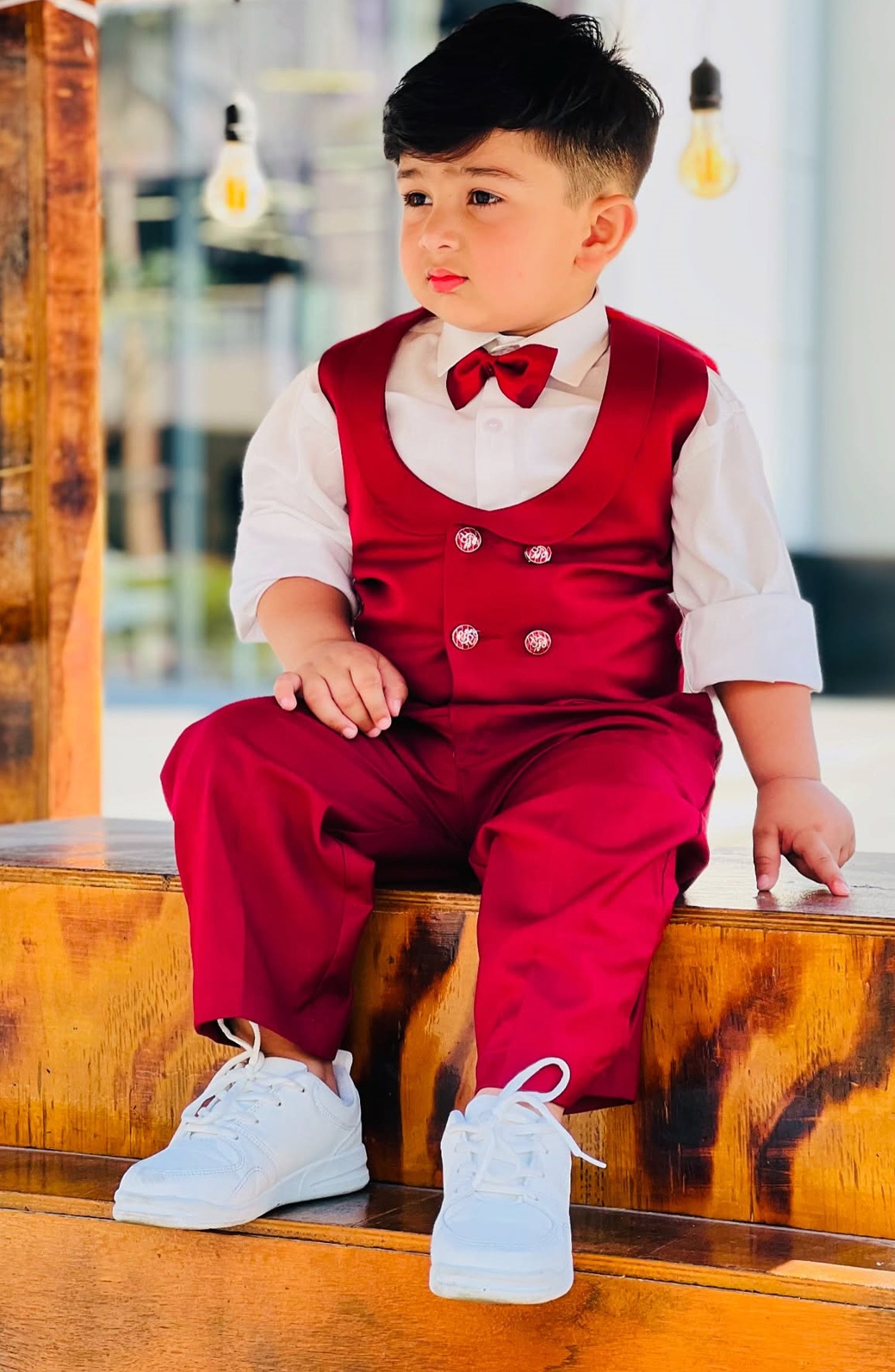 The suit is made of rich maroon fabric, tailored to perfection. The waistcoat adds an extra touch of elegance, with its matching maroon color and polished buttons. The pants are perfectly tailored with a slim fit. The bow tie adds a charming touch, completing the sophisticated look. It’s a timeless and stylish ensemble that’s perfect for any special occasion. Includes (maroon Waistcoat+maroon Pant+White Shirt+maroon Bow). High quality tropical suiting fabric 4pcs Suit. For boys 1 - 14 years. The Size Chart of The Article Is Given Below.