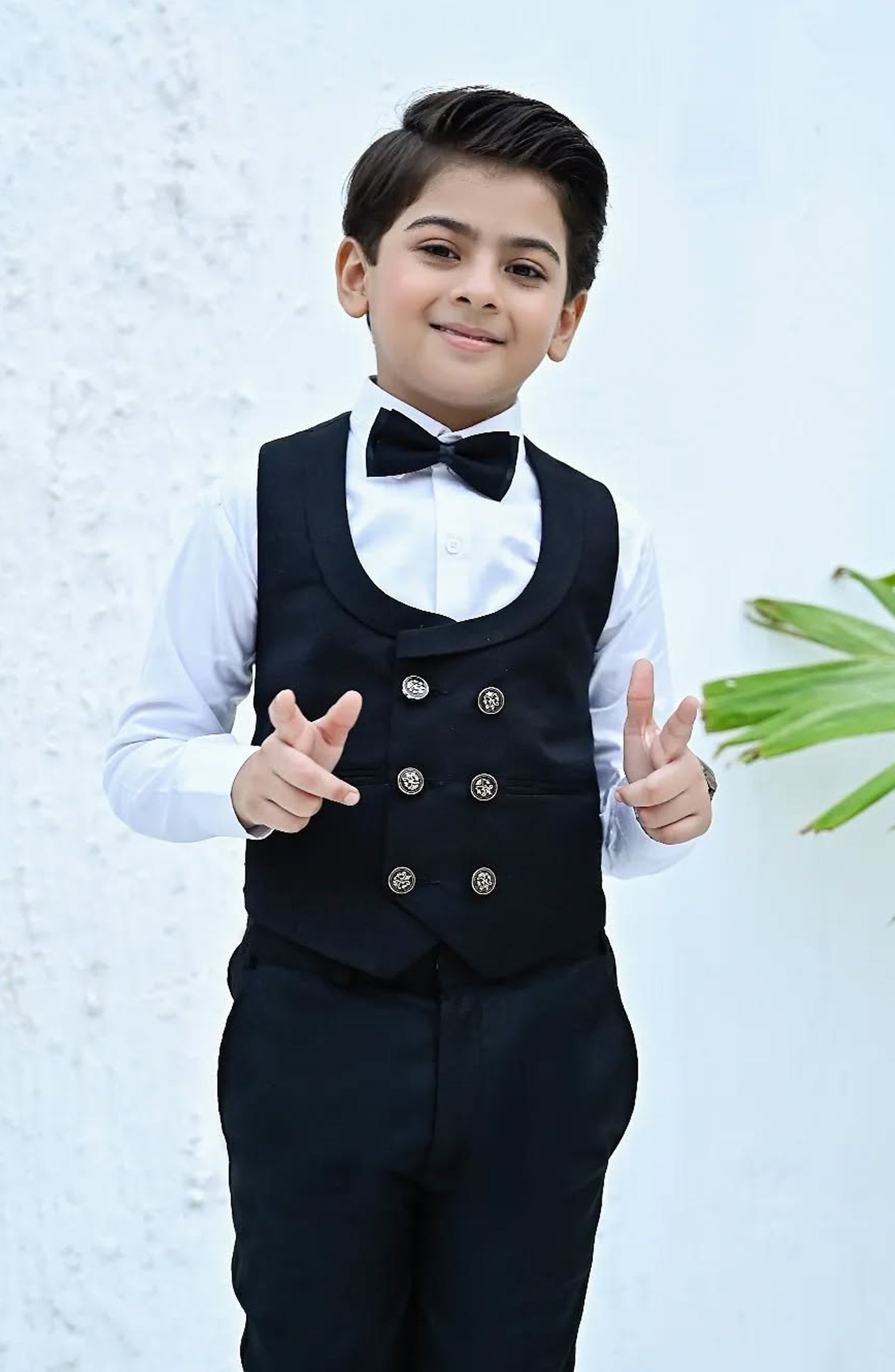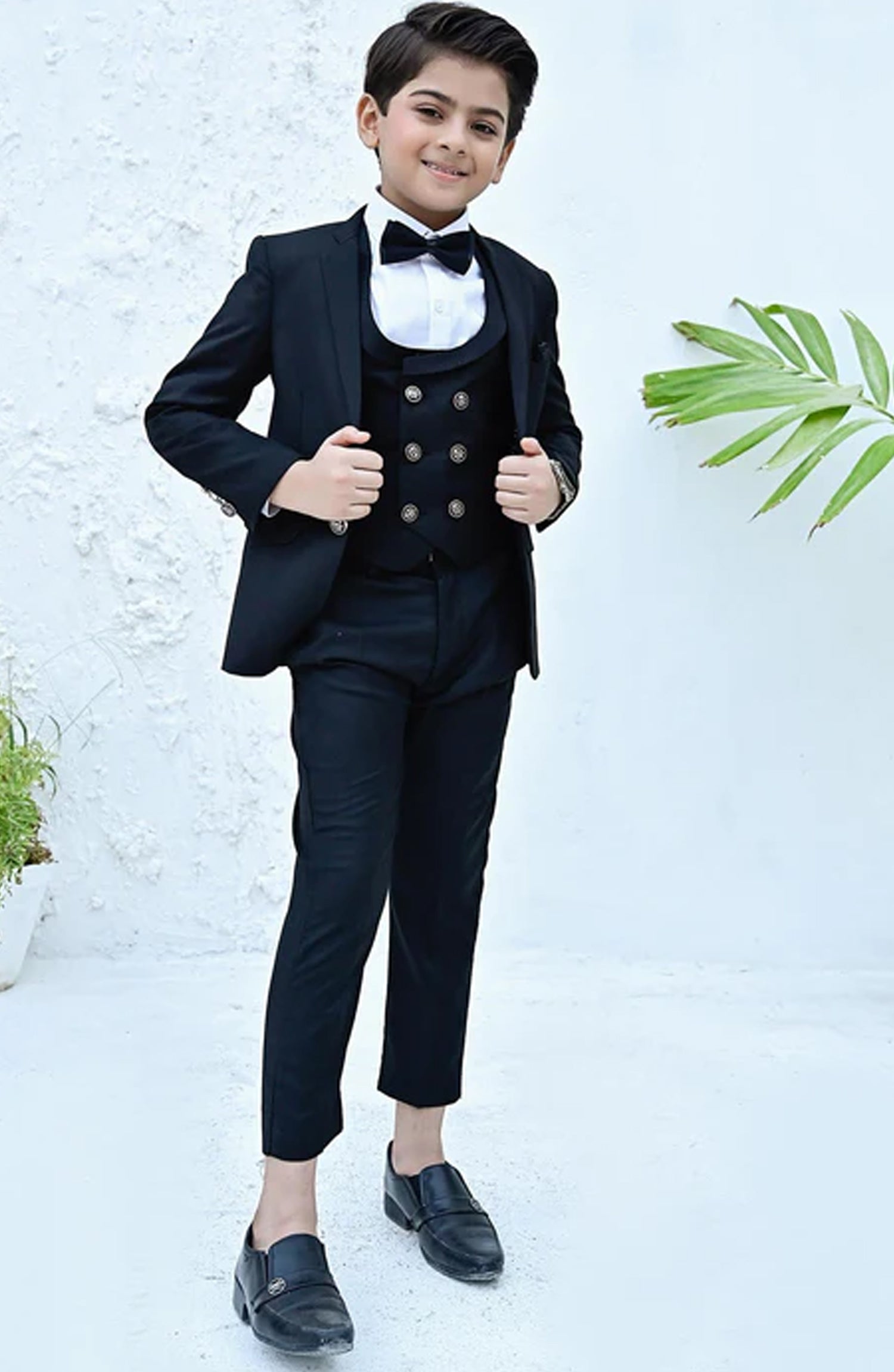 The suit features a sleek black coat with a tailored fit, giving you a polished and sophisticated look. The pants are perfectly matched, providing a clean and streamlined silhouette. The waistcoat adds an extra touch of style, with its matching black fabric and button detailing. The bow completes the ensemble, adding a touch of elegance and charm.Its a classic and timeless outfit that exudes confidence and class.