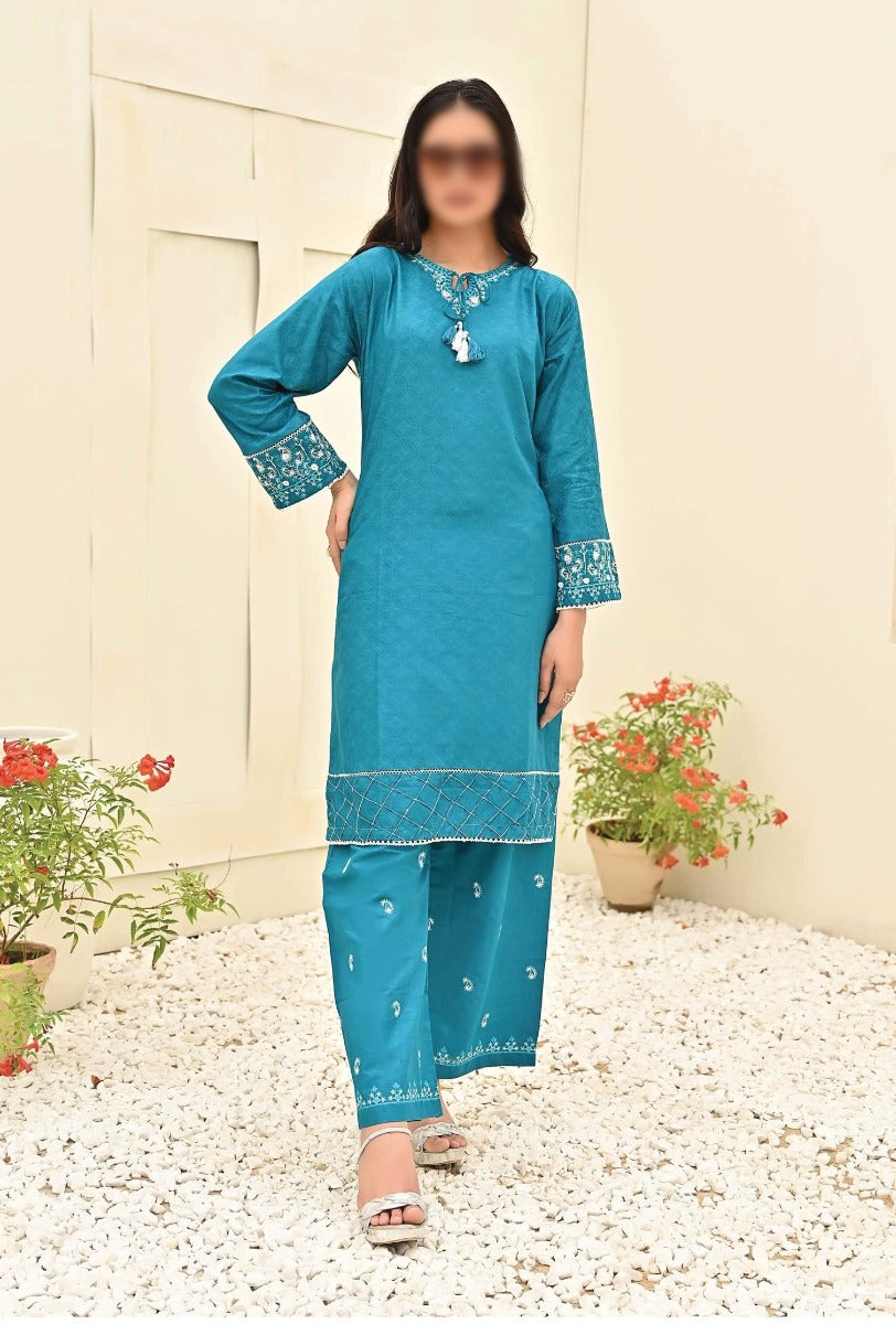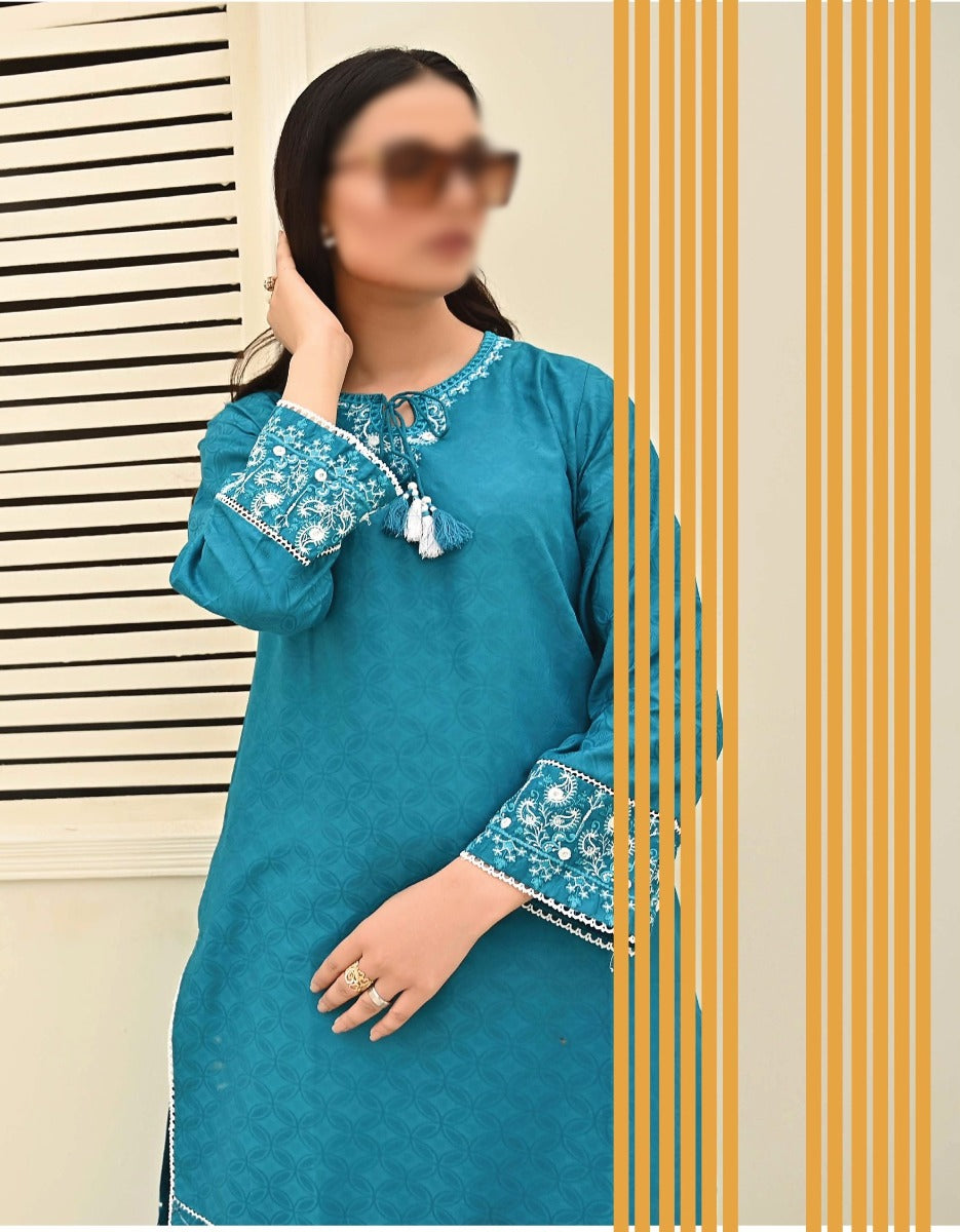 Self Jacquard stitched Lawn shirt with block print and Embellishments