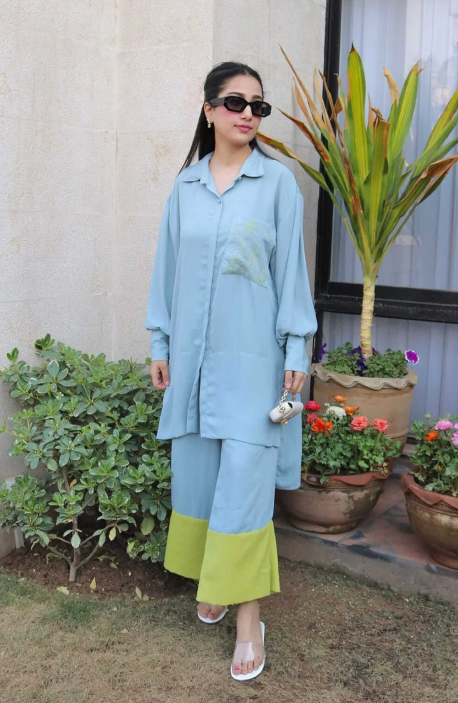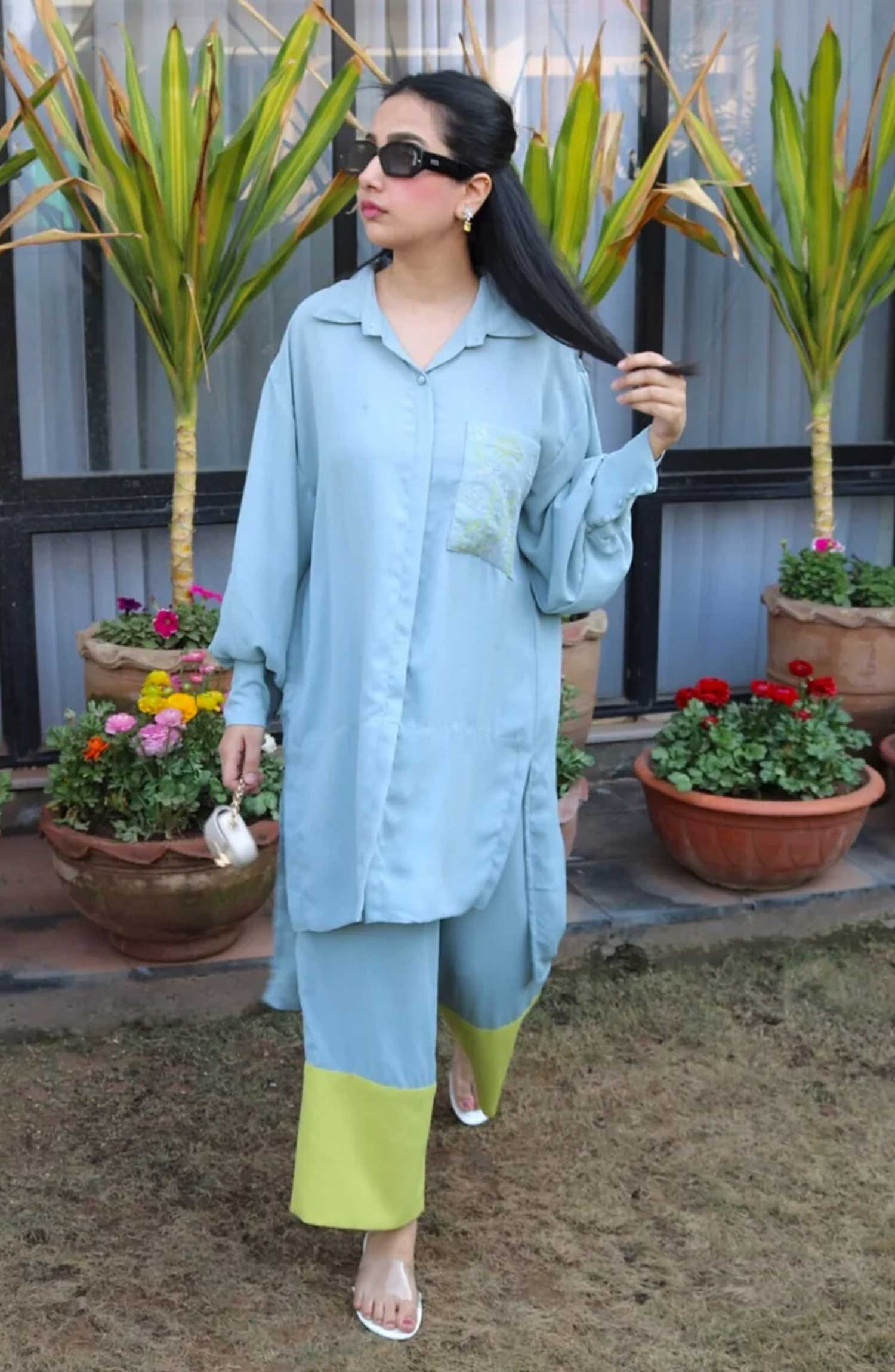 THIS CHICK BABY BLUE CO-ORD GRIP SET HAS CHIC CUT WITH EMBROIDERED POCKETS AND BACK YOLK.