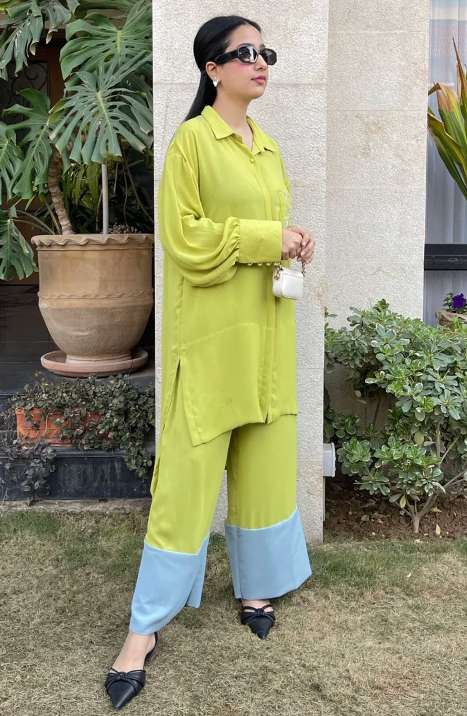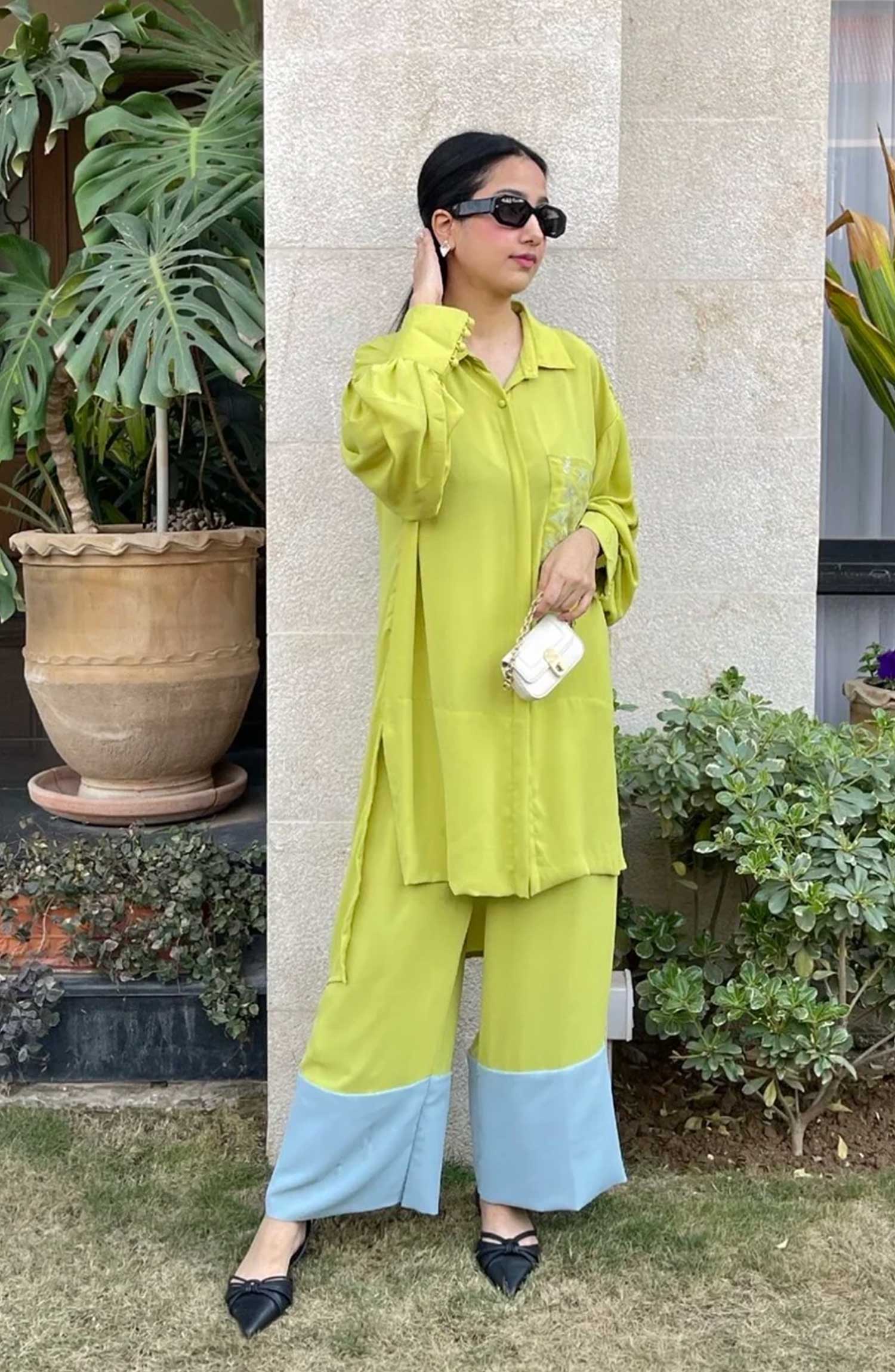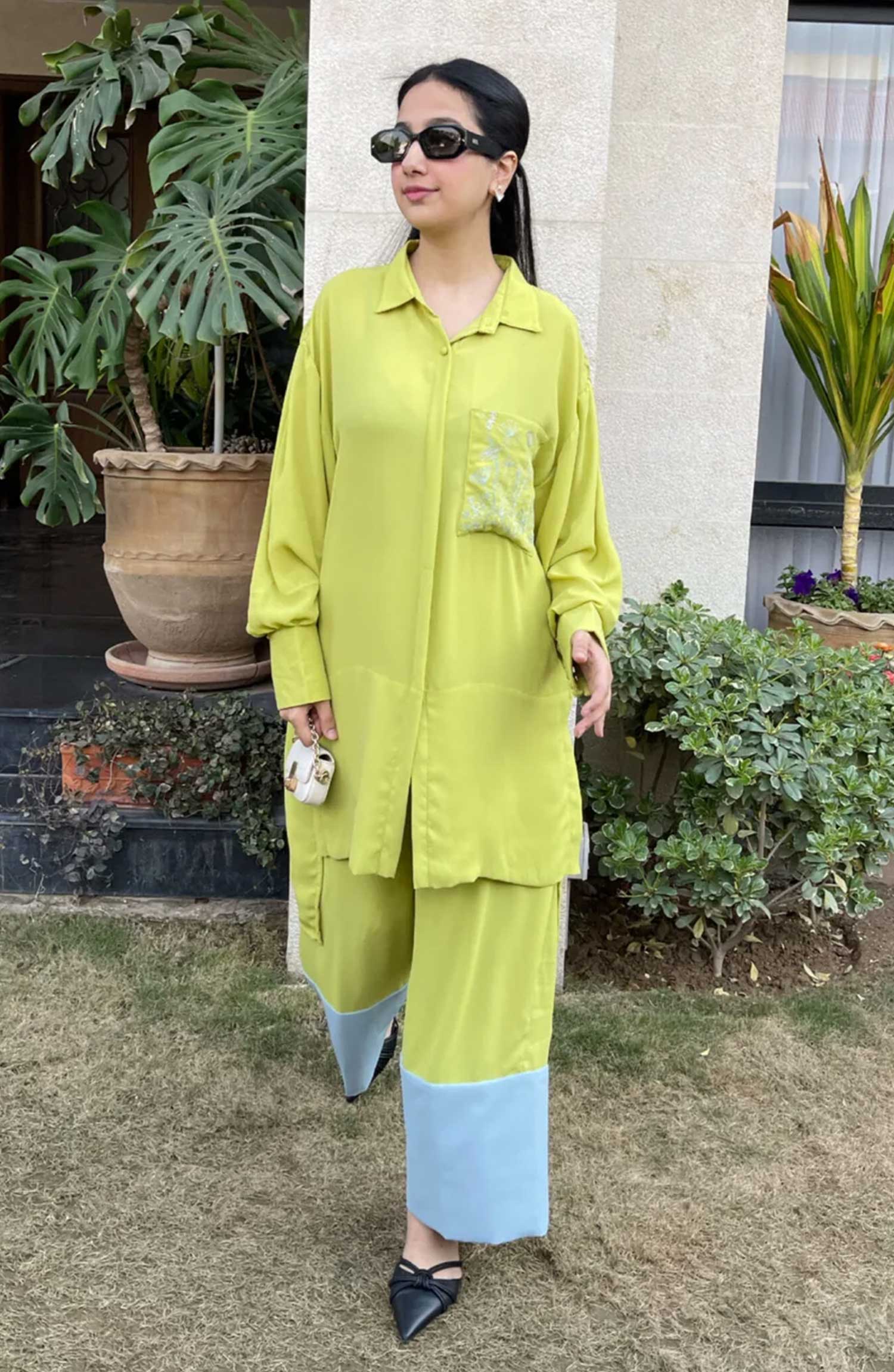 THIS CHICK lime CO-ORD GRIP SET HAS CHIC CUT WITH EMBROIDERED POCKETS AND BACK YOLK.