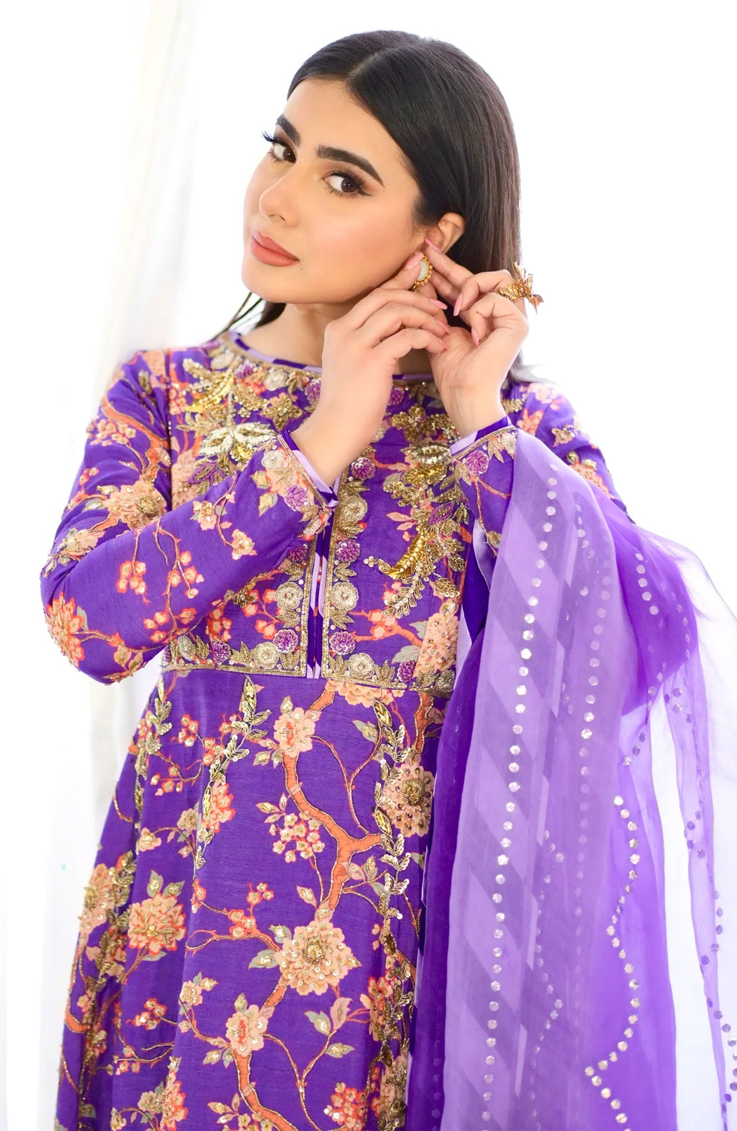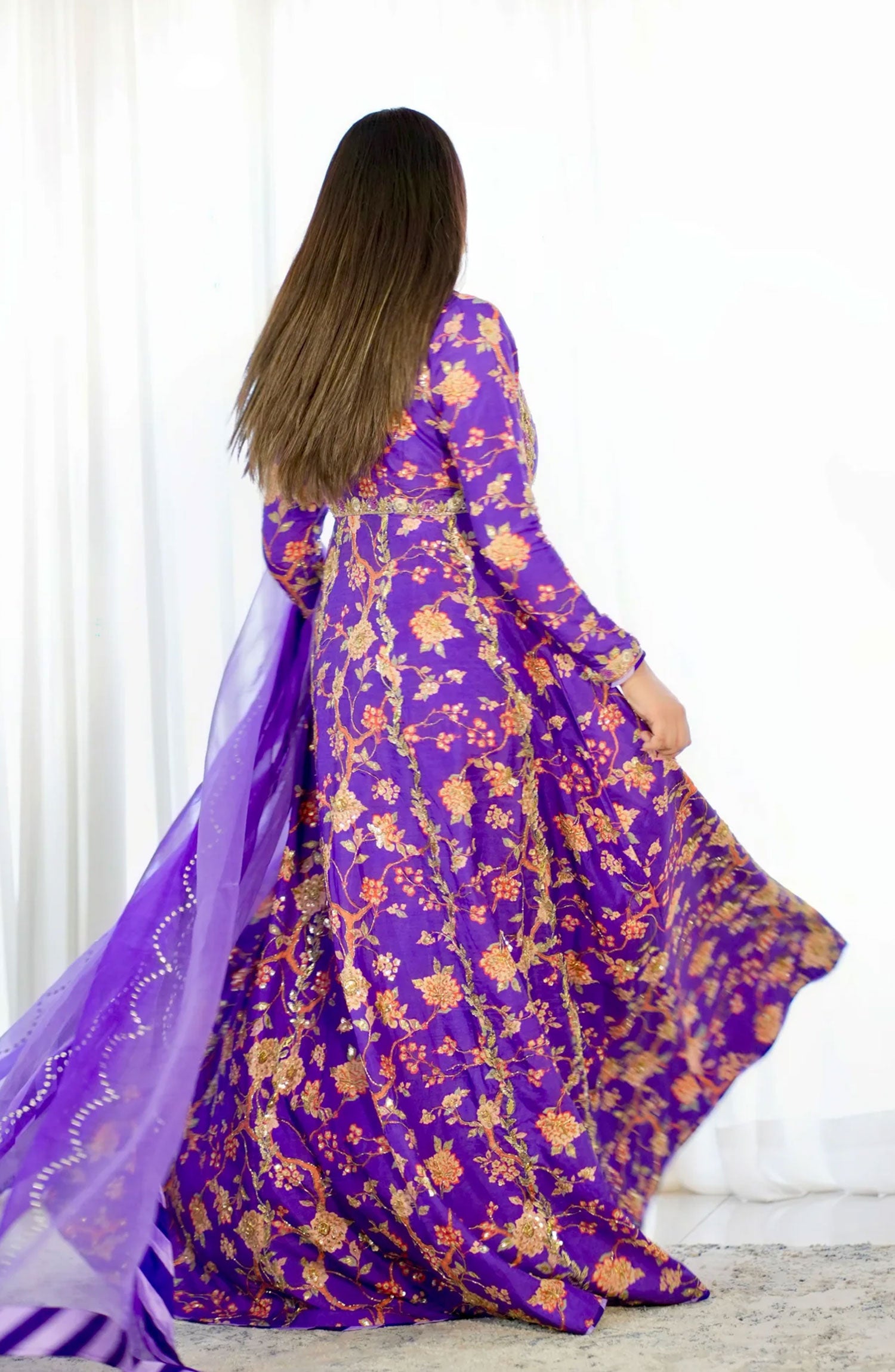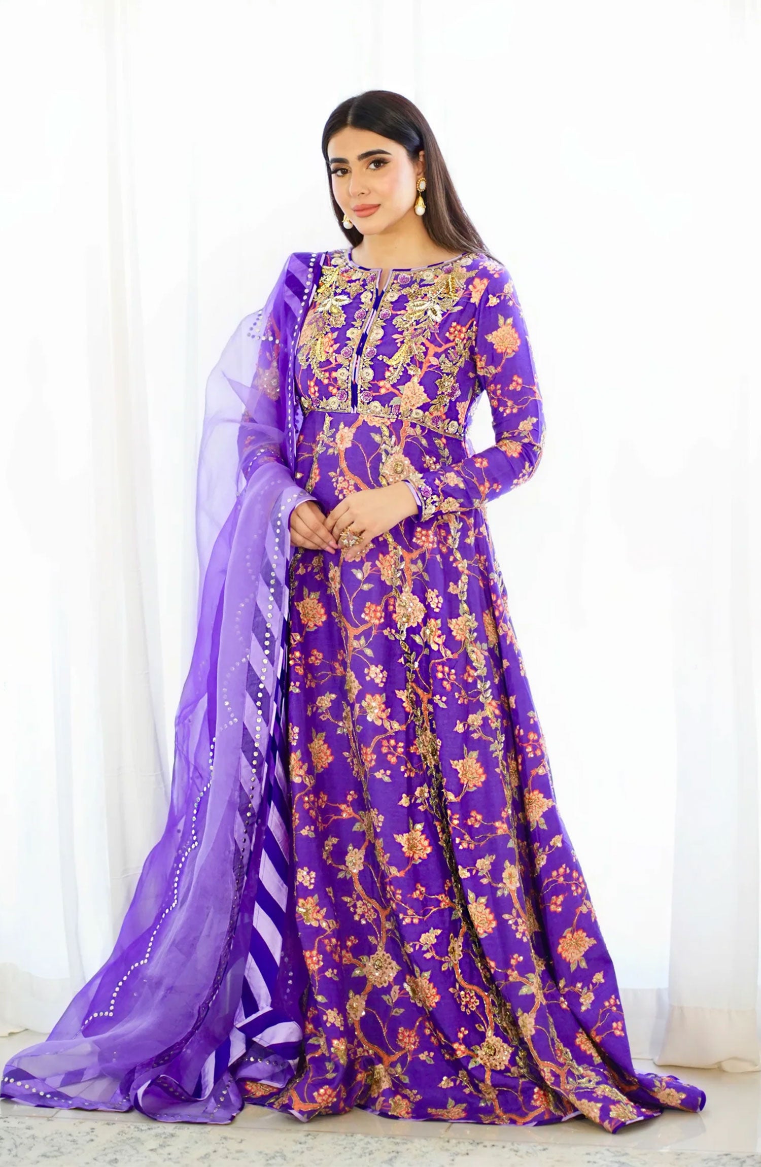 This floral printed pishwas has heavily hand worked with mukaish,resham and zardozi all over the pishwas. We have paired this with pure organza Kamdani worked two tone dupatta and straight pants.