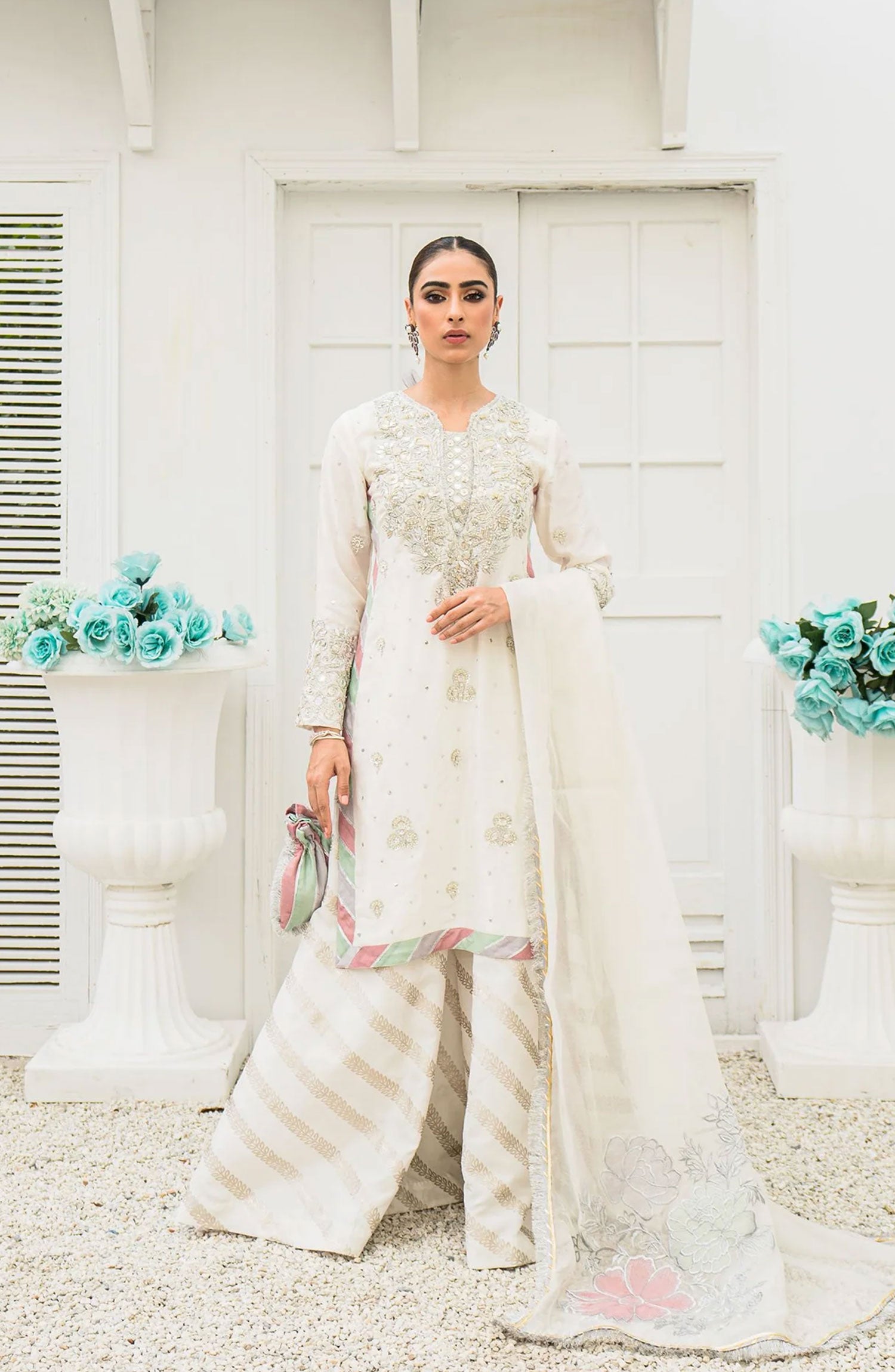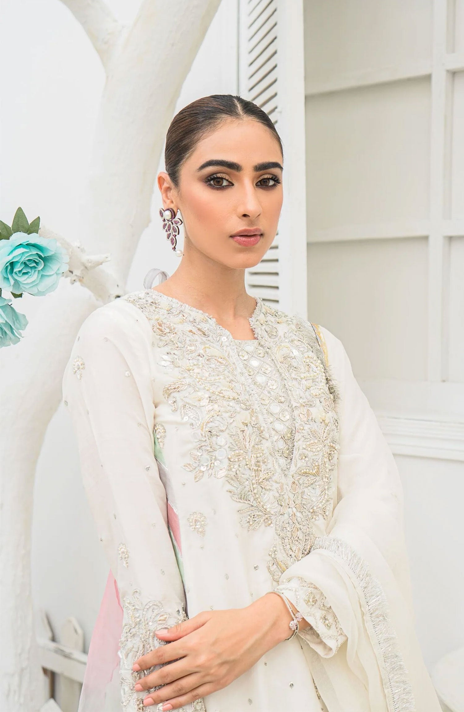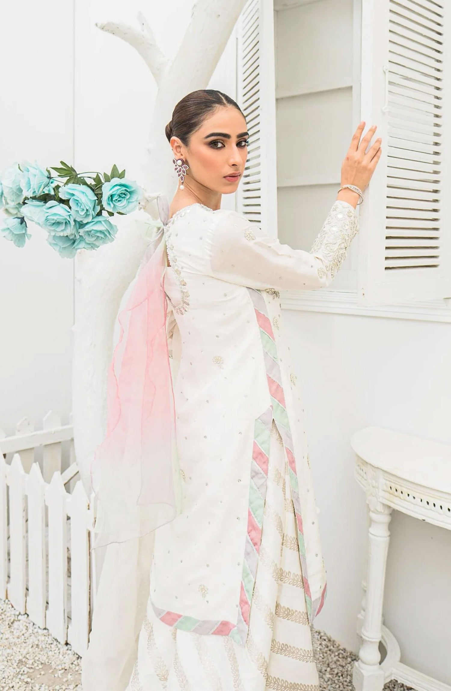 Rania white is the favourite one all made with love. A blend of traditional silver dabka naqshi GOTA and Sheesha work on neckline and motives on front is used with flawless techniques, the side seam and hemline is done with pastel hues of chattapatti which creates more power to the ensemble. Bringing the sexy back with a traditional way a round sheesha worked back cut tying up with ombre organza. We have paired this with a fused silver block painted sharara and intricate applique worked organza dupatta.