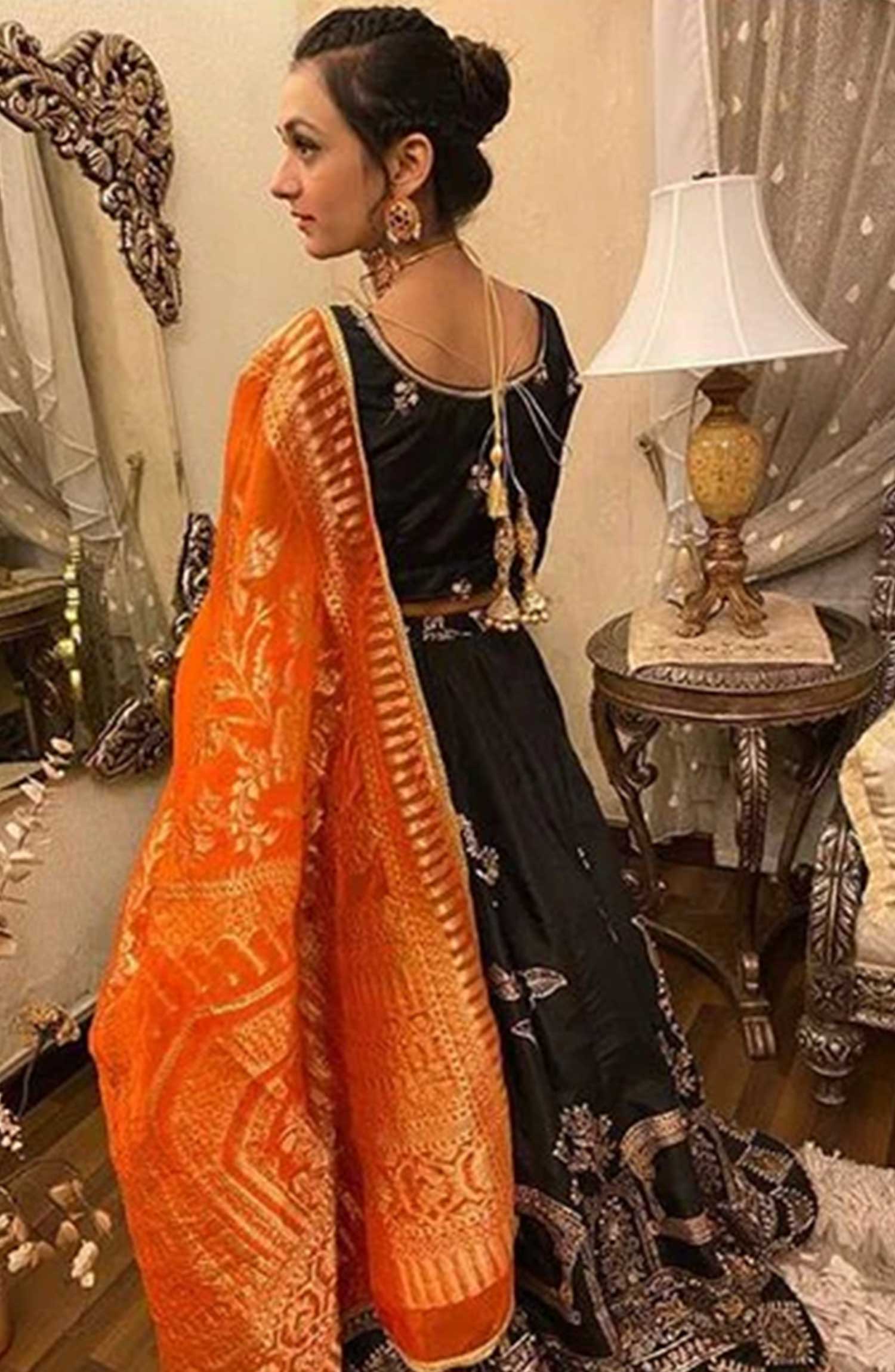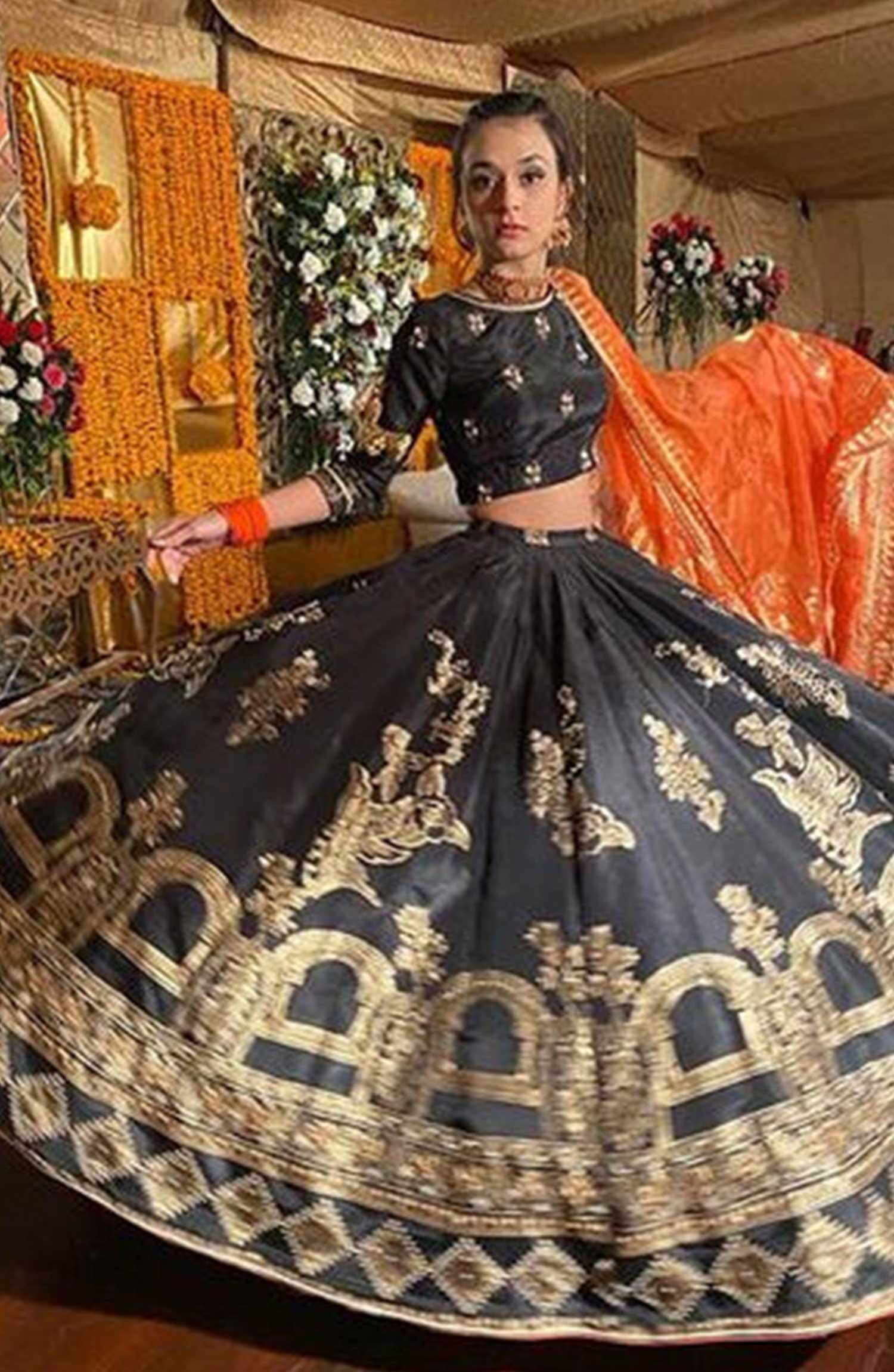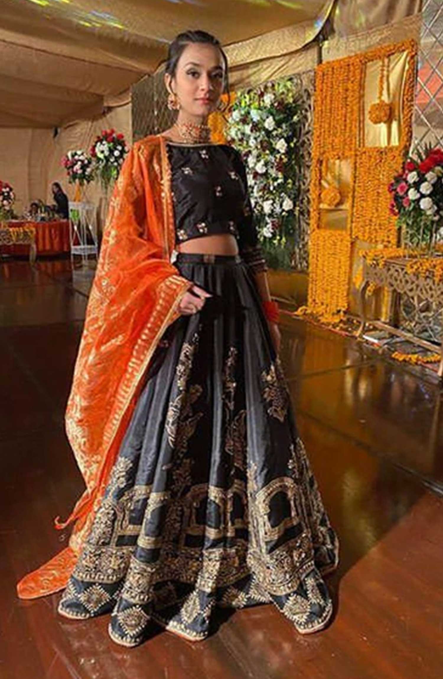 BLACK LEHNGA CHOLI IS DONE ON INDIAN RAWSILK THE BLOUSE AND CHOLI HAS BEEN WORKED WITH BLOCK PRINTING AND ADDA TOUCHING PAIRING UP WITH A CONTRASTING TANGERINE DUPATTA.
