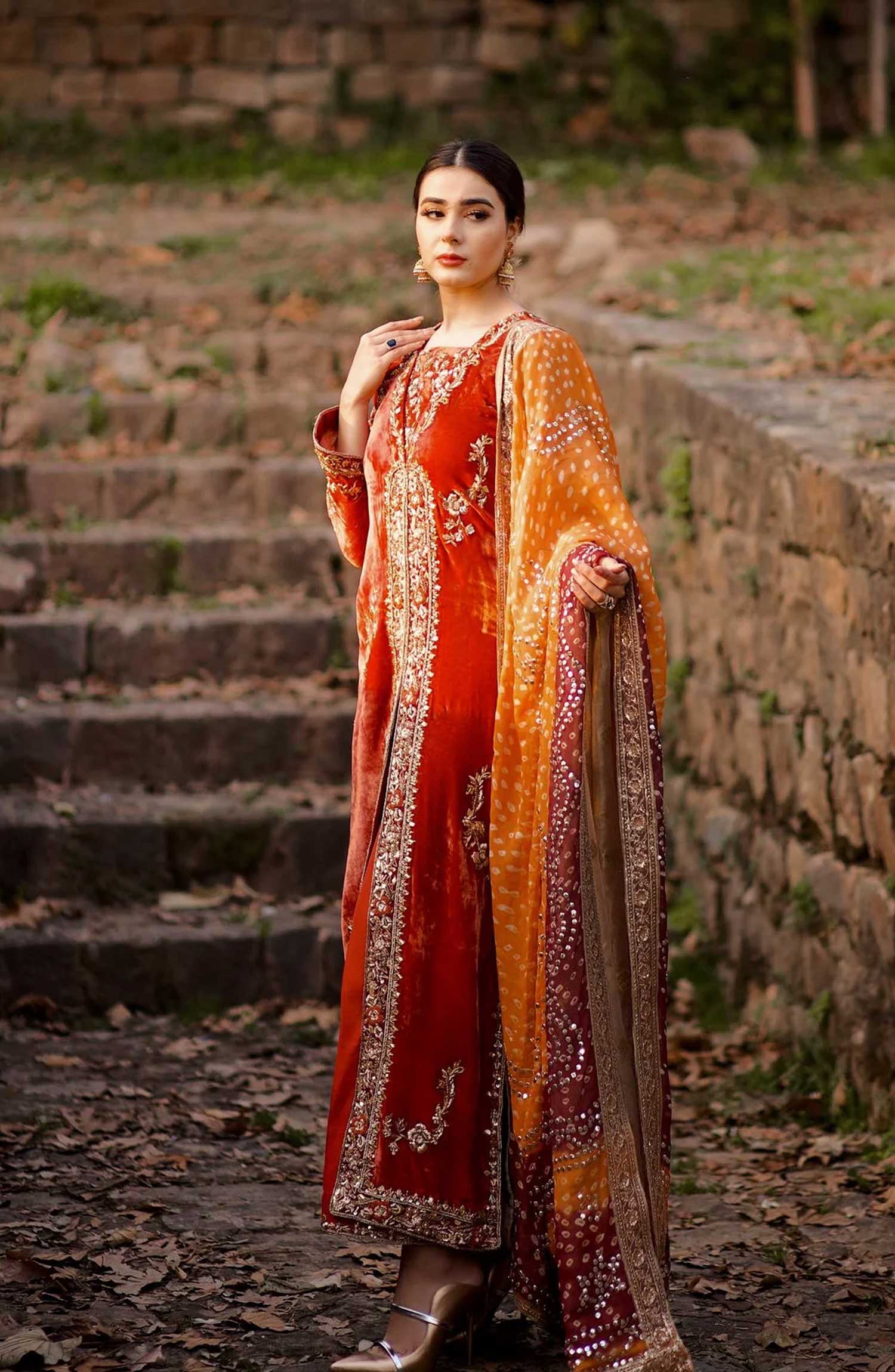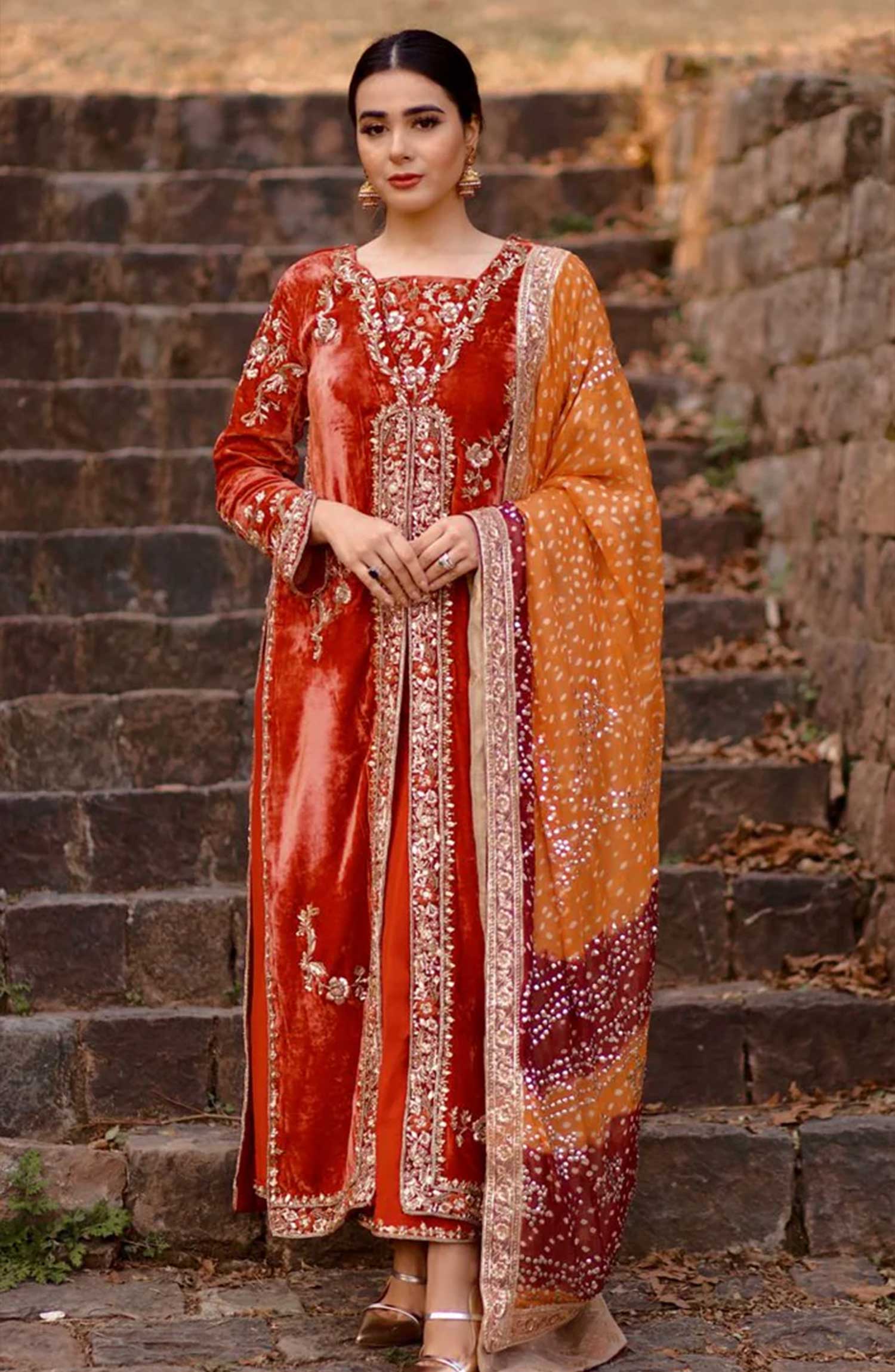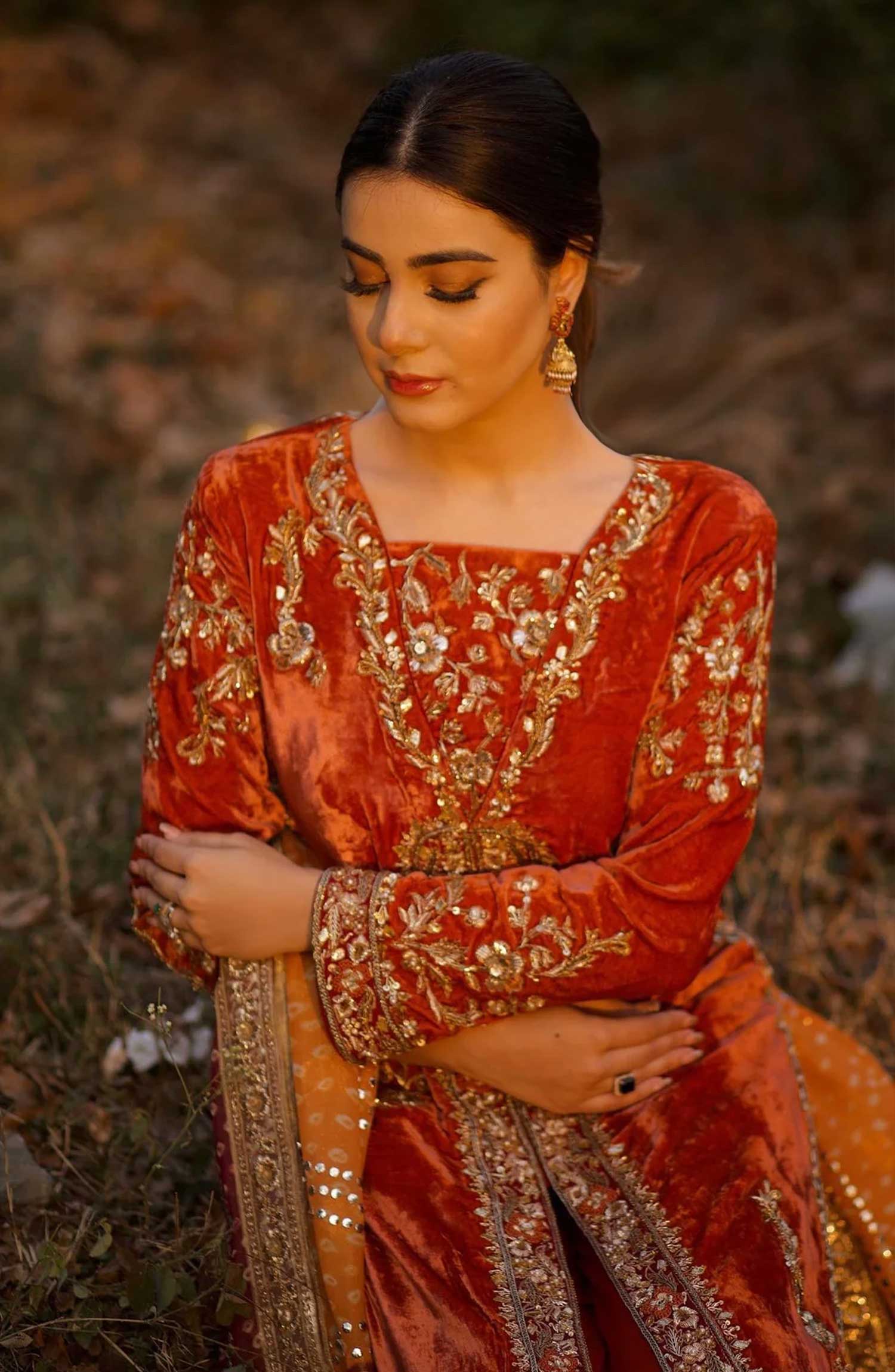 Rafya looks breathtaking gorgeous in our french dynasti rust velvet formal outfit is all worked with zardozi,kamdani,thread knots and crystals on a front open cut outfit paired with culottes and a kamdani chunri chaddar.