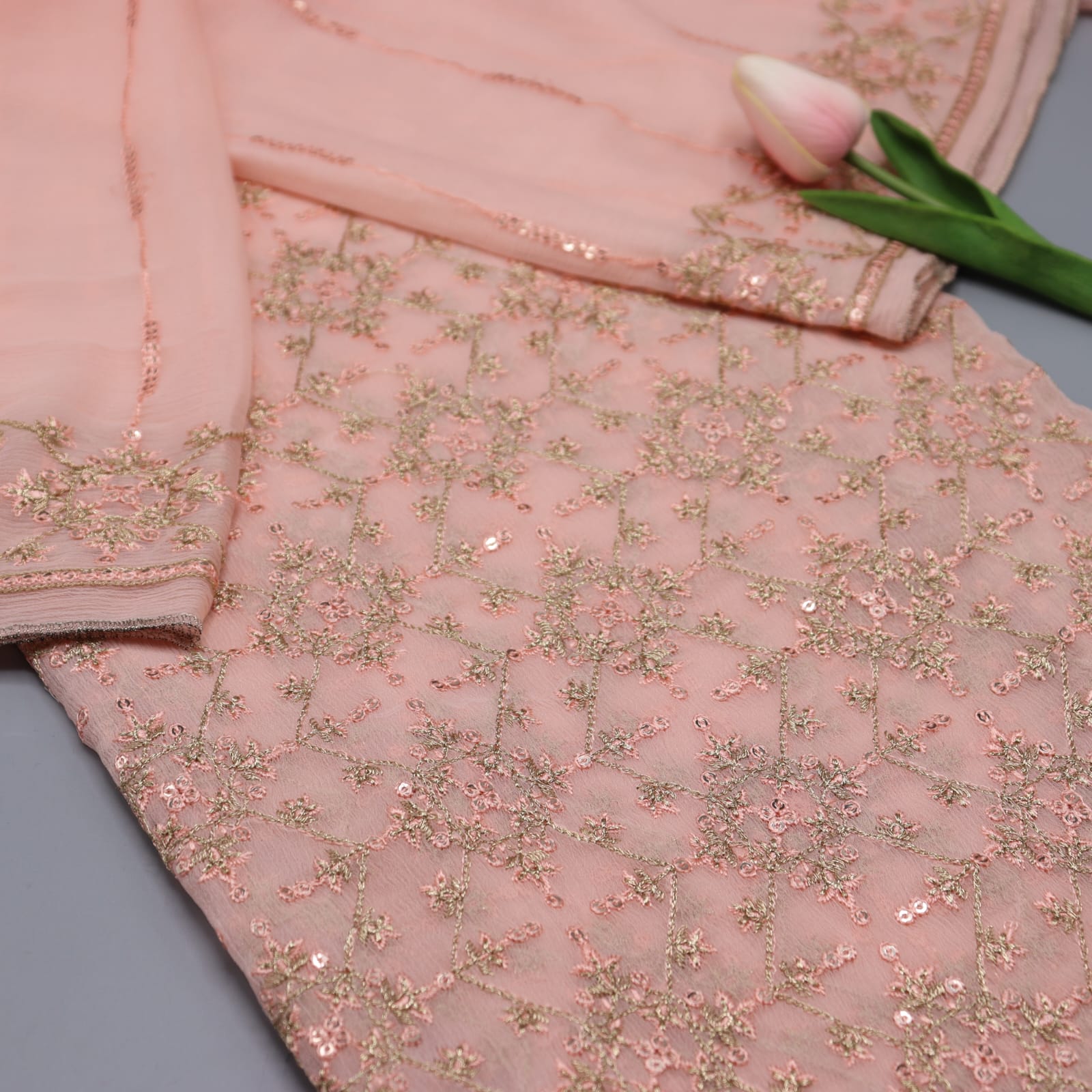 Humdum Unstitched Exclusive Embroidered Crinkle Chiffon Collection 2023 has been styled in the image for photography and illustrative purposes.