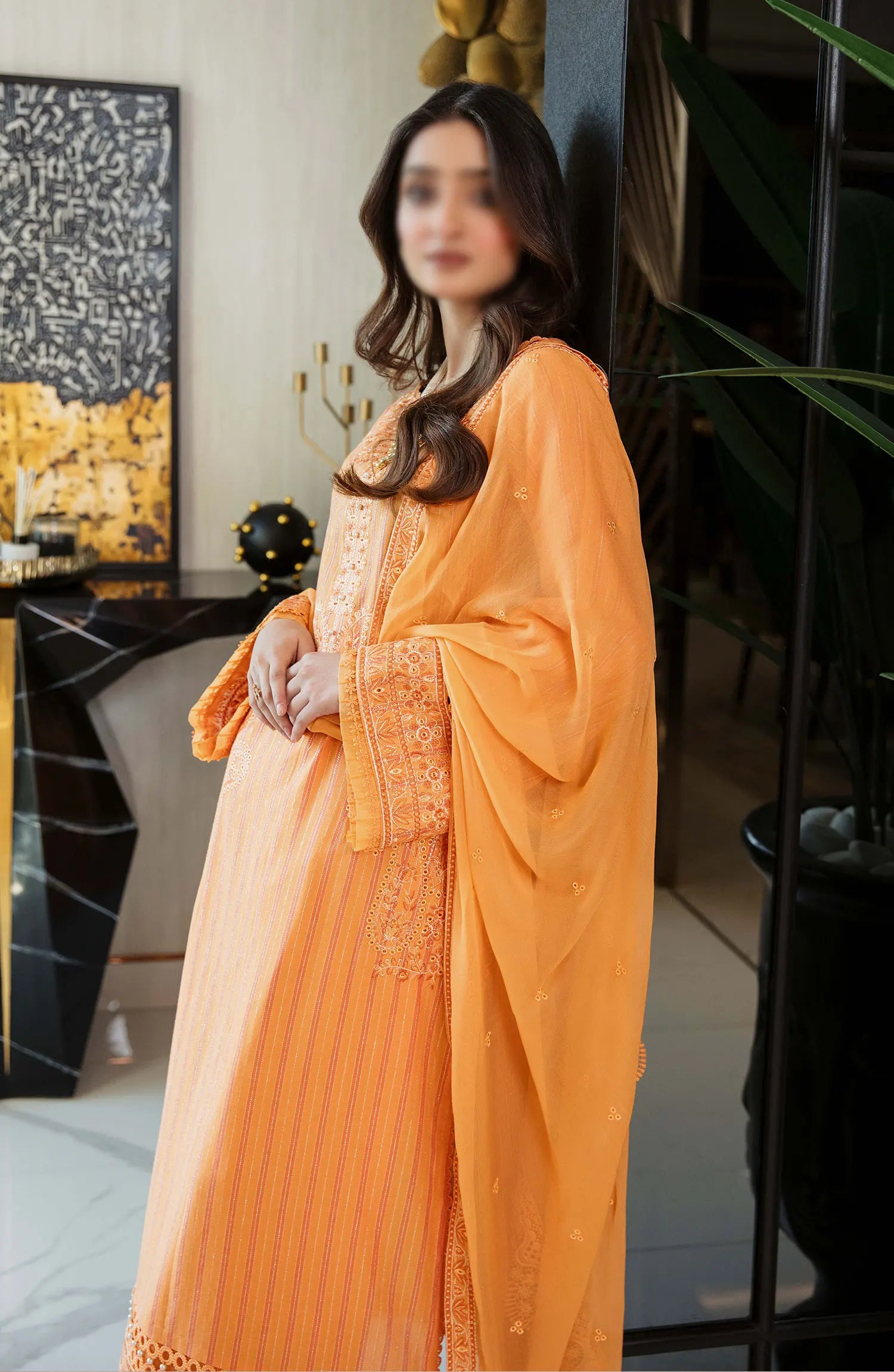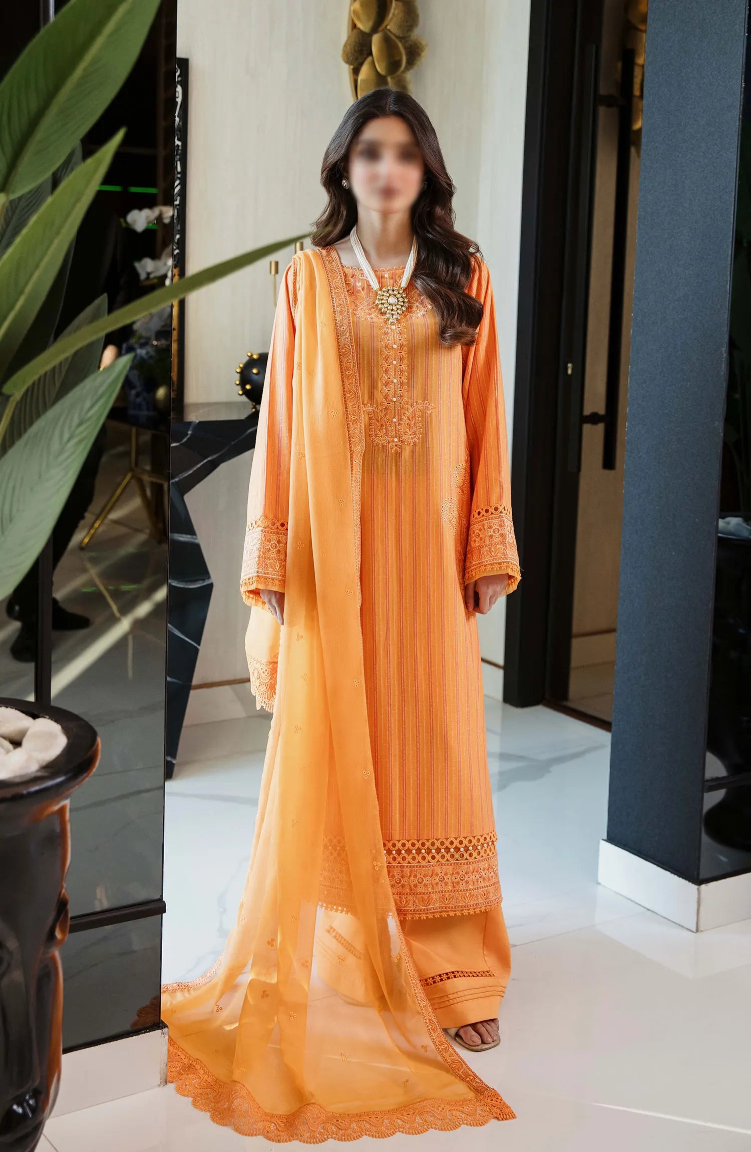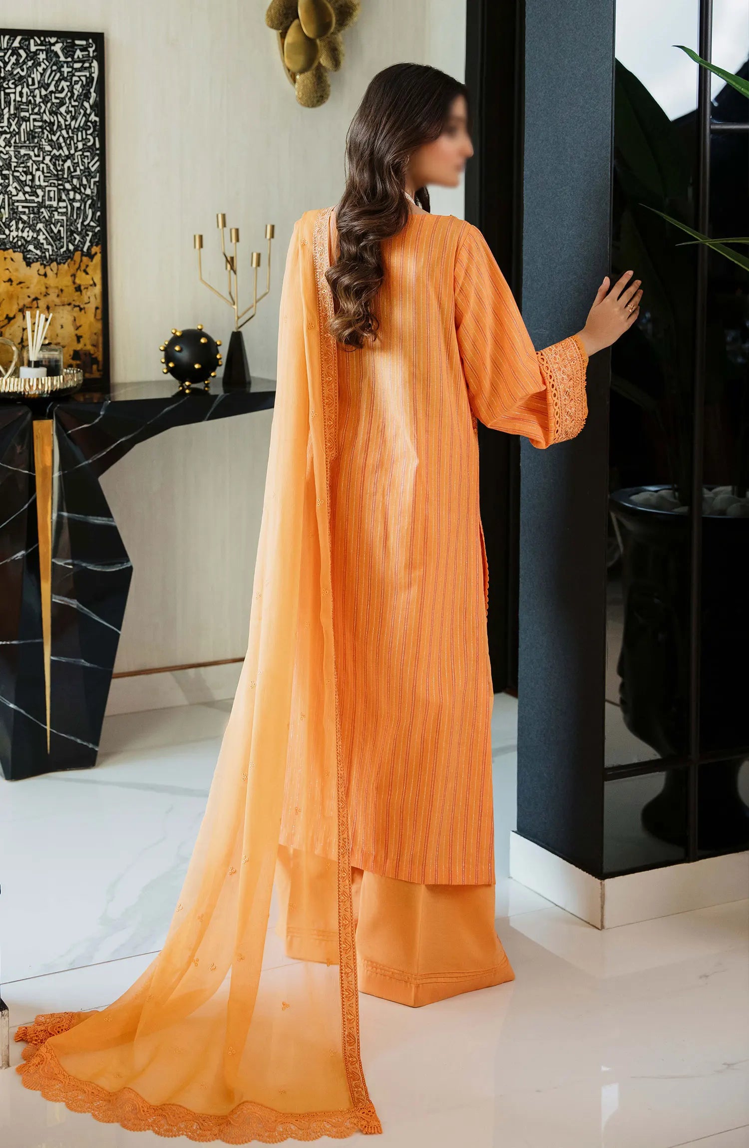 The standard style comes as a long-sleeved kameez with dupatta and trouser/shalwar.
