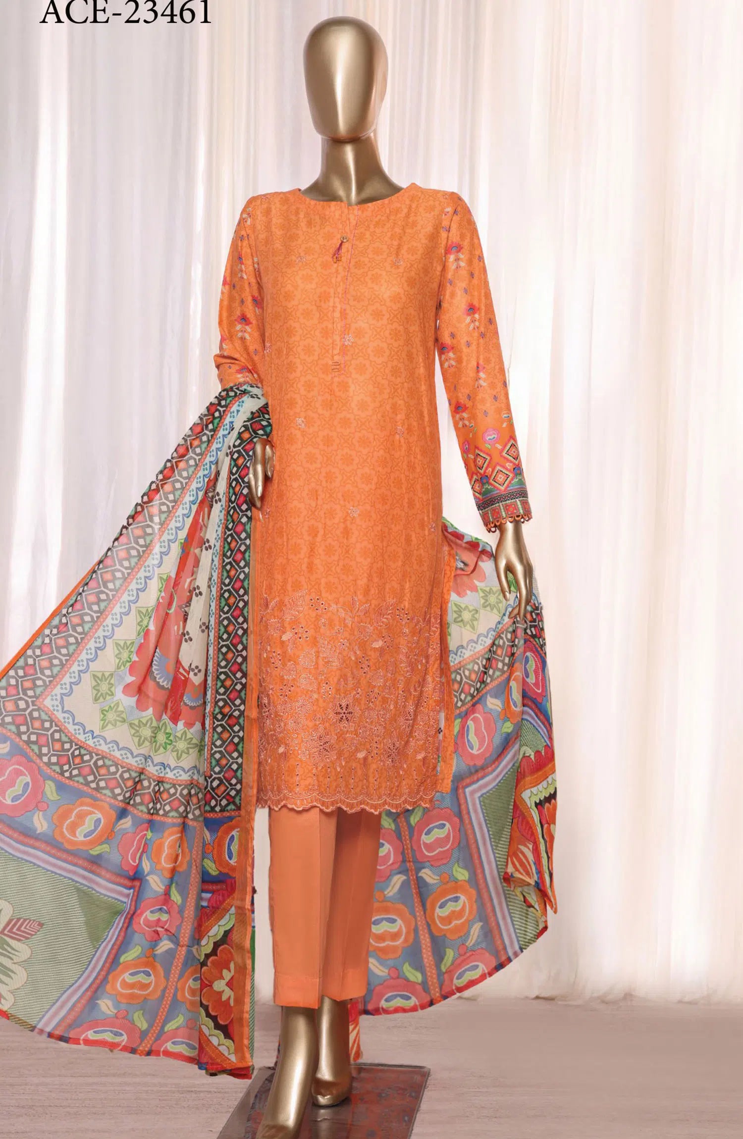 The standard style comes as a long-sleeved kameez with dupatta and trouser/shawlar.