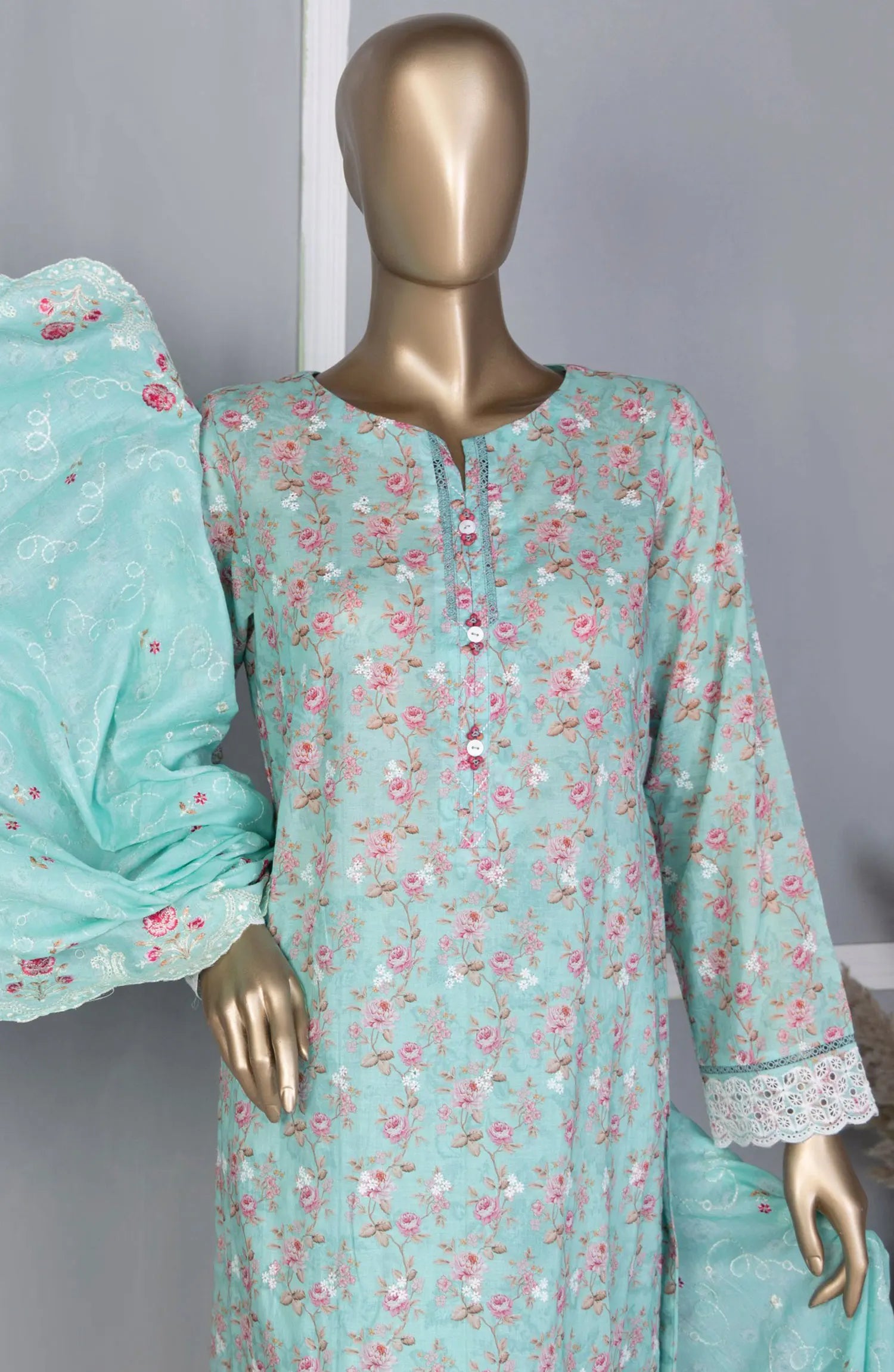 Premium Digital Printed Heavy Chikankari Embroidered Front.