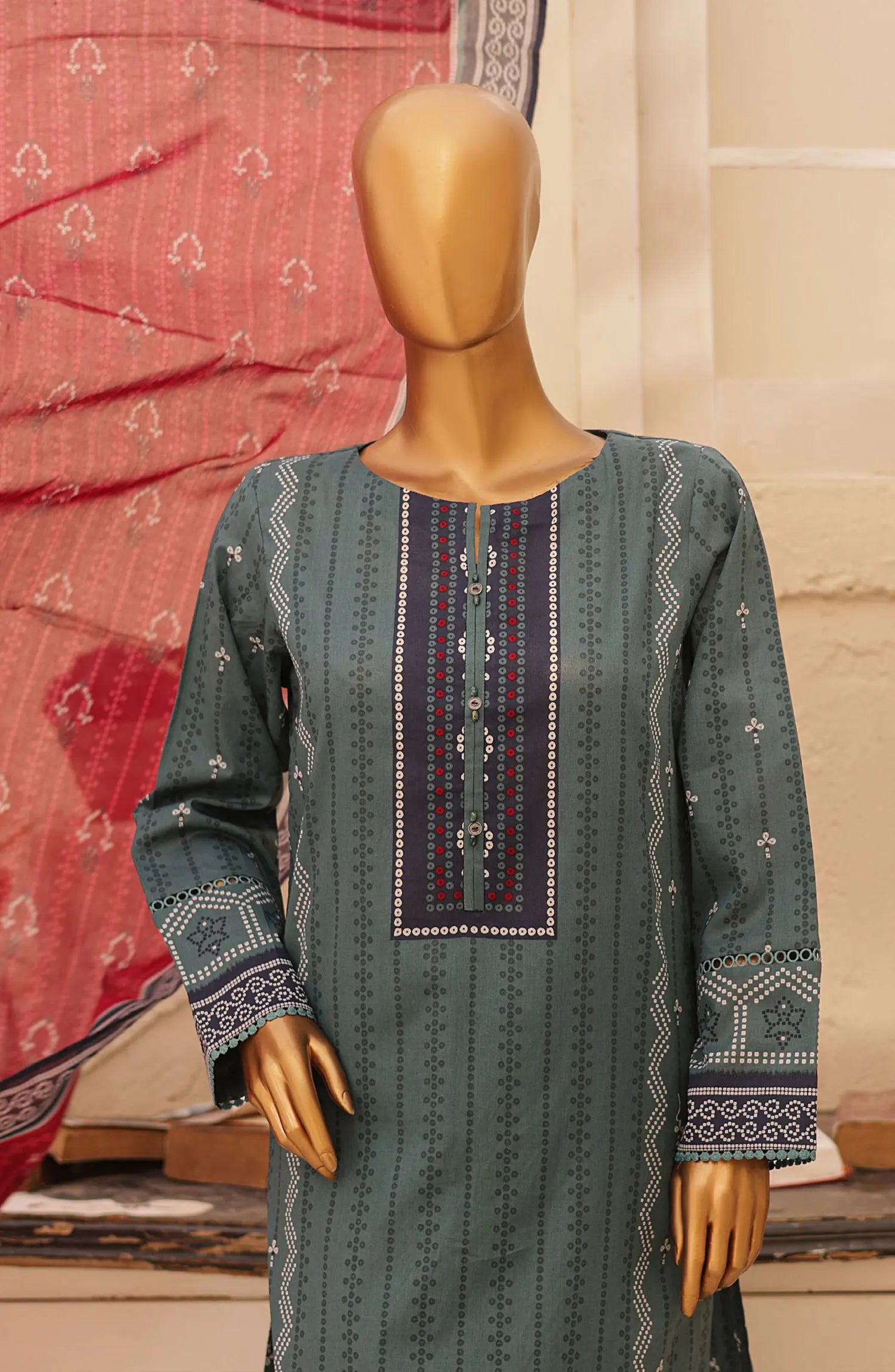 The standard style comes as a long-sleeved kameez with dupatta and trouser/shawlar.