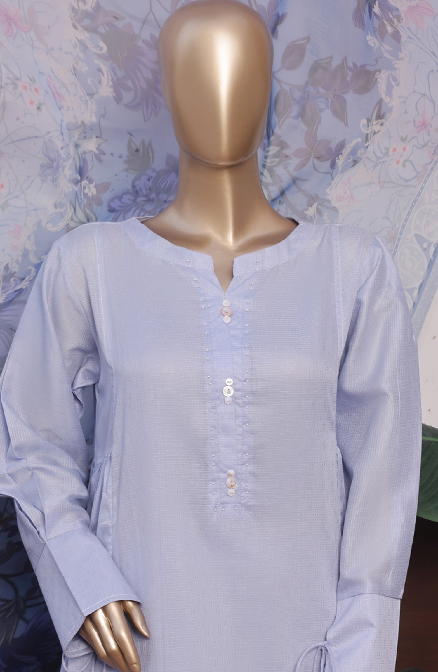Printed Dobby Lawn Stitch Shirt with EmbellishmentsDyed Stitch TrouserPrinted Chiffon Dupatta